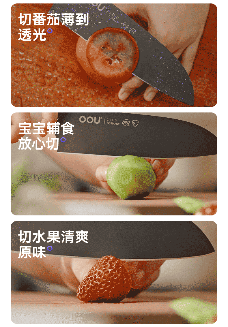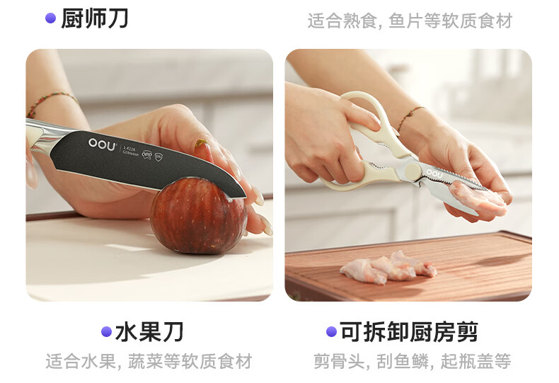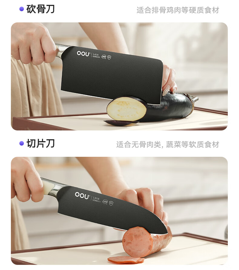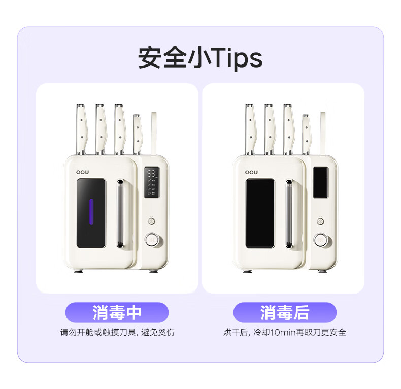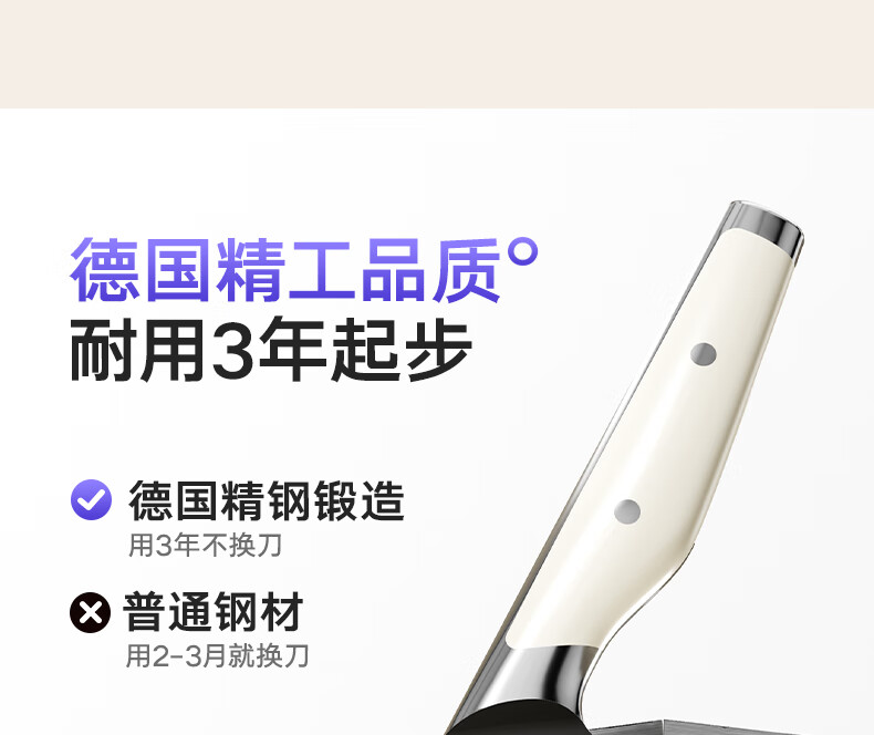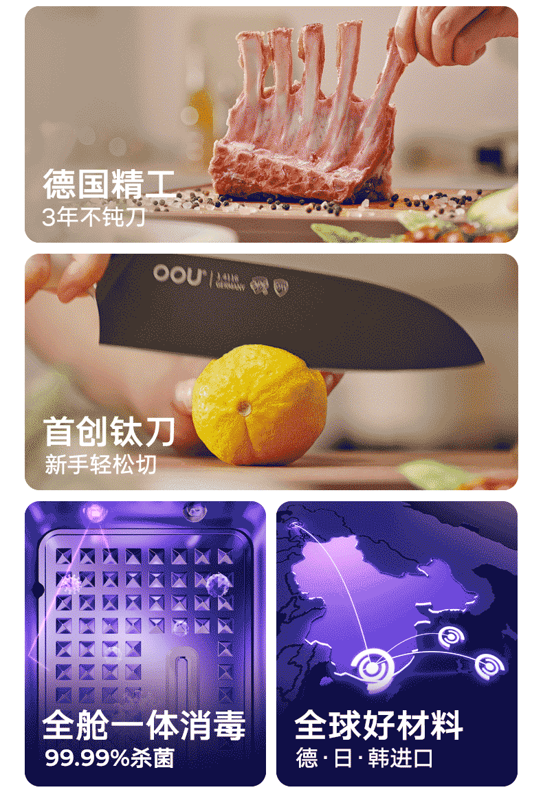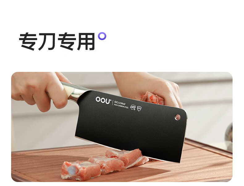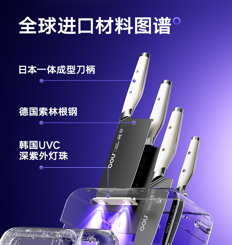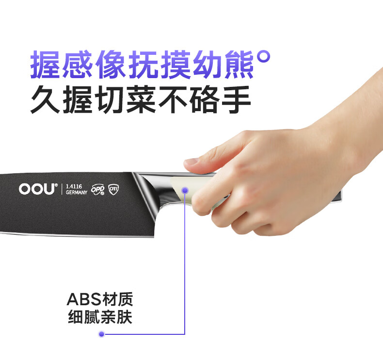 刀柄ABS材质,细腻贴合;刀座防潮防霉好清洗;专刀专用,生熟分切不串味