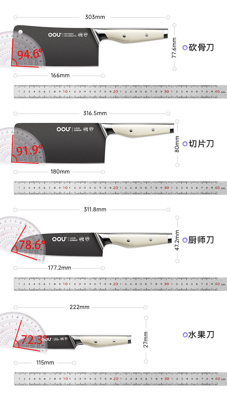 配置:砍骨刀、菜刀、厨师刀、水果刀、刀座、剪刀、磨刀器,筷子,瓜刨