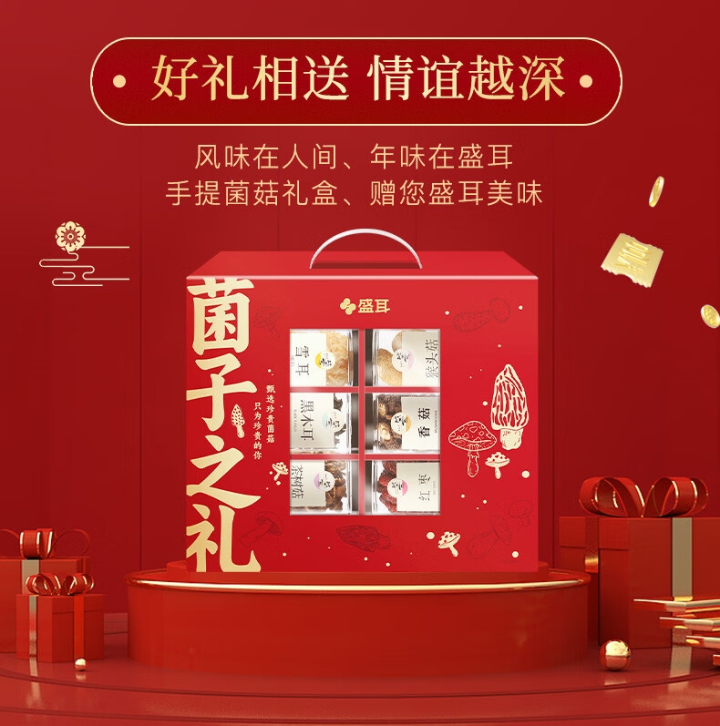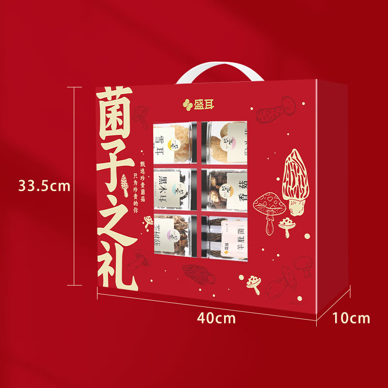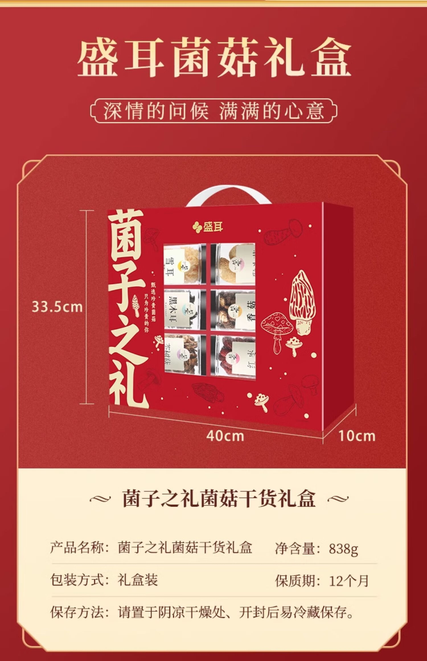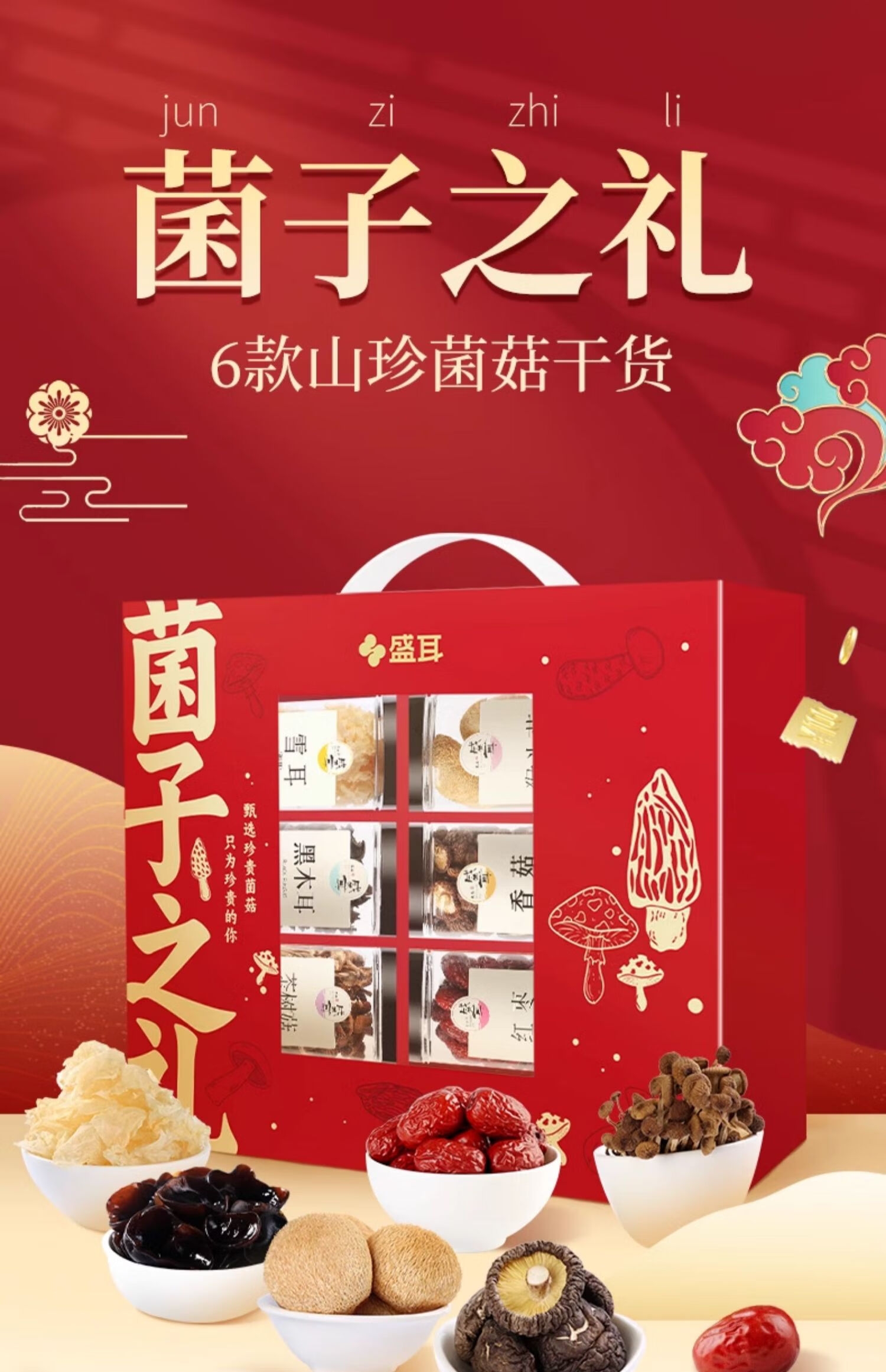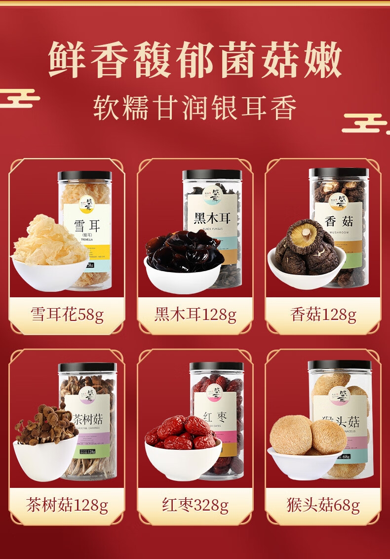 配置:雪耳花58g 黑木耳128g 香菇128g 茶树菇128g 红枣328g 猴头菇68g
