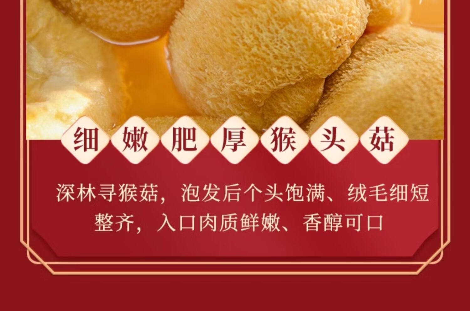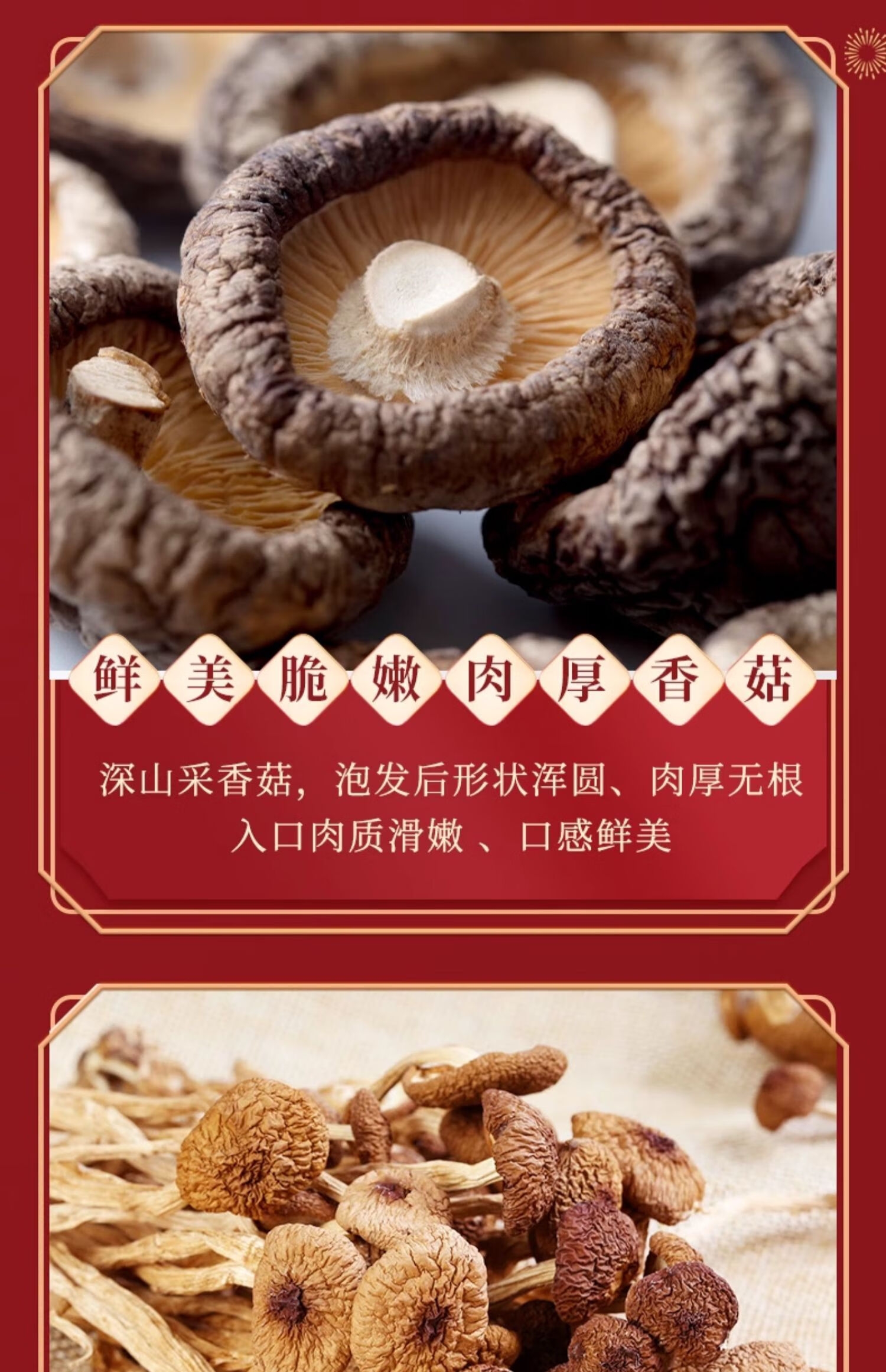 挑选饱满均匀的菌菇、精心搭配;口味醇甜、枣香浓浓;入口鲜香馥郁,脆而不硬