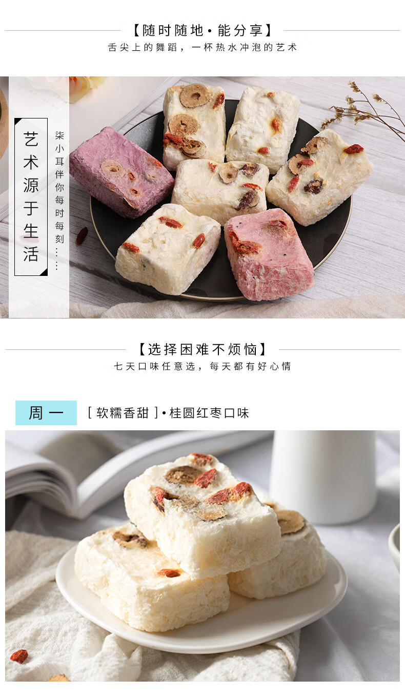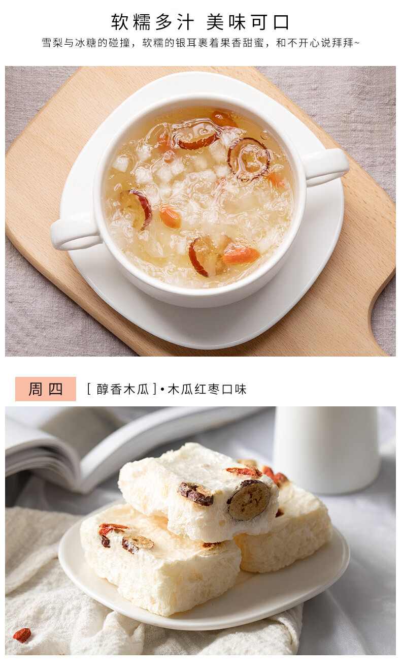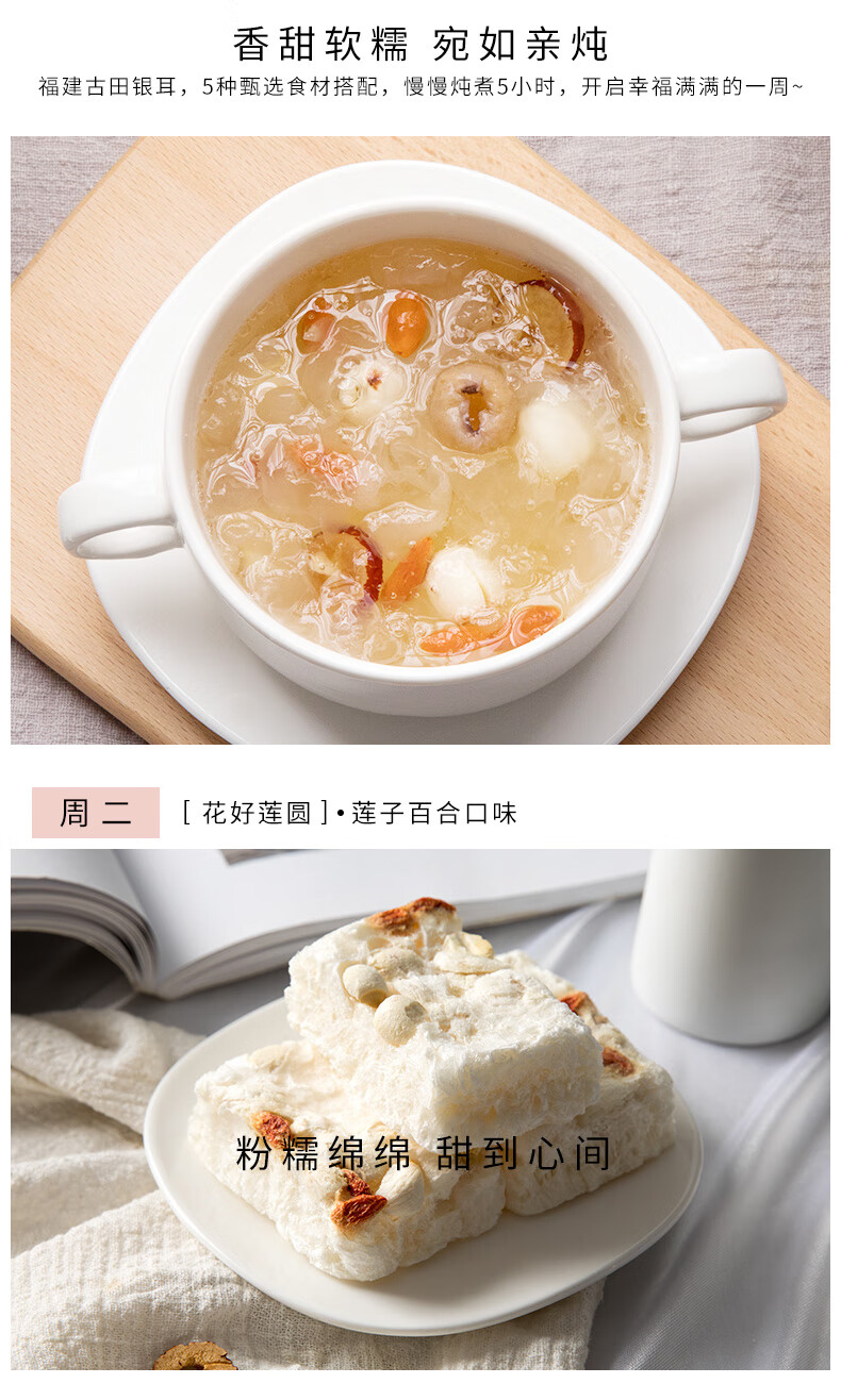 精挑细选的银耳;胶质丰富,软糯可口;冲泡即食,胶质浓浓
