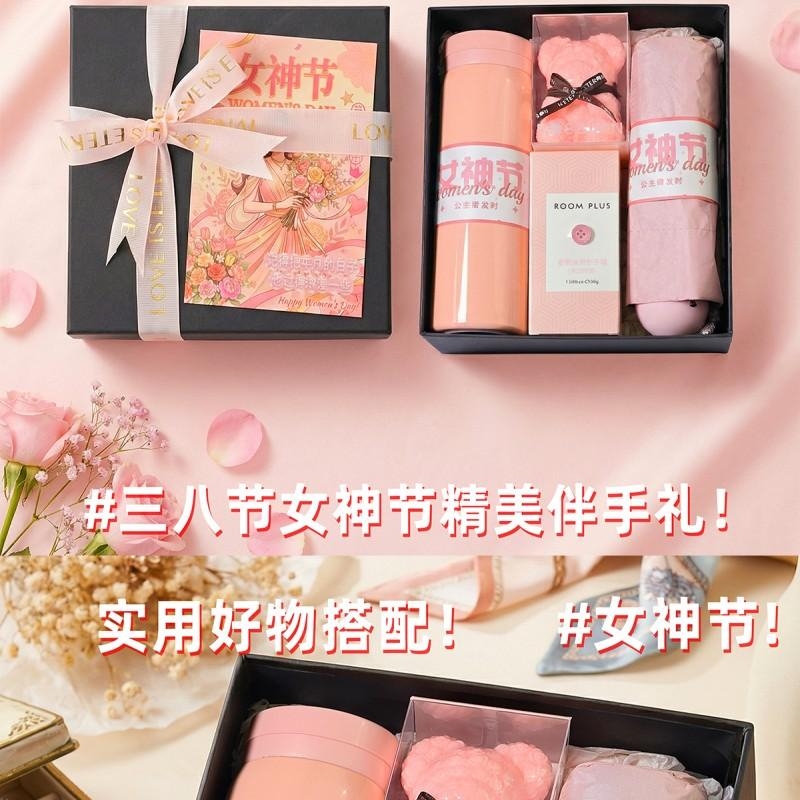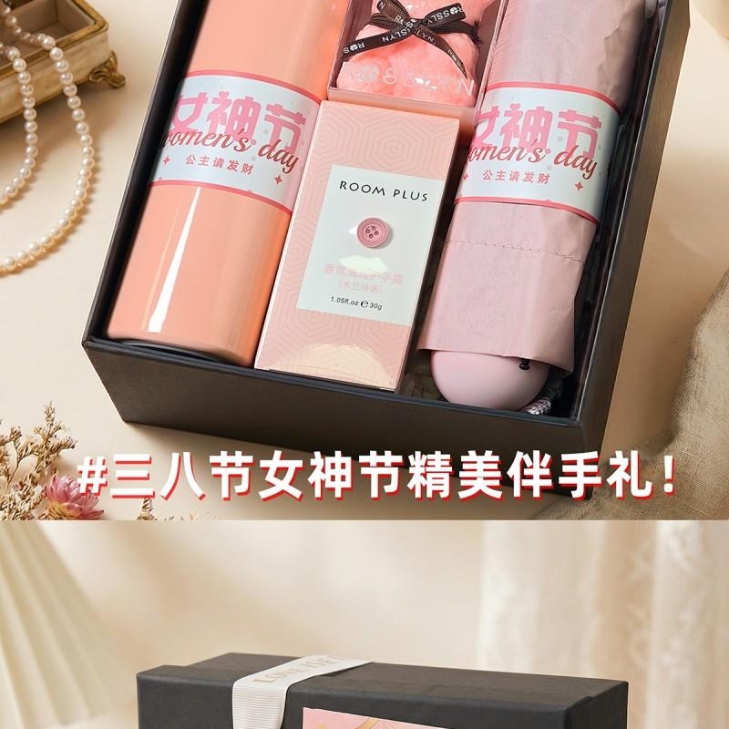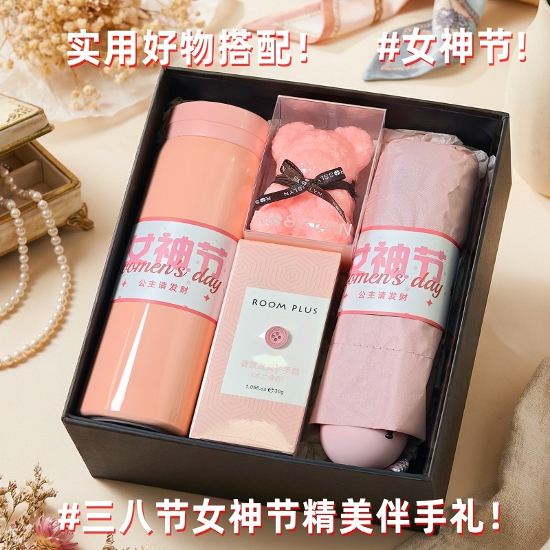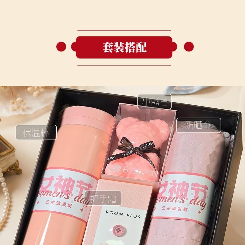 组合:女神节胶囊防晒伞*1、女神节保温杯300ML*1、小熊玫瑰香氛皂100g*1、ROOM PIUS护手霜30g*1