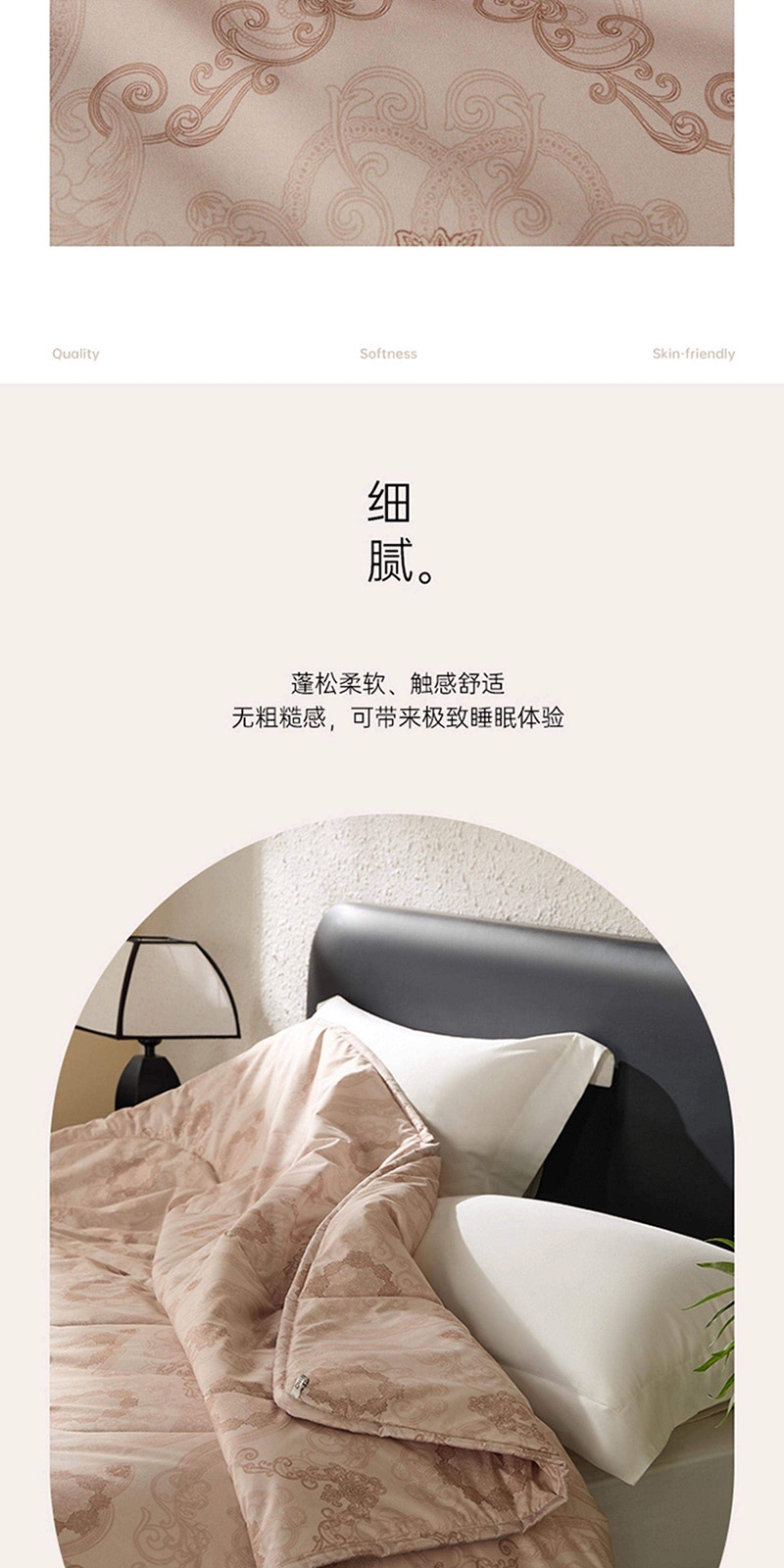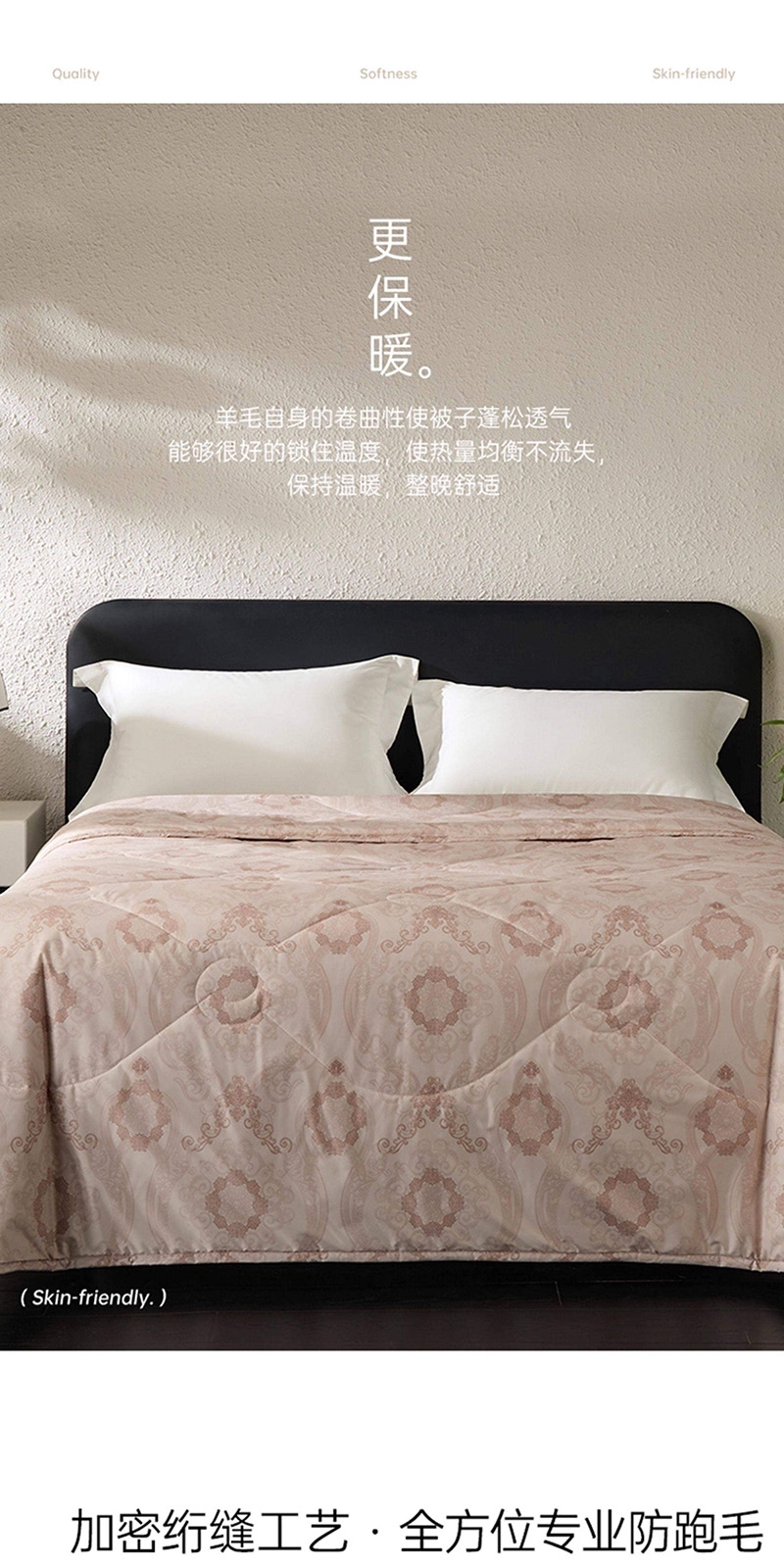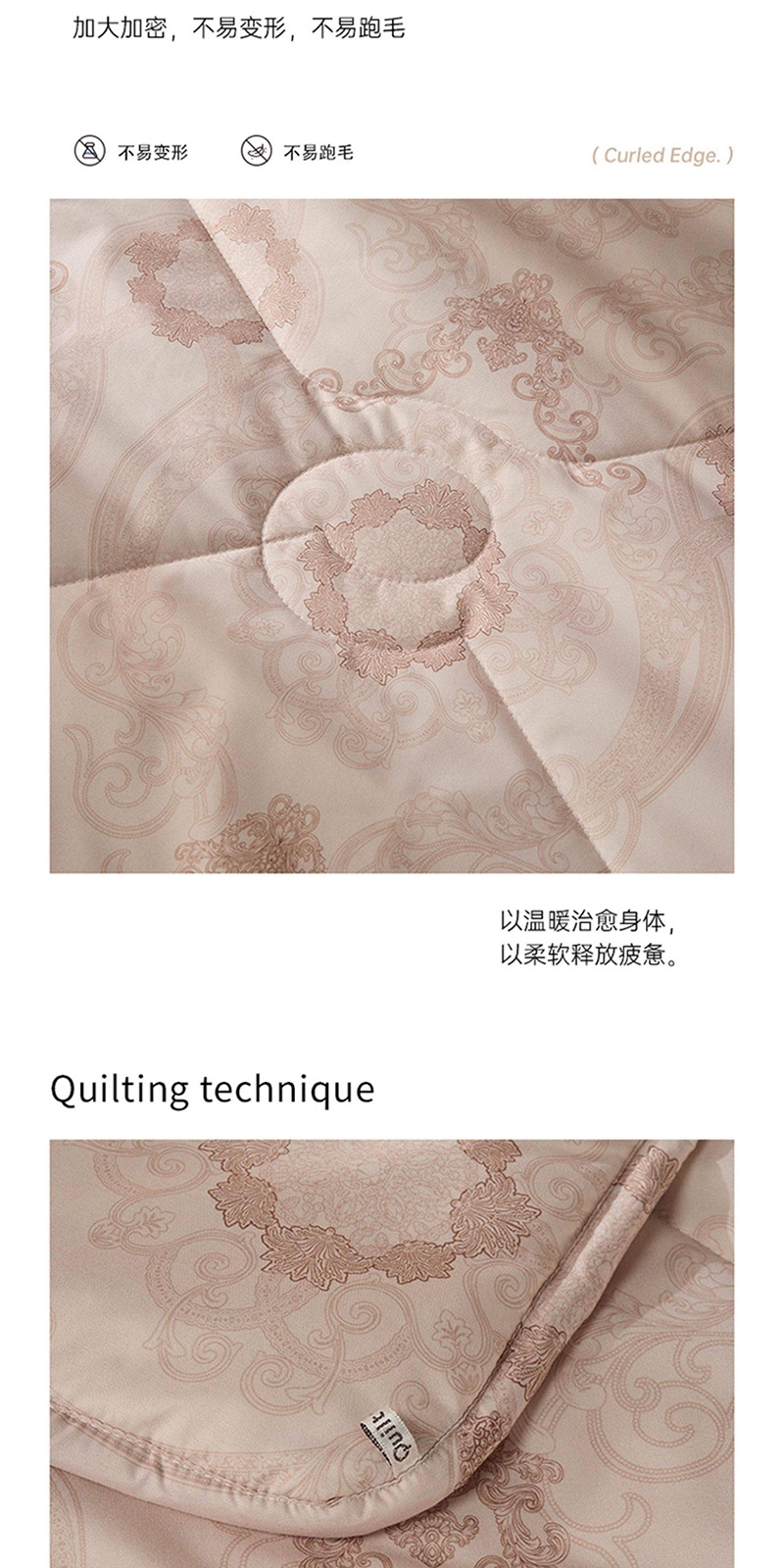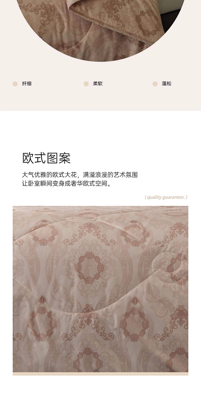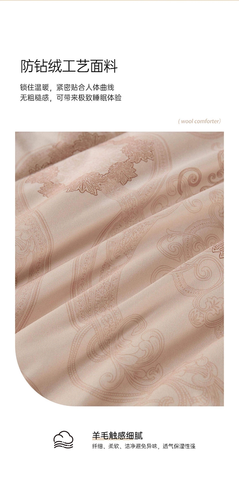 产品材质柔软细腻,紧密贴合人体曲线;大气优雅的欧式大花,满溢浪漫的艺术氛围;精选上乘羊毛填充,天然卷曲结构高效锁温
