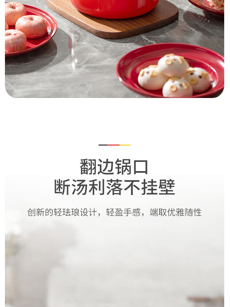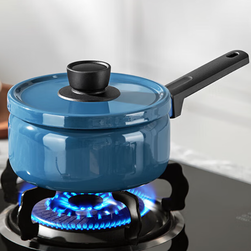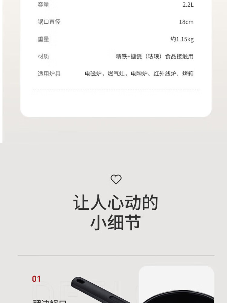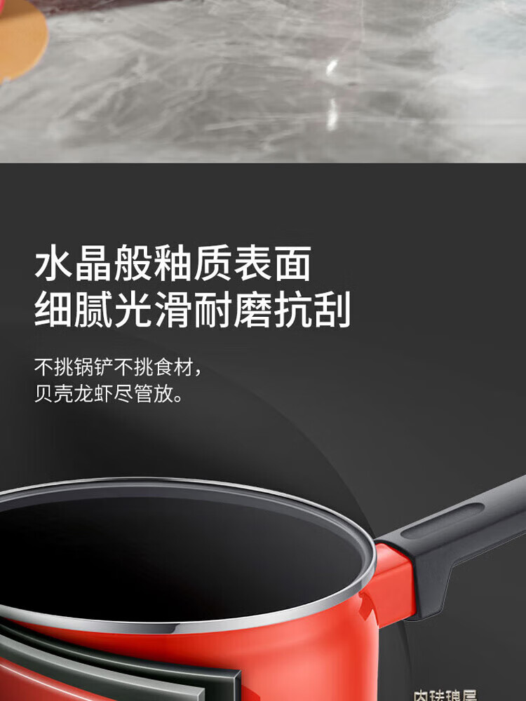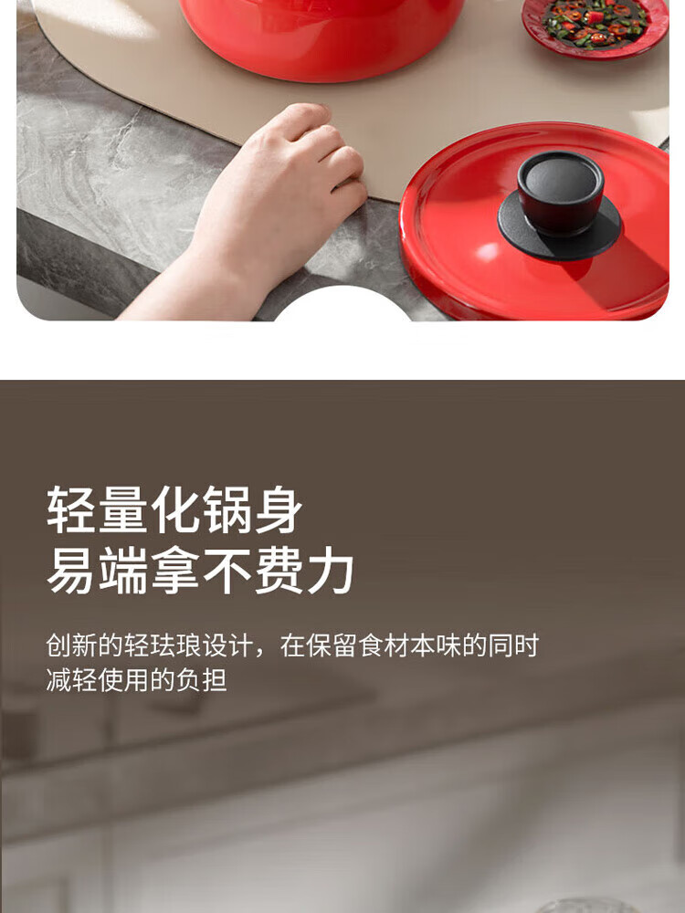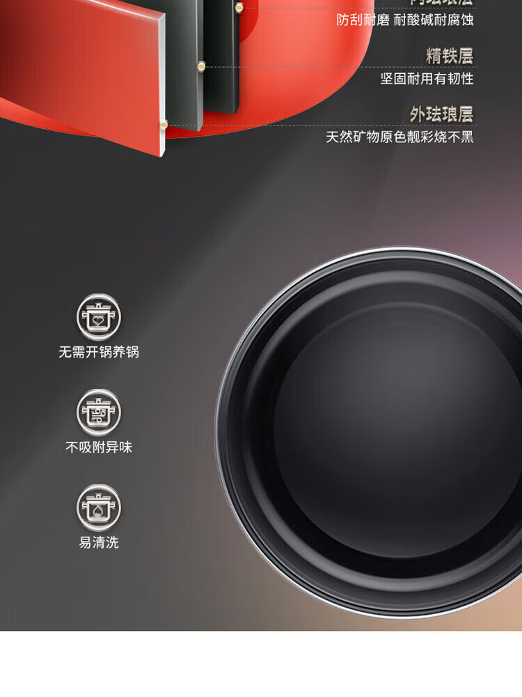 金属珐琅锅盖设计,密封性能好,持久耐用;精铁材质制造,传热更快,受热均匀;;锅体内外壁采用珐琅工艺,让厨房更加靓丽