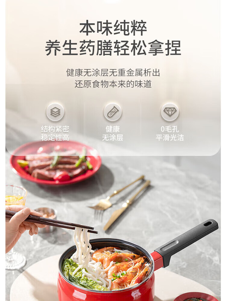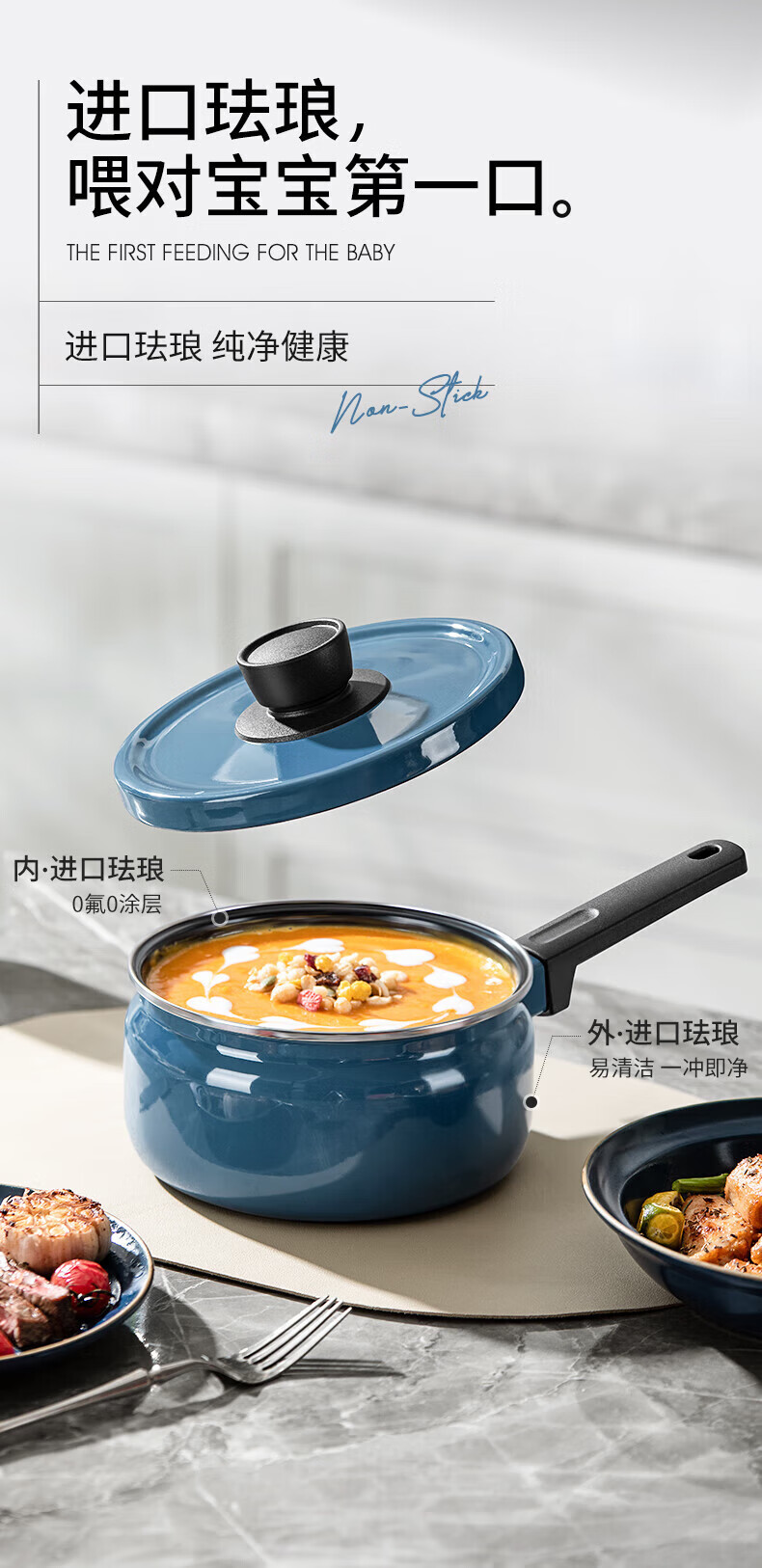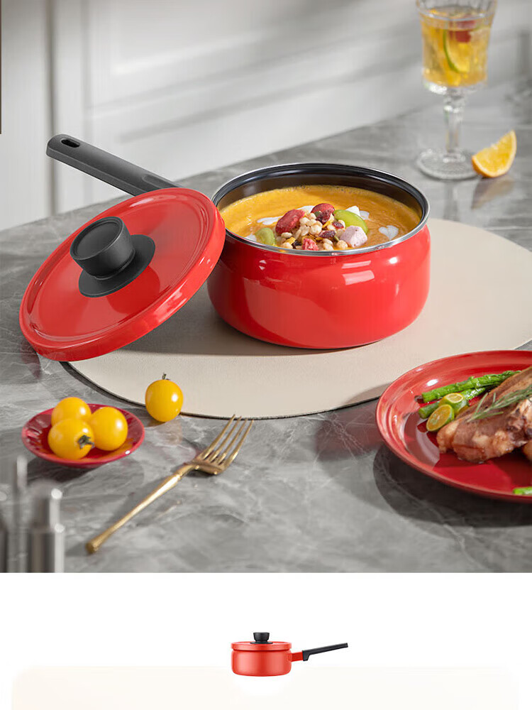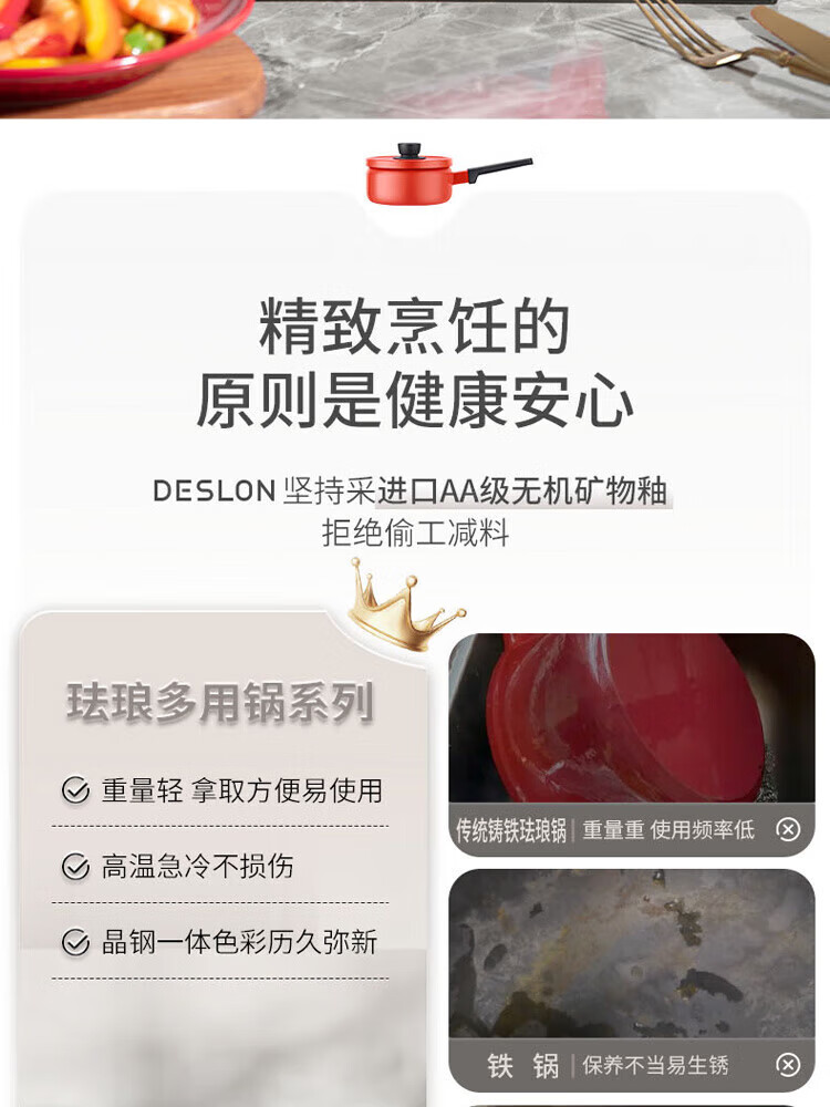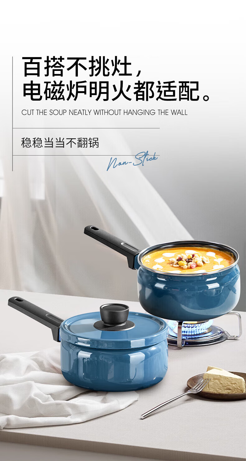 金属珐琅锅盖设计,密封性能好,持久耐用;精铁材质制造,传热更快,受热均匀;;锅体内外壁采用珐琅工艺,让厨房更加靓丽