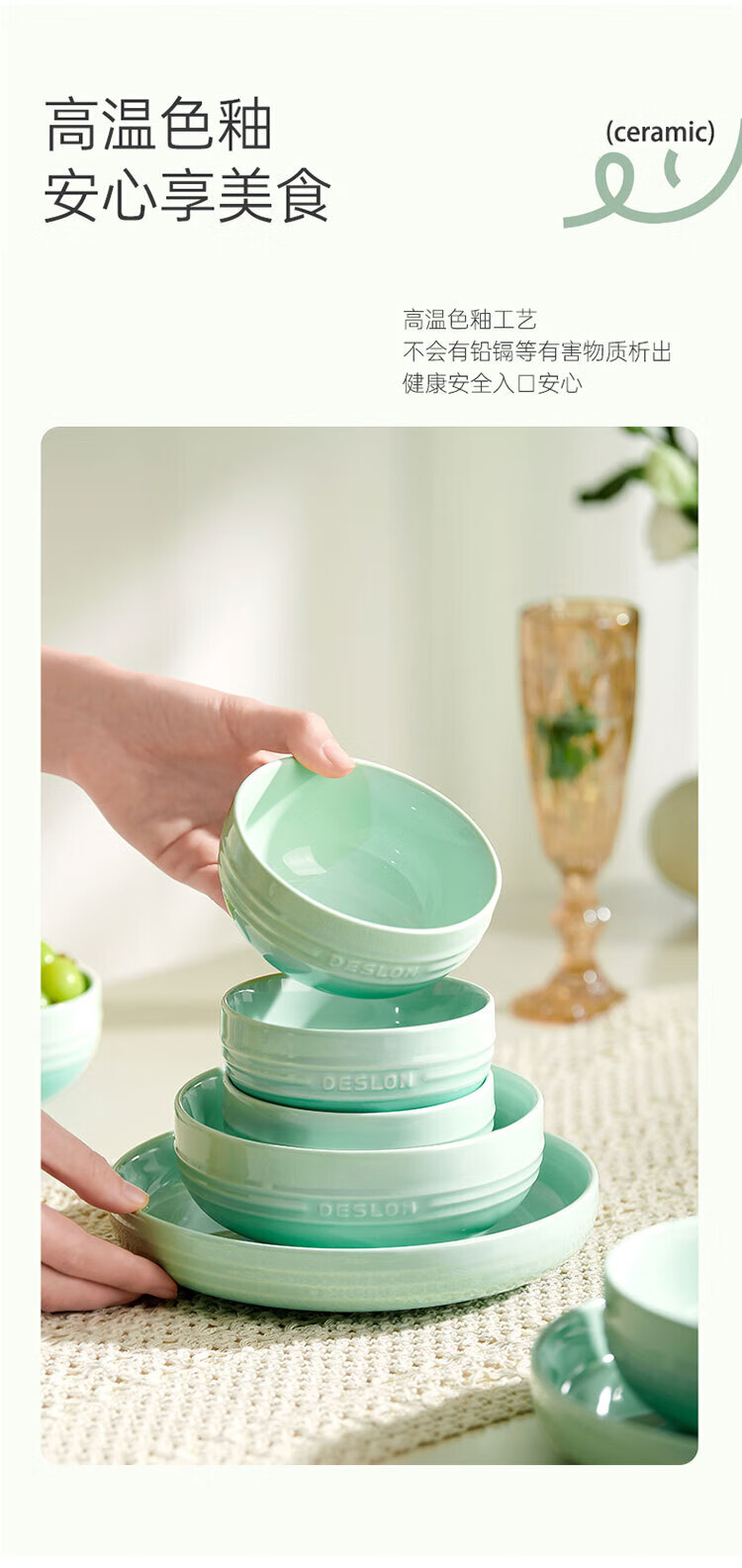 温润细腻的质感;釉下彩工艺,不掉色、不脱落,安心适用,呵护健康;简约的线条浮雕设计,精致美观,增添您的生活乐趣
