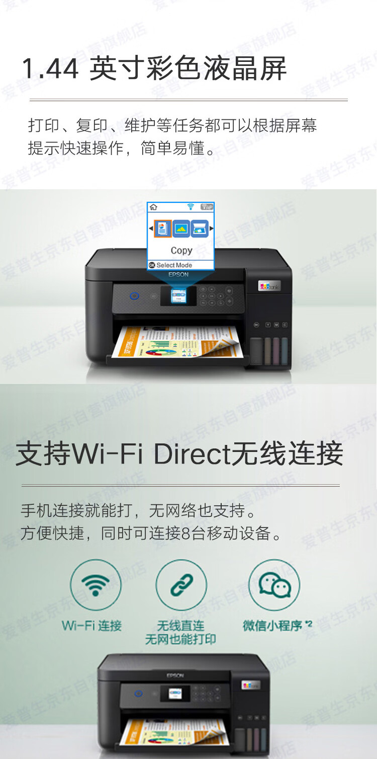 超大墨量,黑白打印一张只花一分钱;微信打印,直连无忧;无需手动翻面,省时省力,更加高效;1.44英寸彩色液晶屏;支持Wi-Fi Direct无线连接