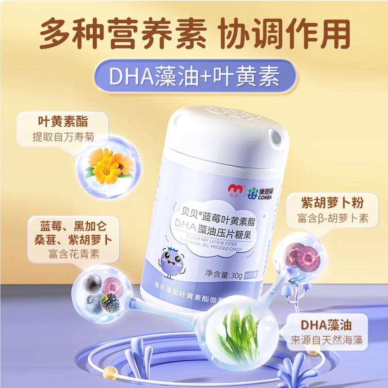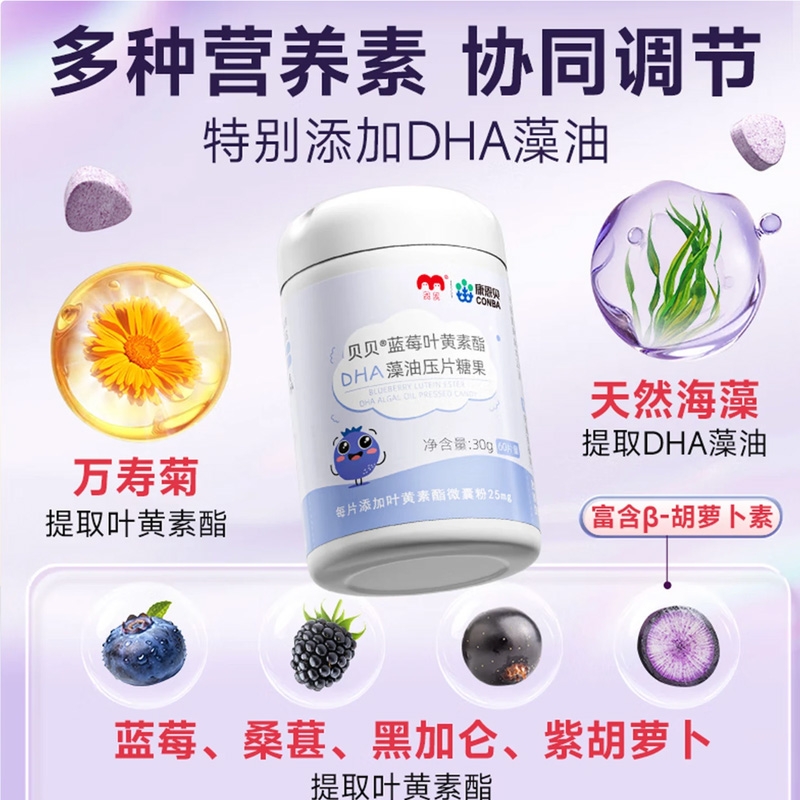 专利叶黄素酯营养稳定好吸收;特别添加DHA藻油粉,紫胡萝卜粉;蓝莓酸奶味配料干净 每日2片,宝贝爱吃