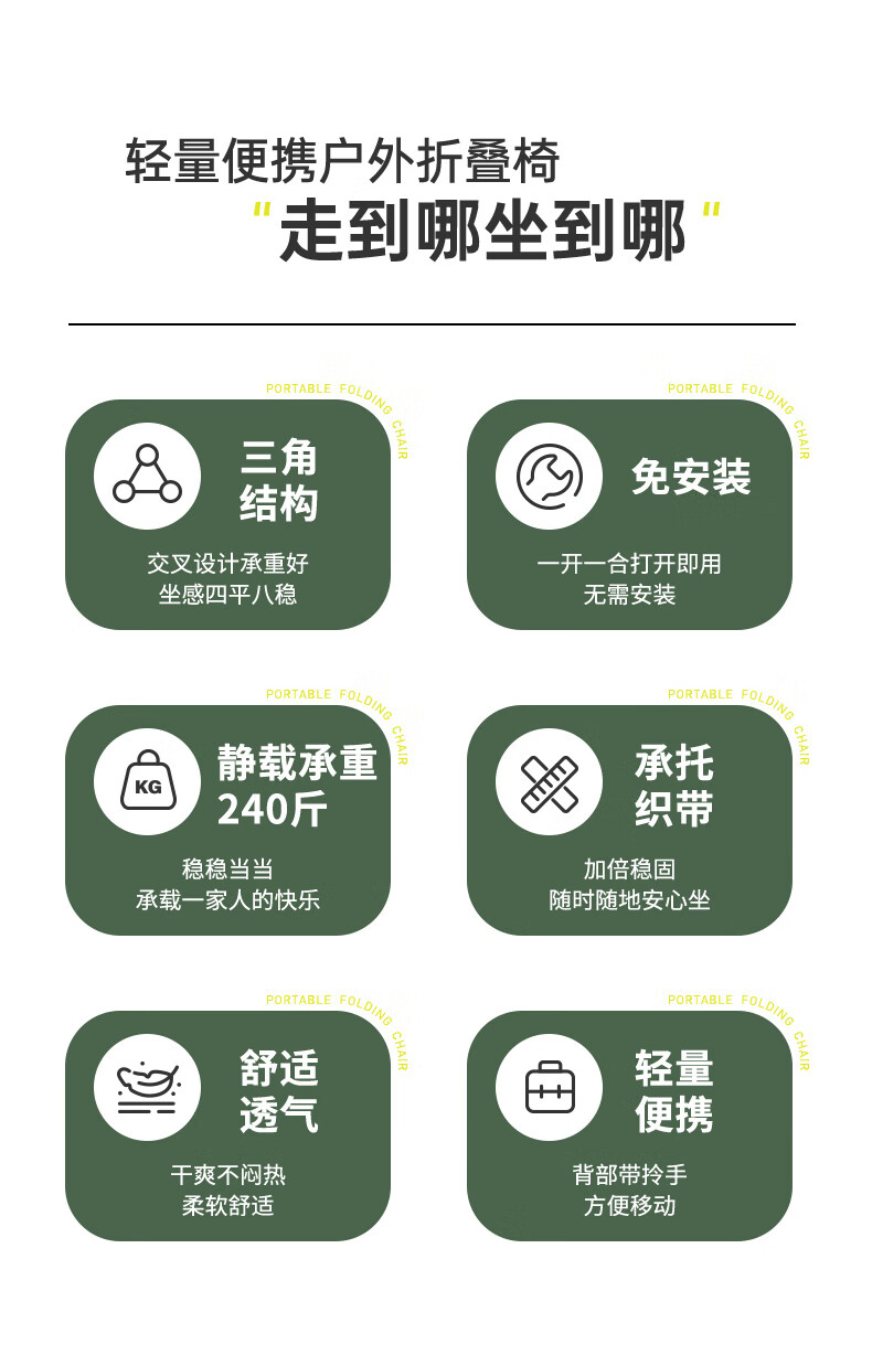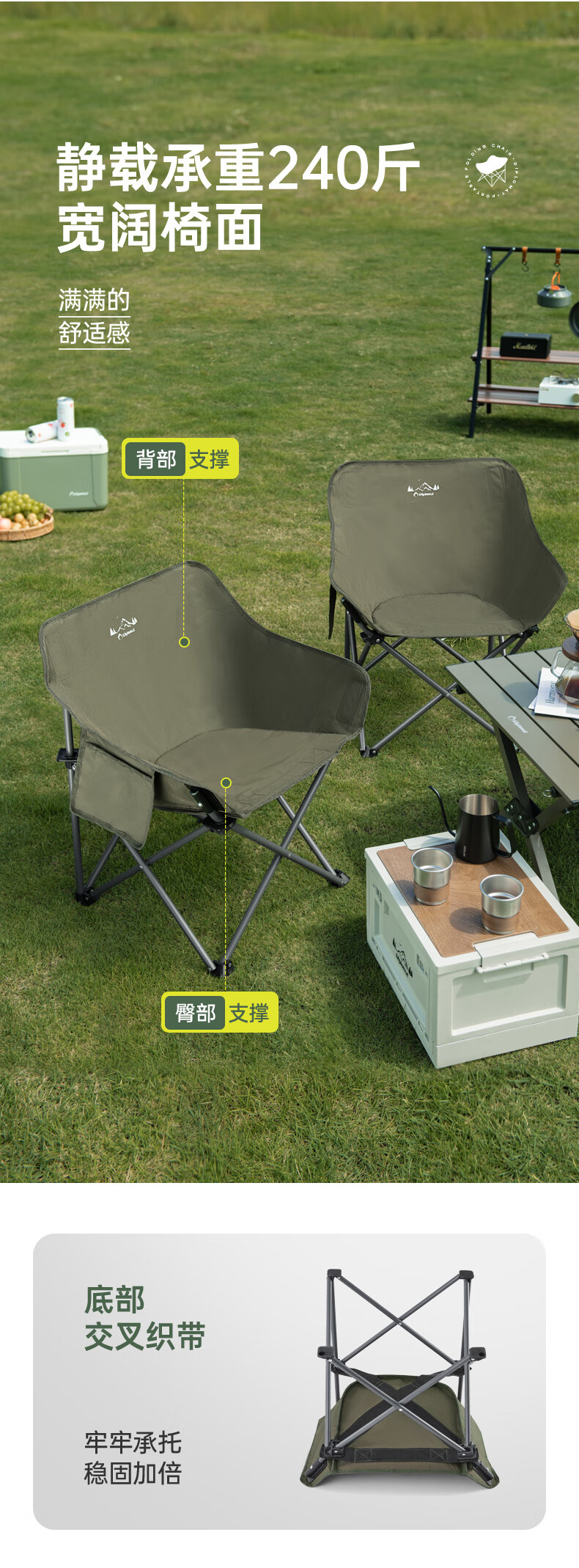 底部升级三承托带,静载承重可达240斤。;舒适透气;轻量便携