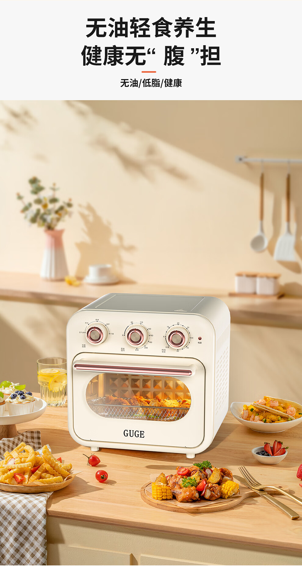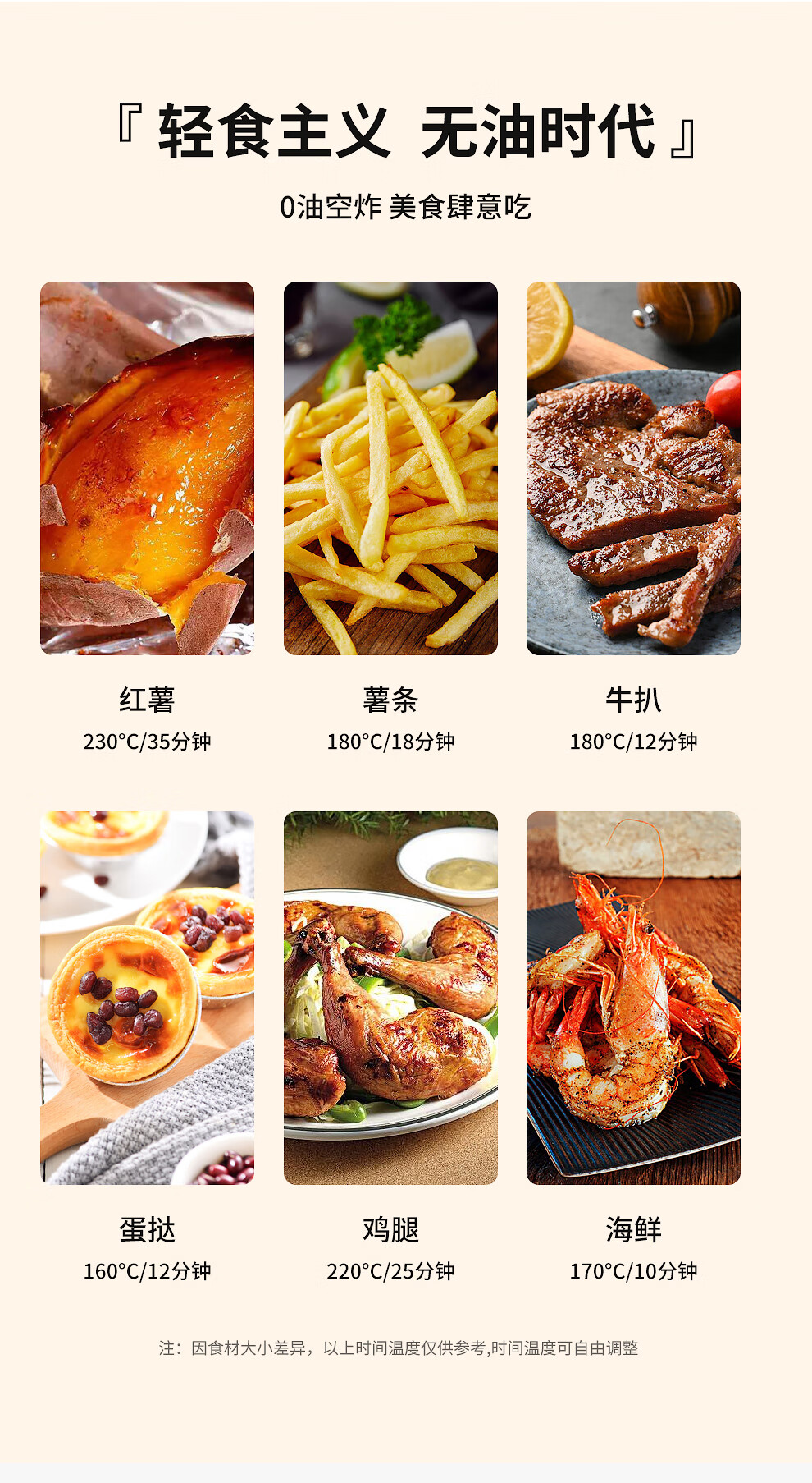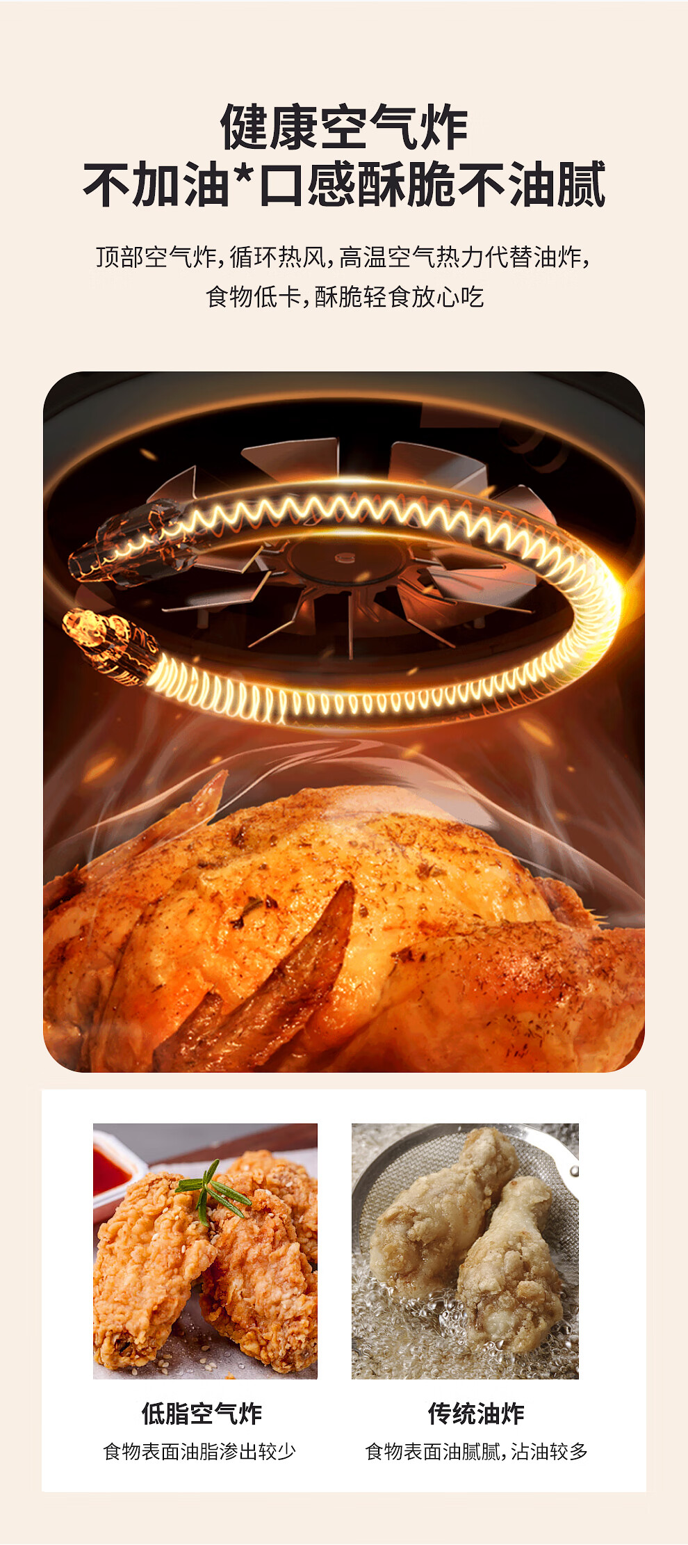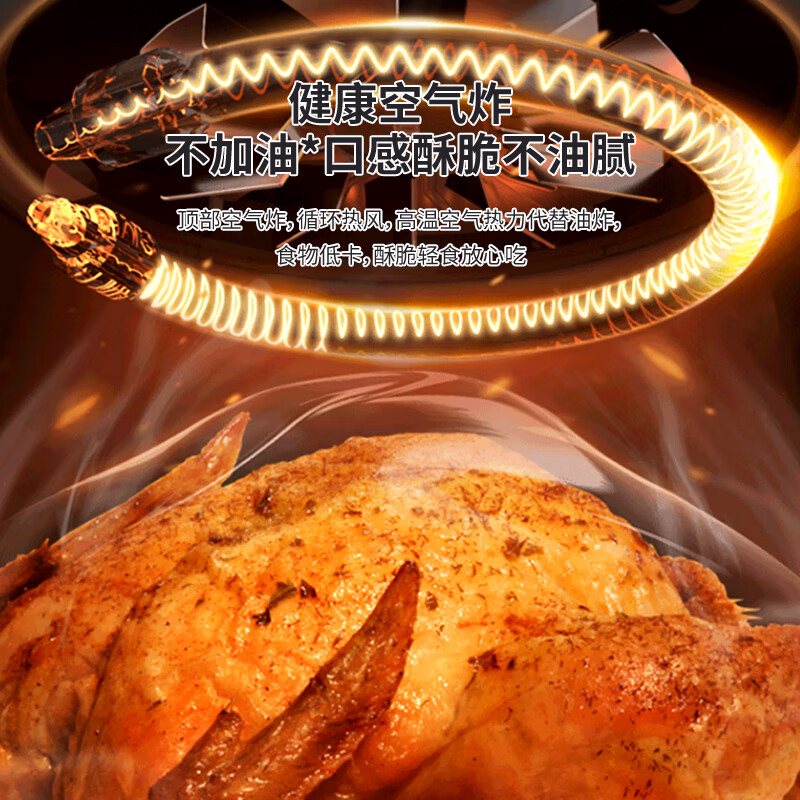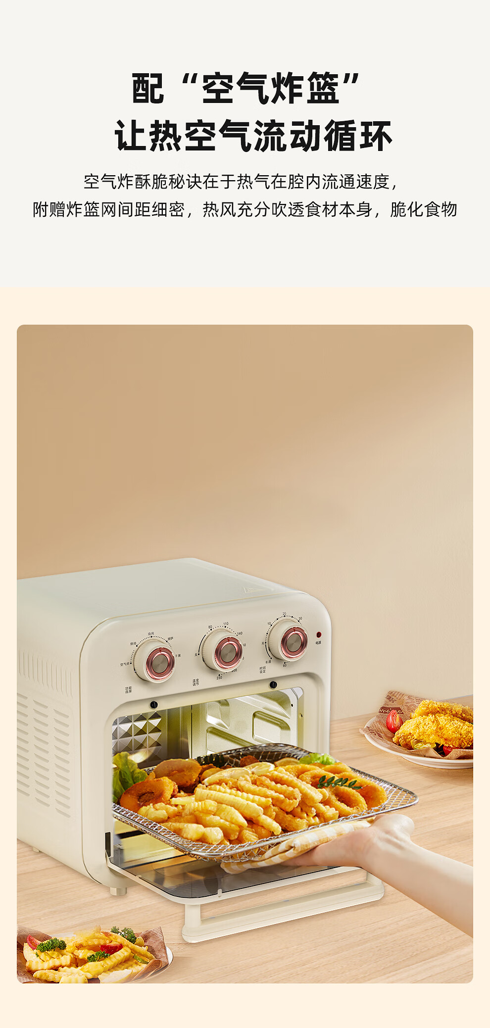 功能/时间/温度旋钮控制,操作简单; 健康空气炸、烤一体,配空气炸篮,循环热风;空气炸、烘培、烧烤、披萨、干果一机多用