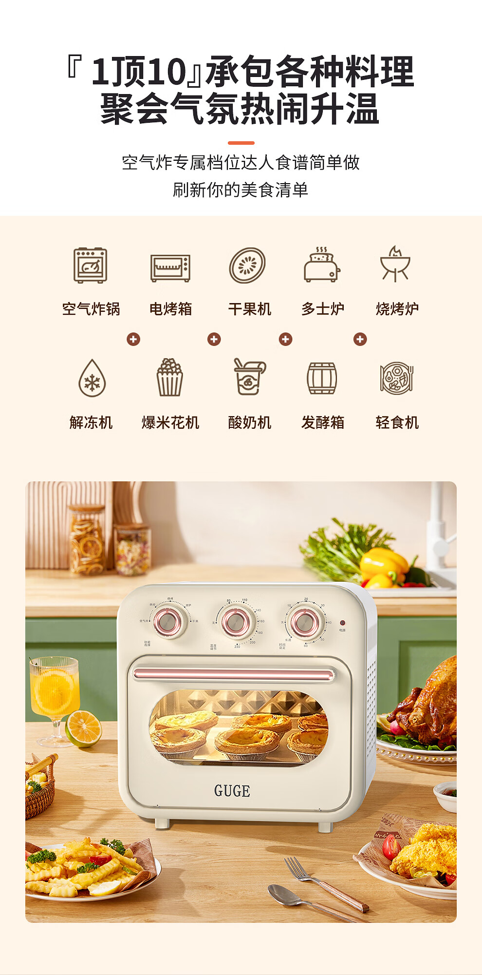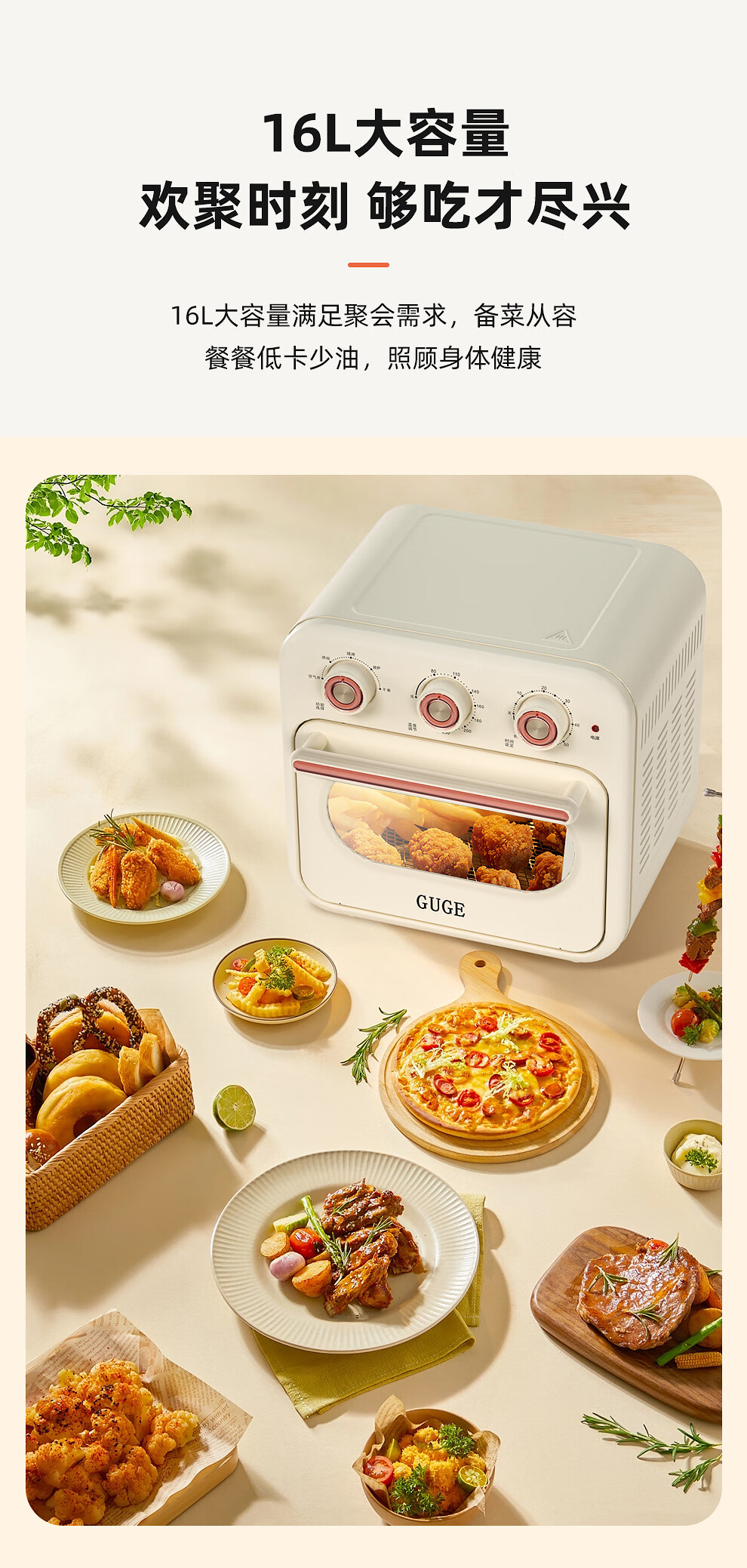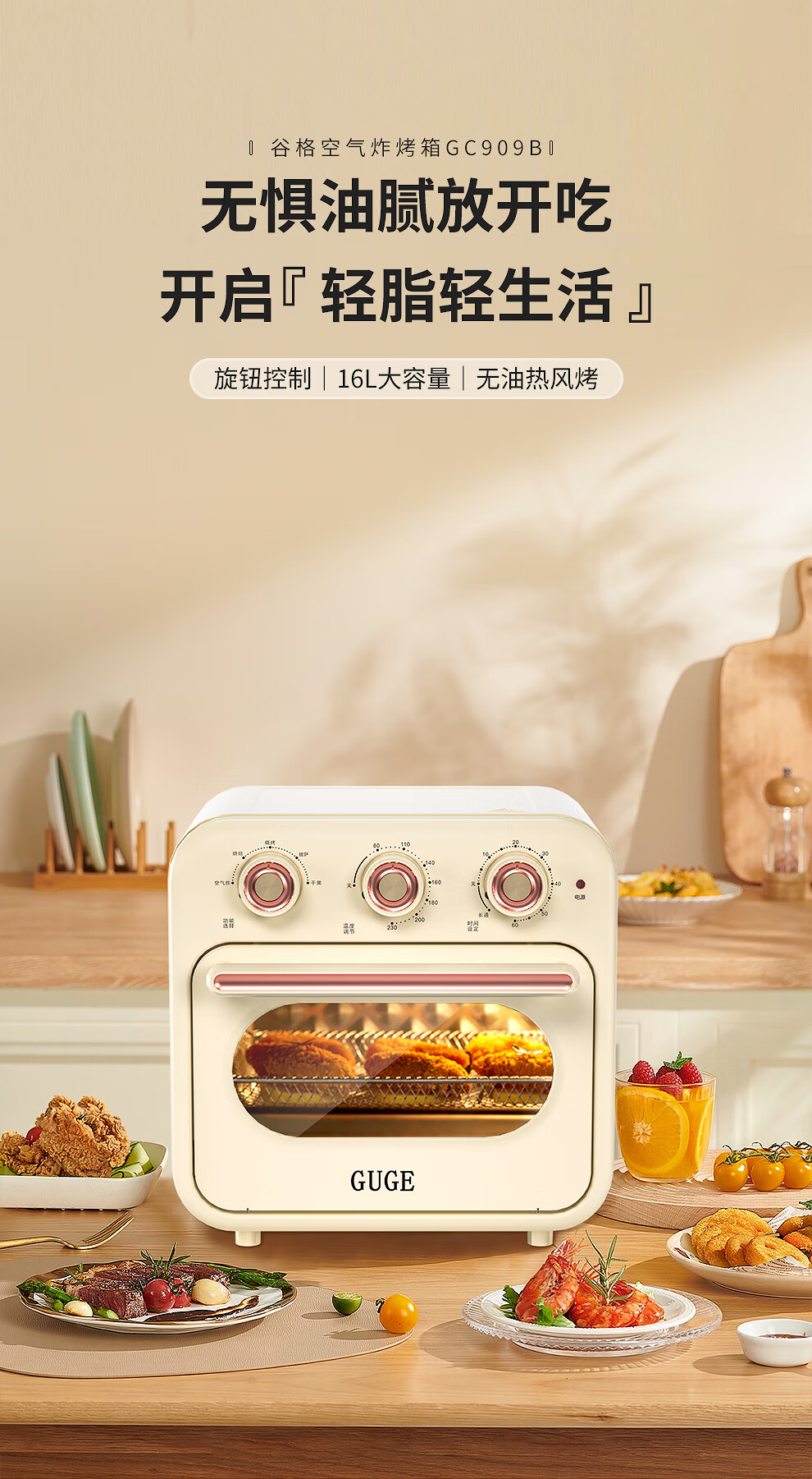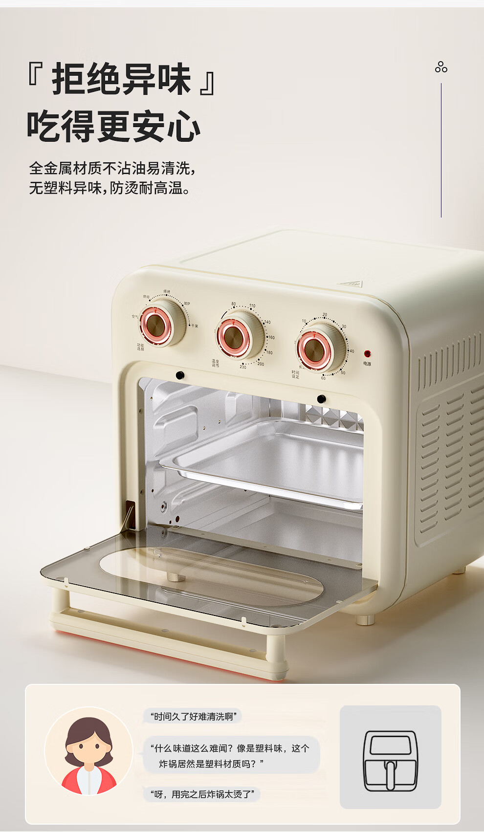功能/时间/温度旋钮控制,操作简单; 健康空气炸、烤一体,配空气炸篮,循环热风;空气炸、烘培、烧烤、披萨、干果一机多用