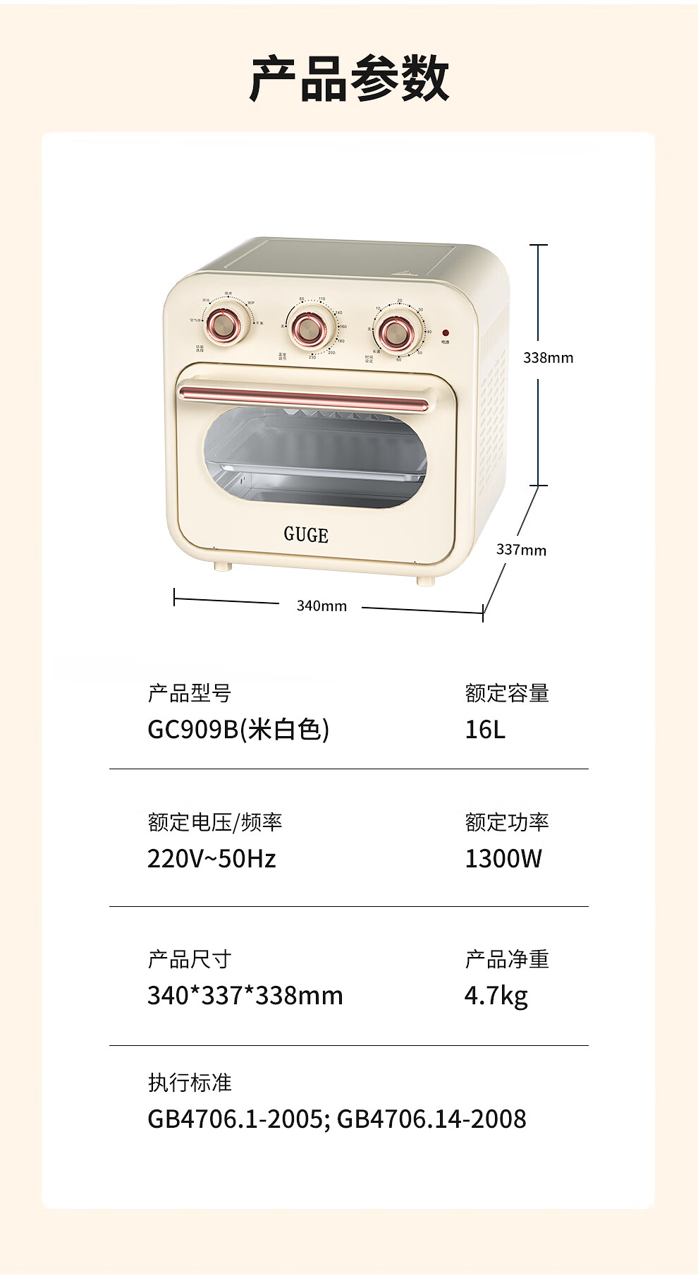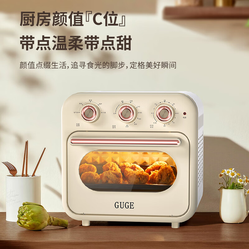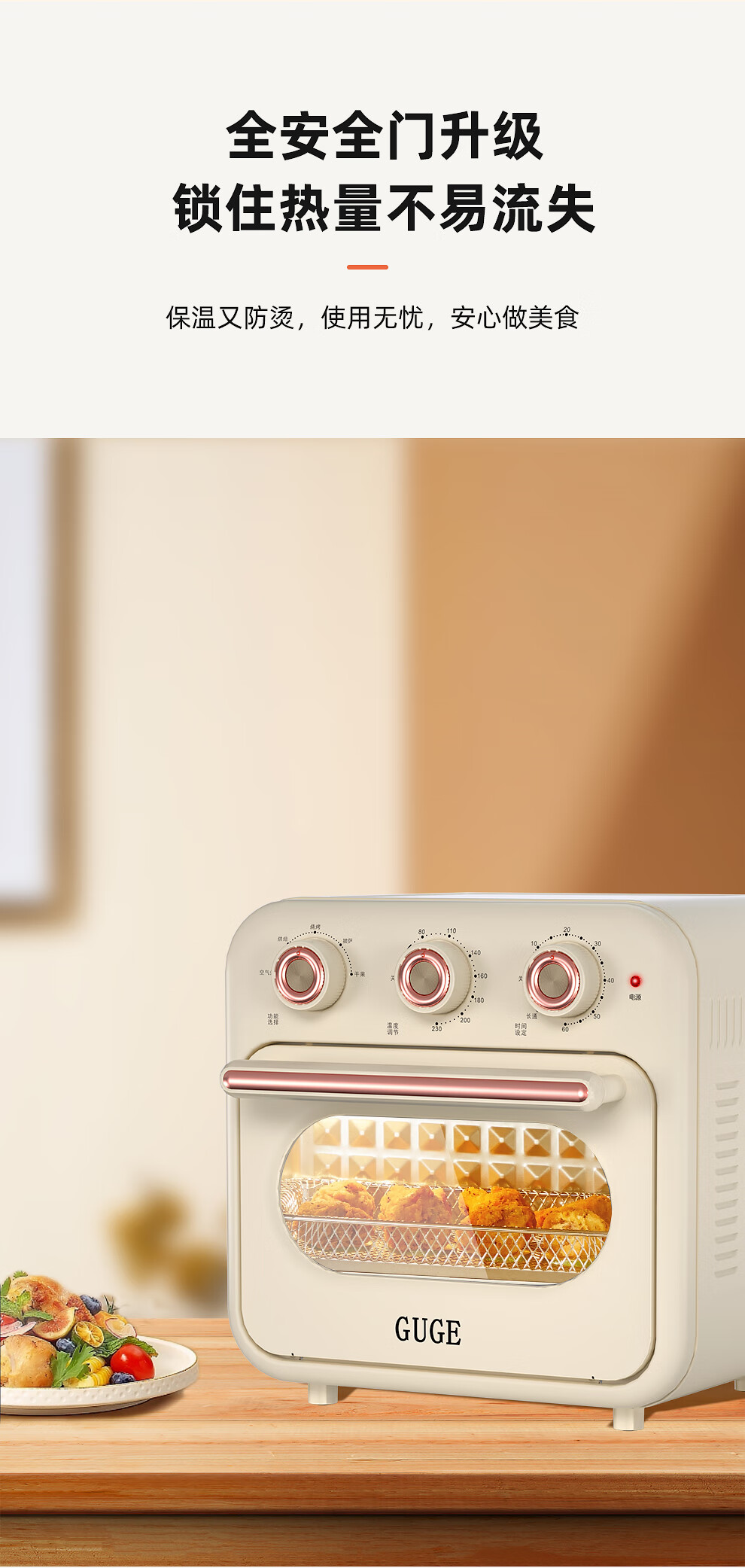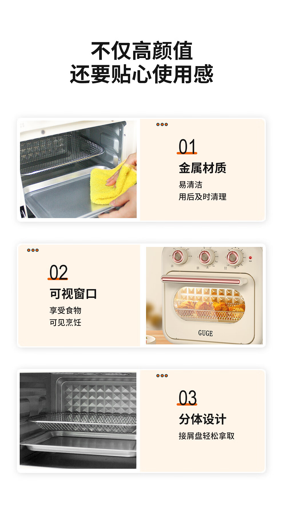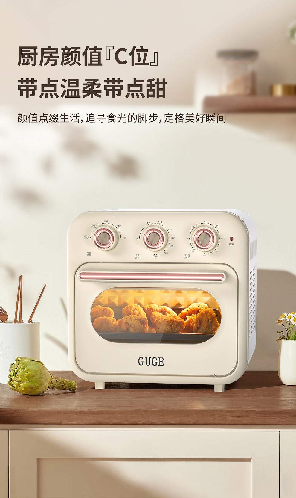 功能/时间/温度旋钮控制,操作简单; 健康空气炸、烤一体,配空气炸篮,循环热风;空气炸、烘培、烧烤、披萨、干果一机多用