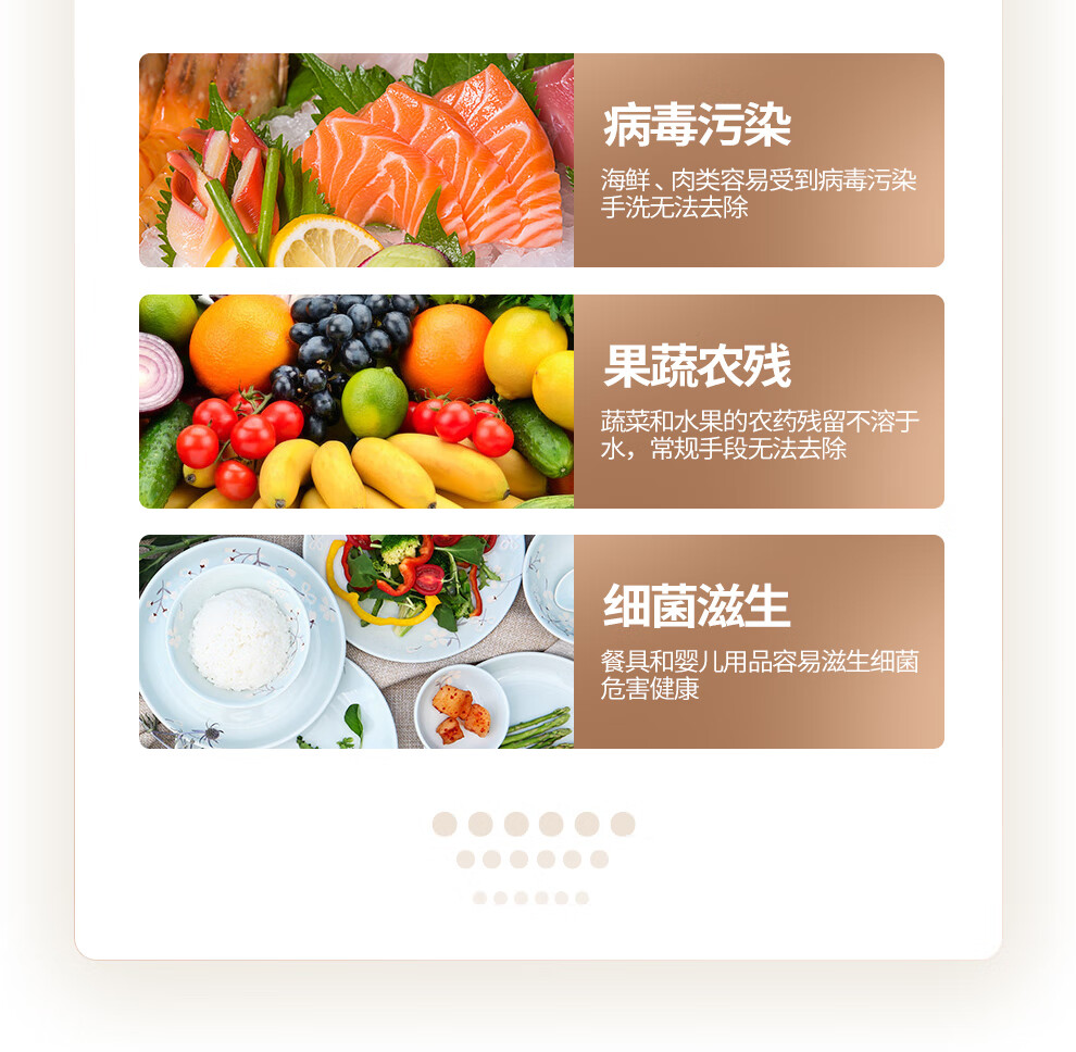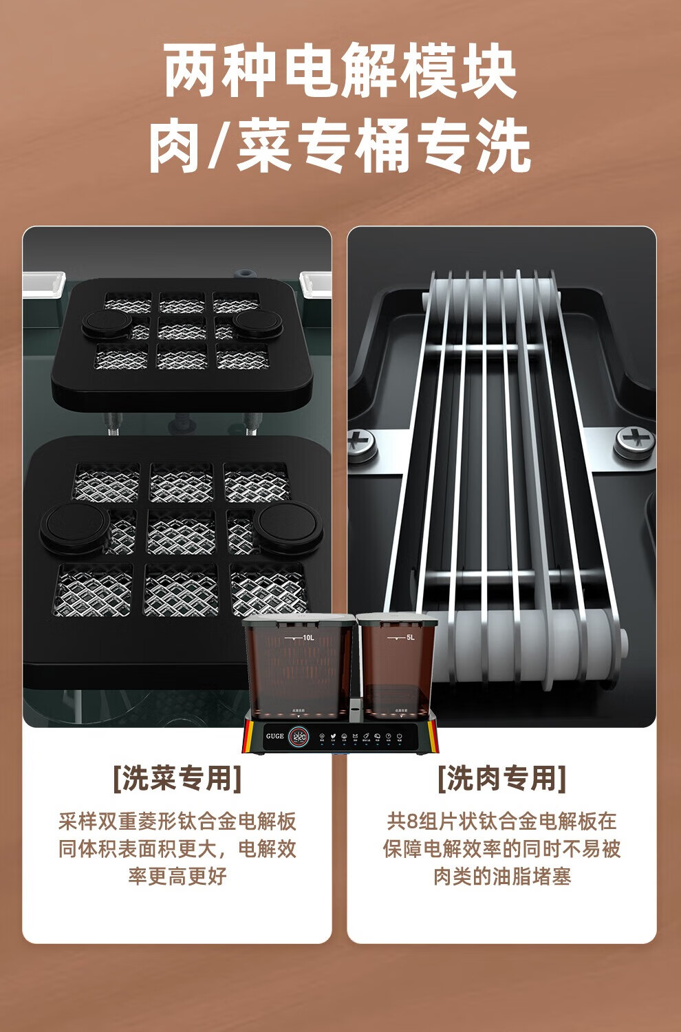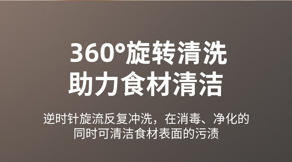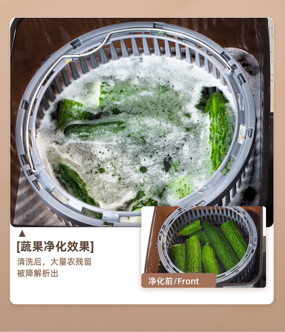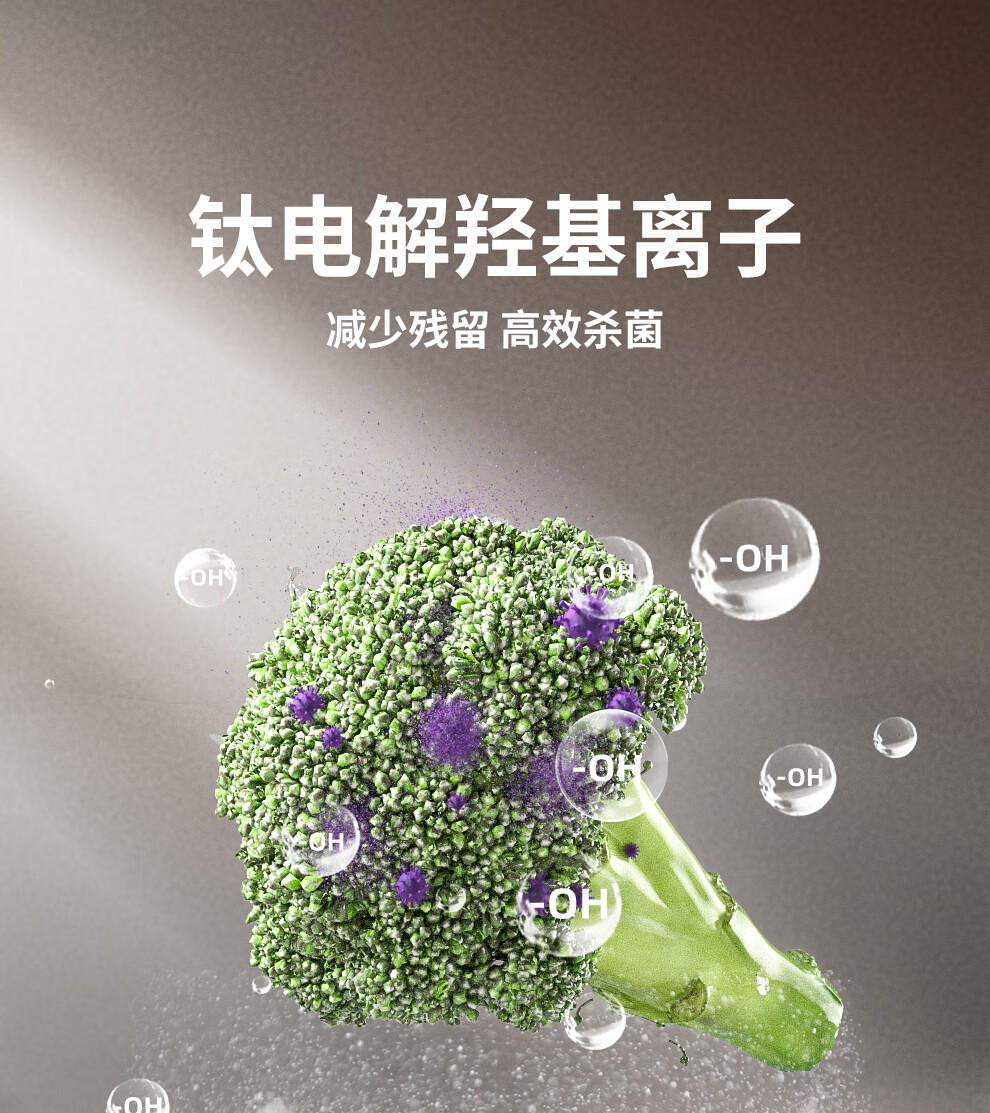 360度旋转清洗,一键净化各种残留污染;高清触控面板, 机桶分离方便清洗;两种电解模块,钛电解羟基离子,强力去除残留、病毒
