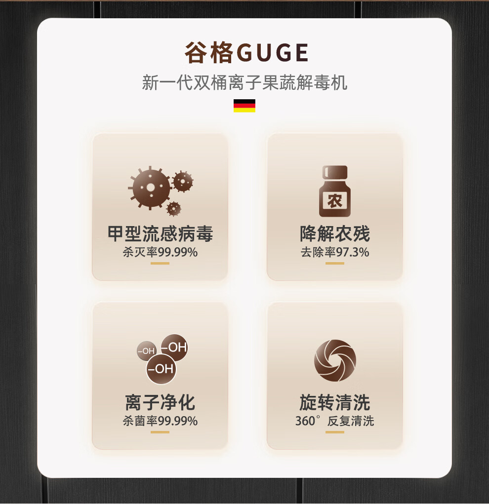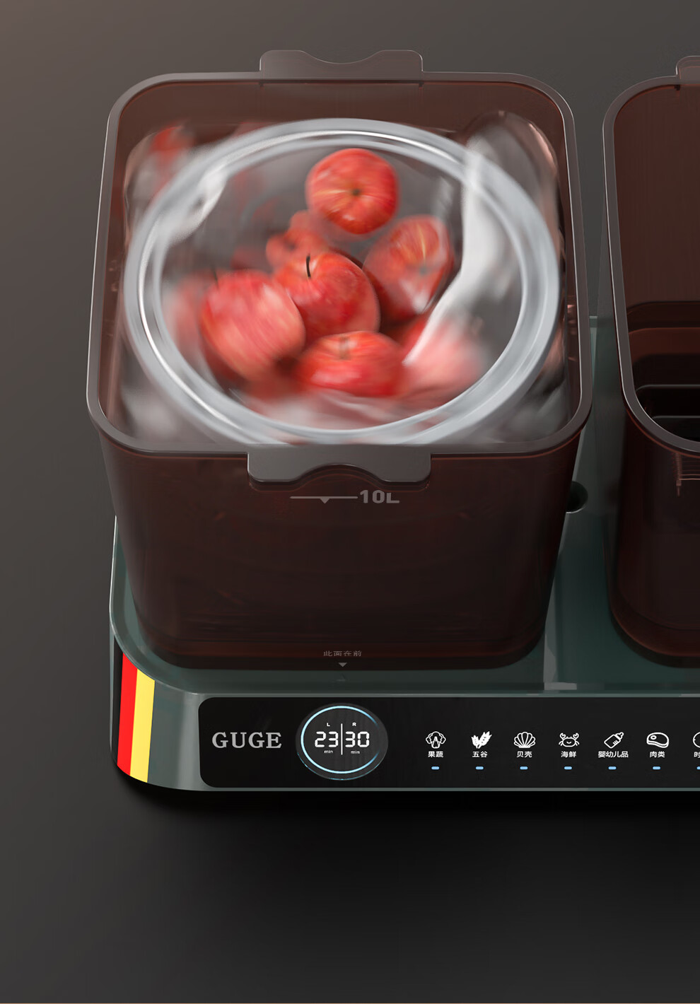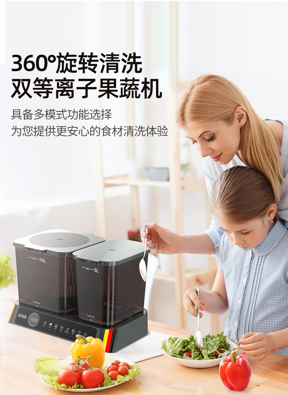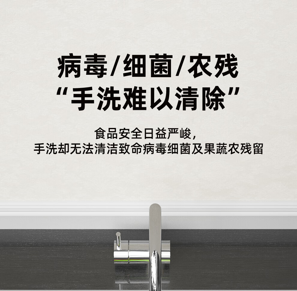 360度旋转清洗,一键净化各种残留污染;高清触控面板, 机桶分离方便清洗;两种电解模块,钛电解羟基离子,强力去除残留、病毒