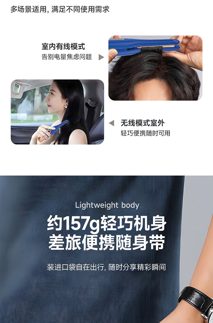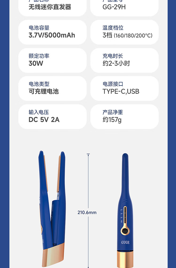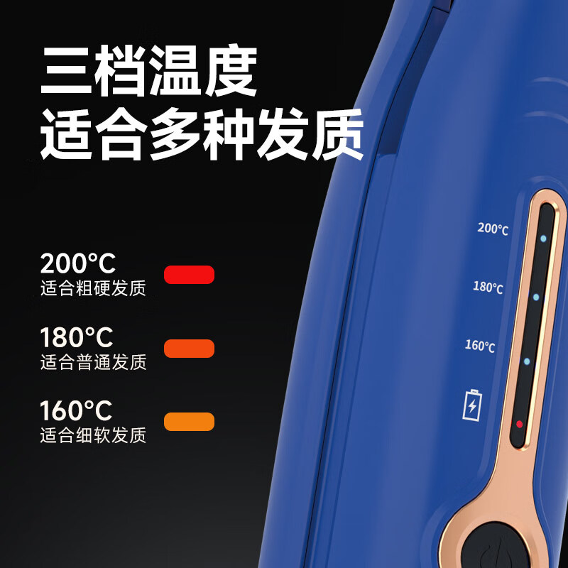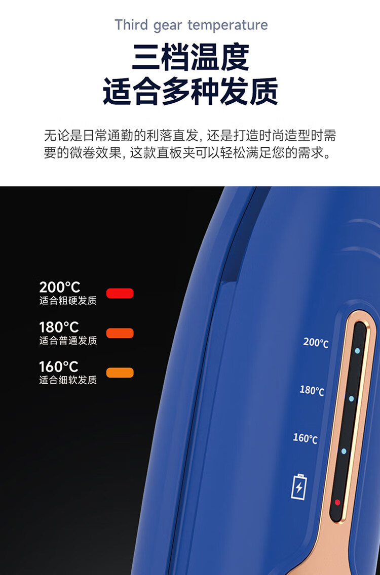 迷你身材随身便携,157g轻量设计;三档温控满足不同发质需求;Type-C USB充电接口,支持车载、电脑USB