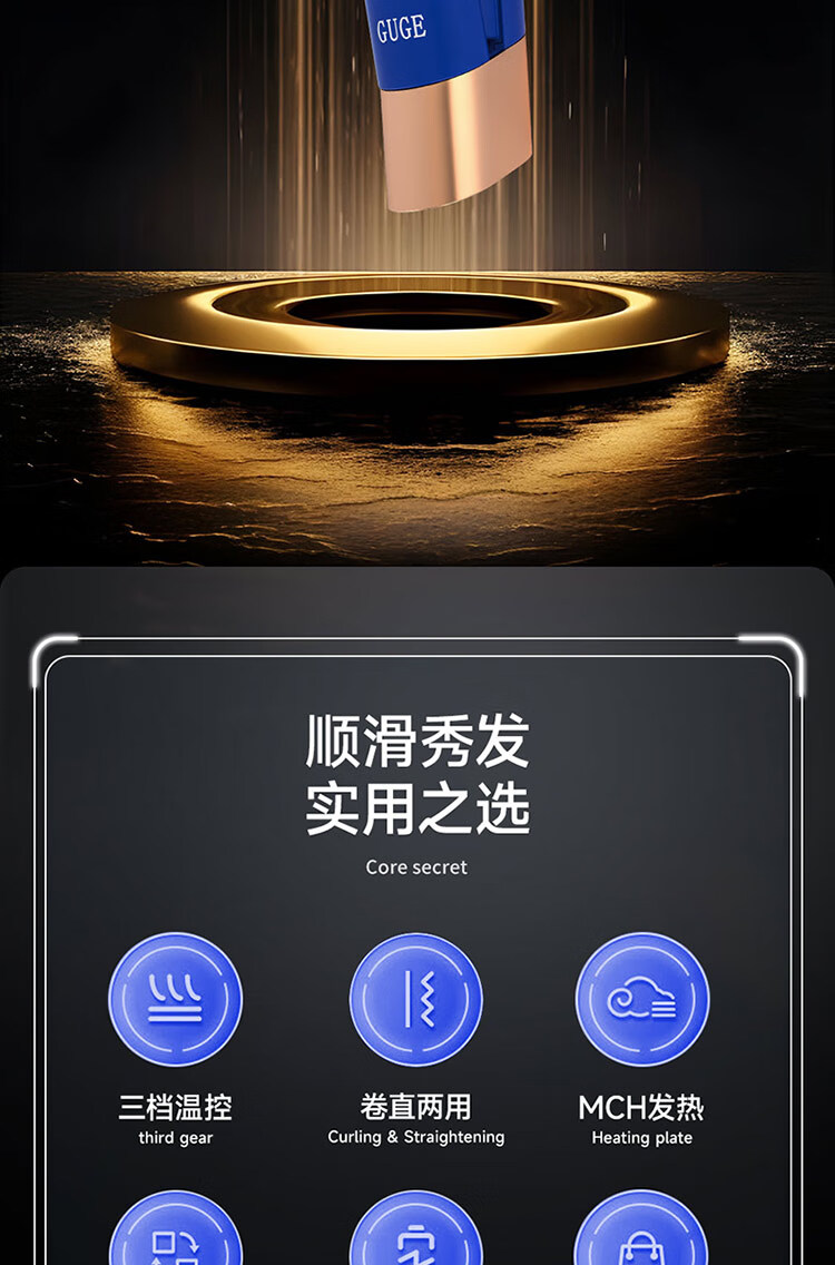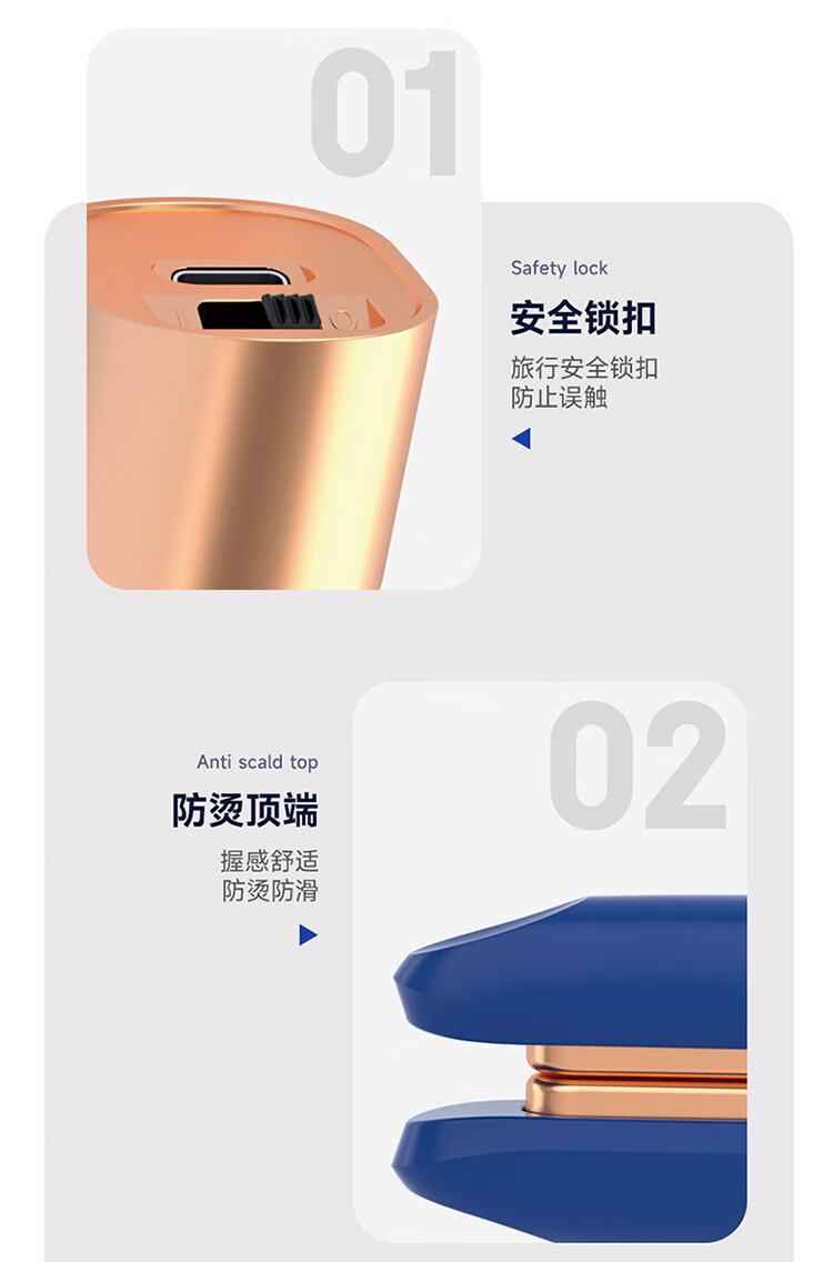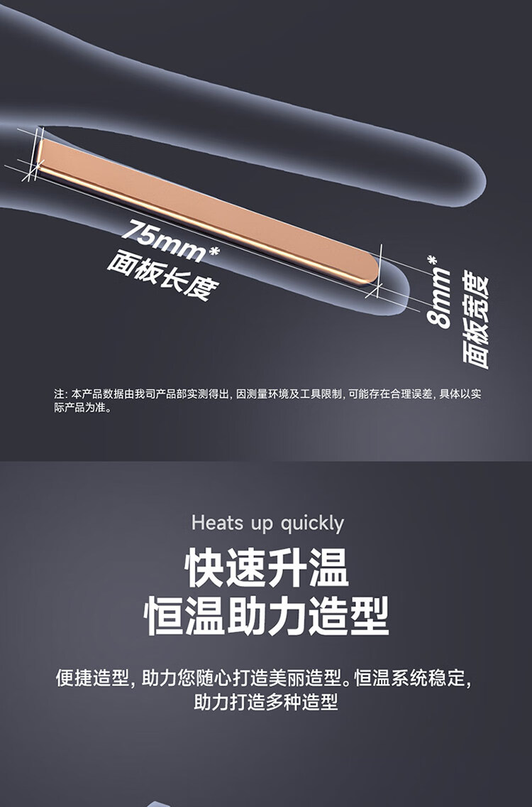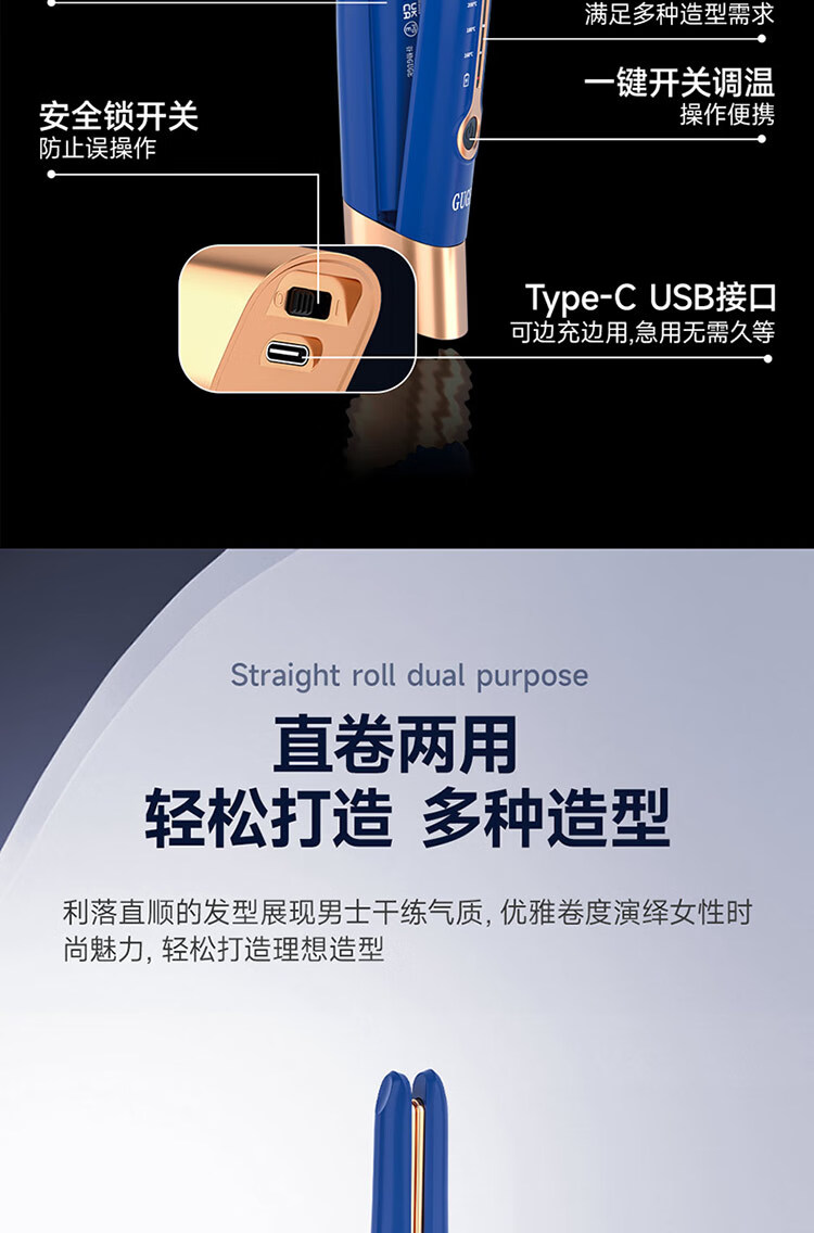 迷你身材随身便携,157g轻量设计;三档温控满足不同发质需求;Type-C USB充电接口,支持车载、电脑USB