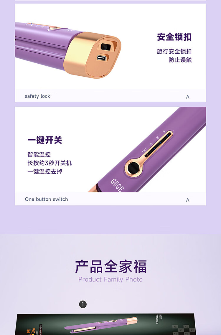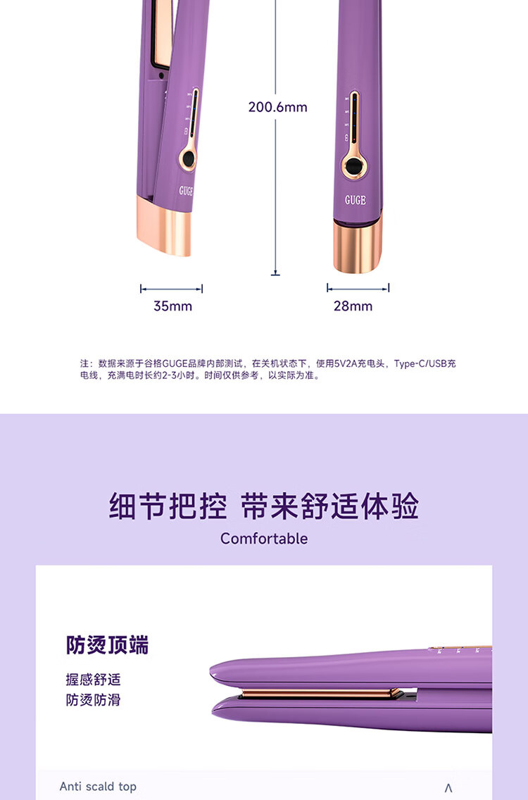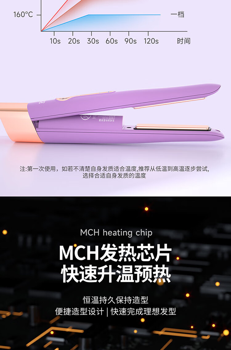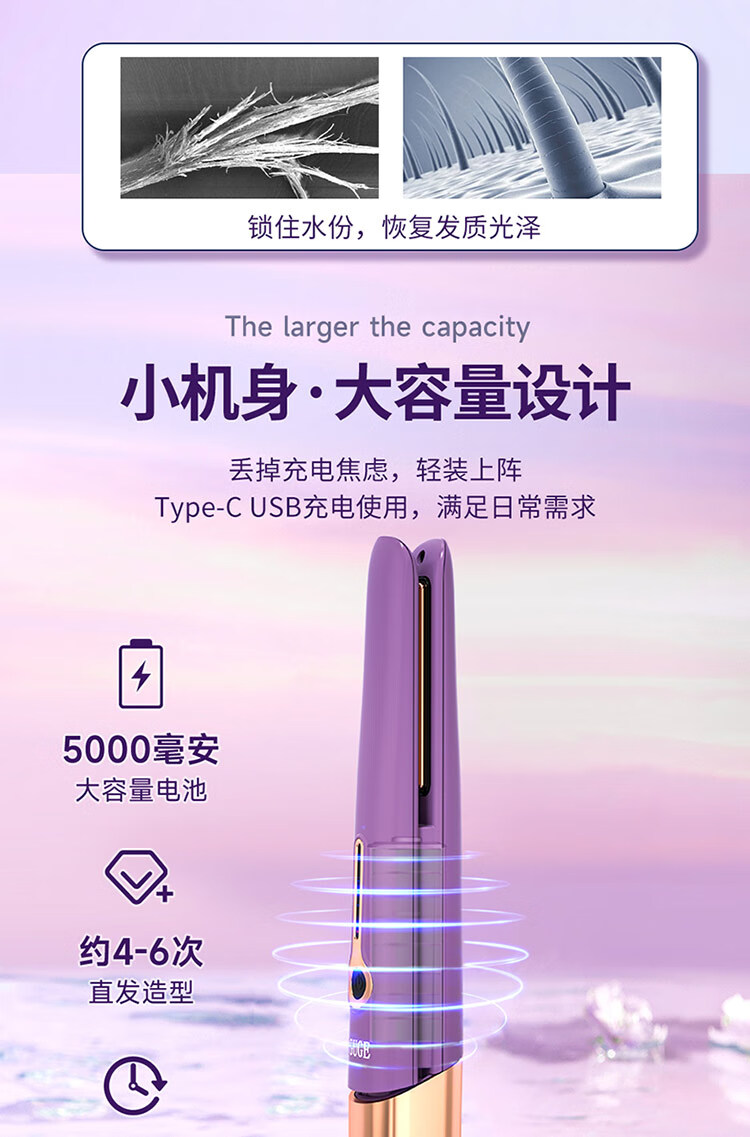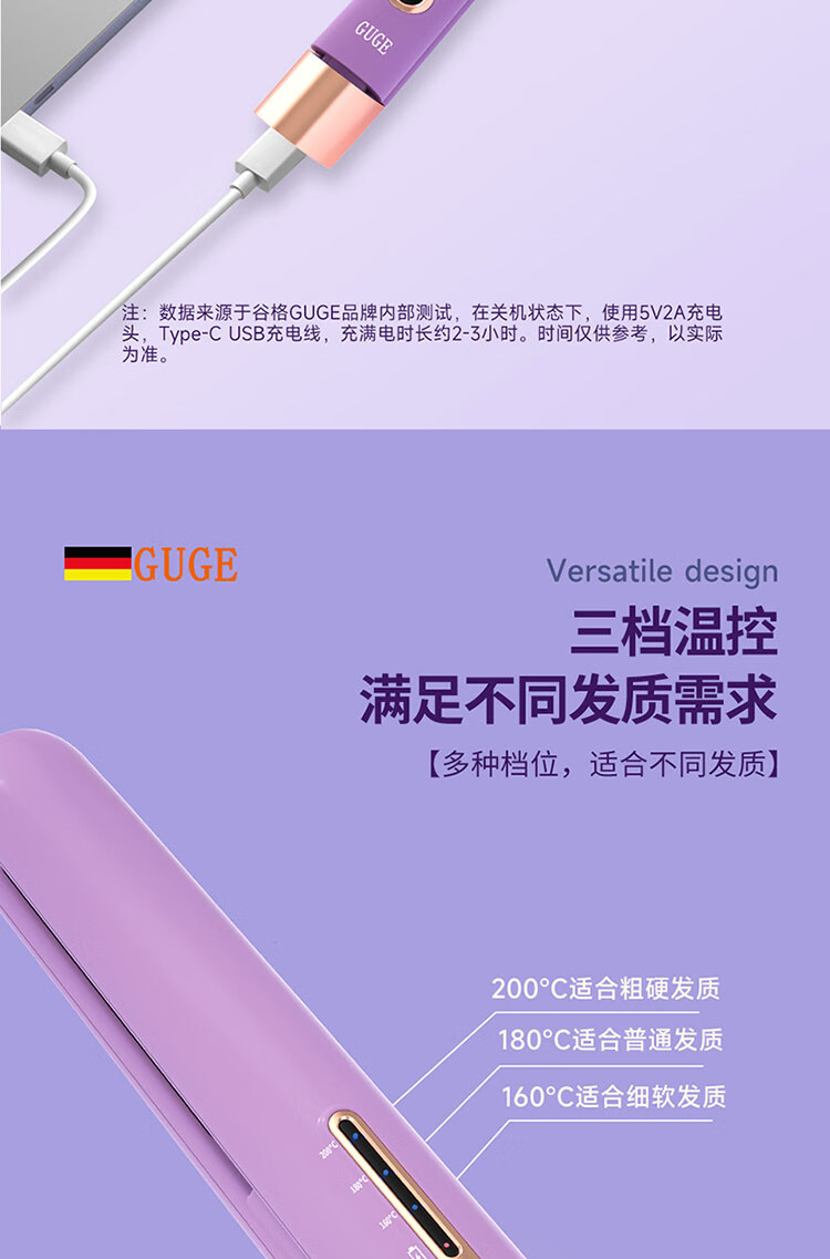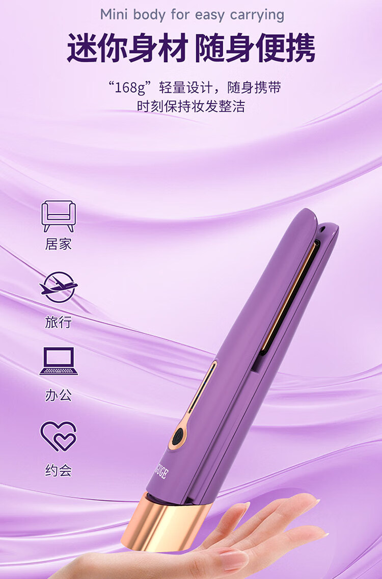 迷你身材随身便携,168g轻量设计;三档温控满足不同发质需求;Type-C USB充电接口,支持车载、电脑USB