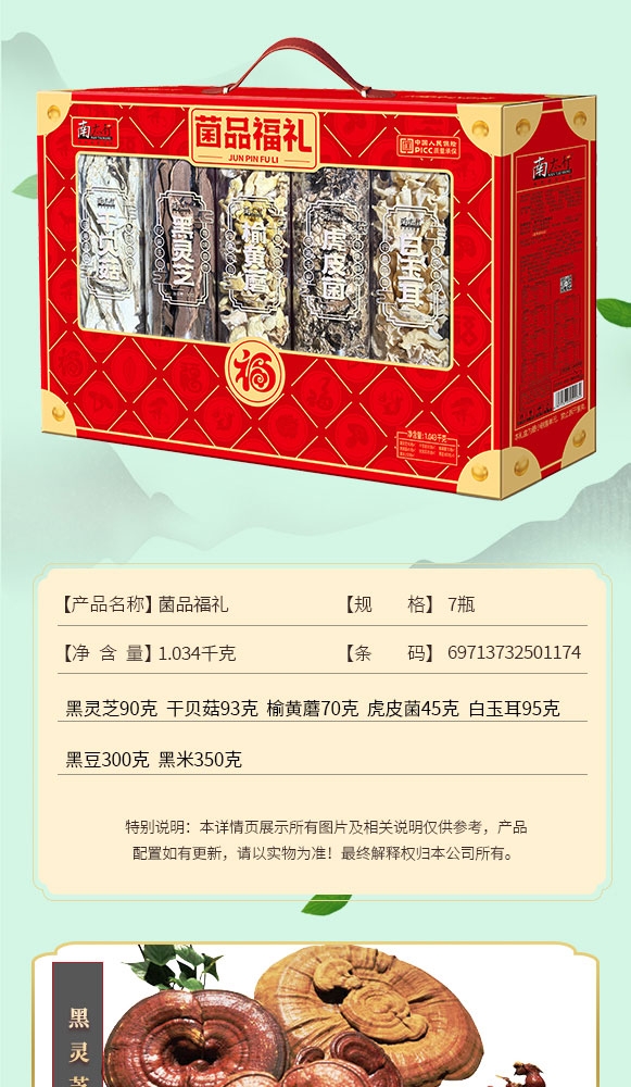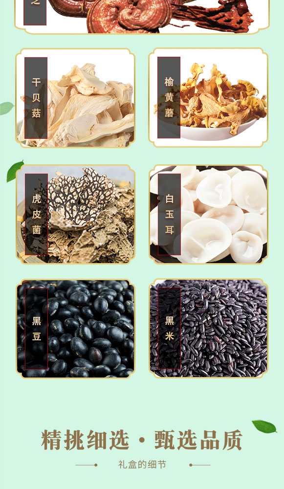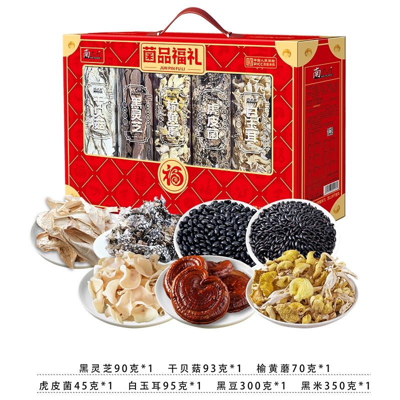 配置清单:黑灵芝90克*1罐 干贝菇93克*1罐 榆黄蘑70克*1罐 虎皮菌45克*1罐 白玉耳95克*1罐 黑豆300克*1罐 黑米350克*1罐