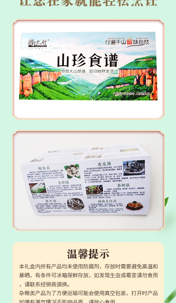 高档礼盒包装,金红配色;3D浮雕插画,设计精美,质感出众;贴心配有图文并茂的山珍食谱画册