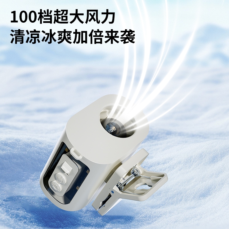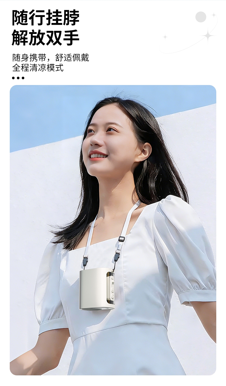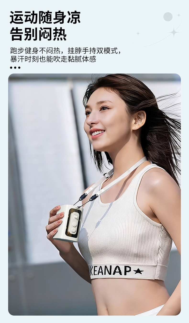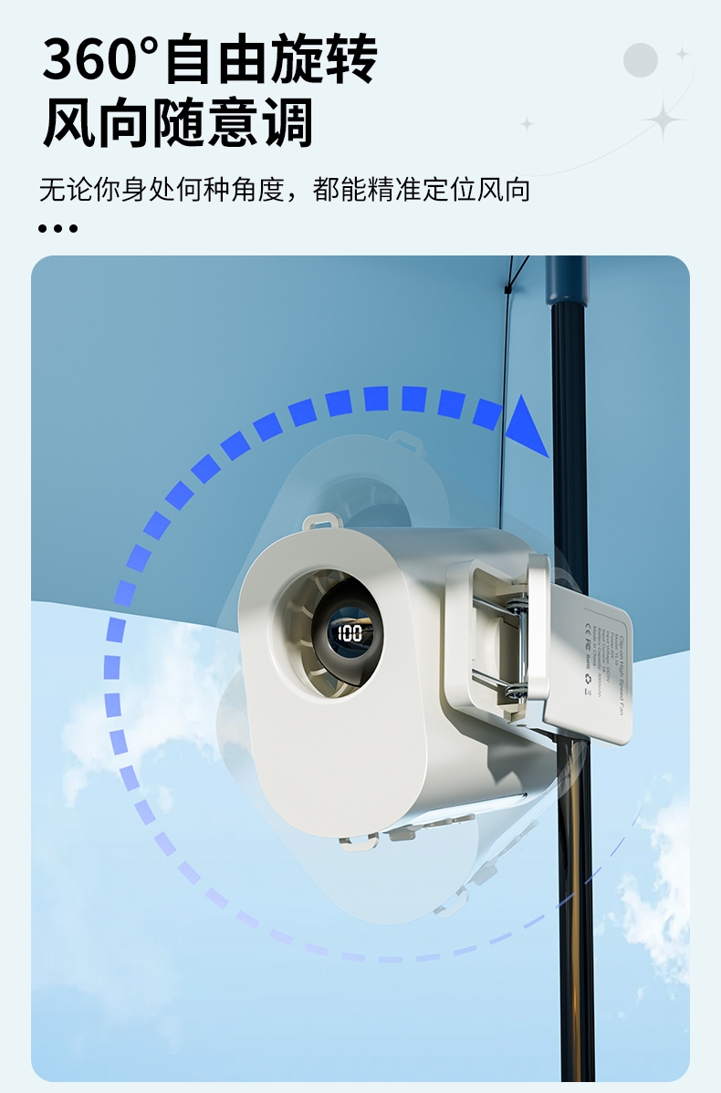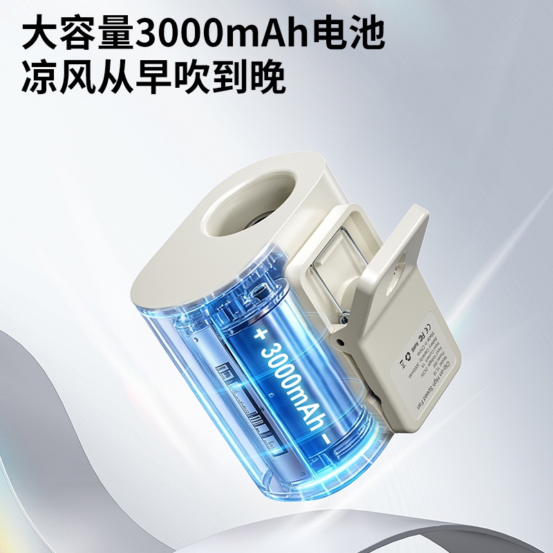 多场景便携适配,夹伞设计/挂脖/挂腰;高速出风,释放双手,轻量化设计;运行噪音小,电池持久续航