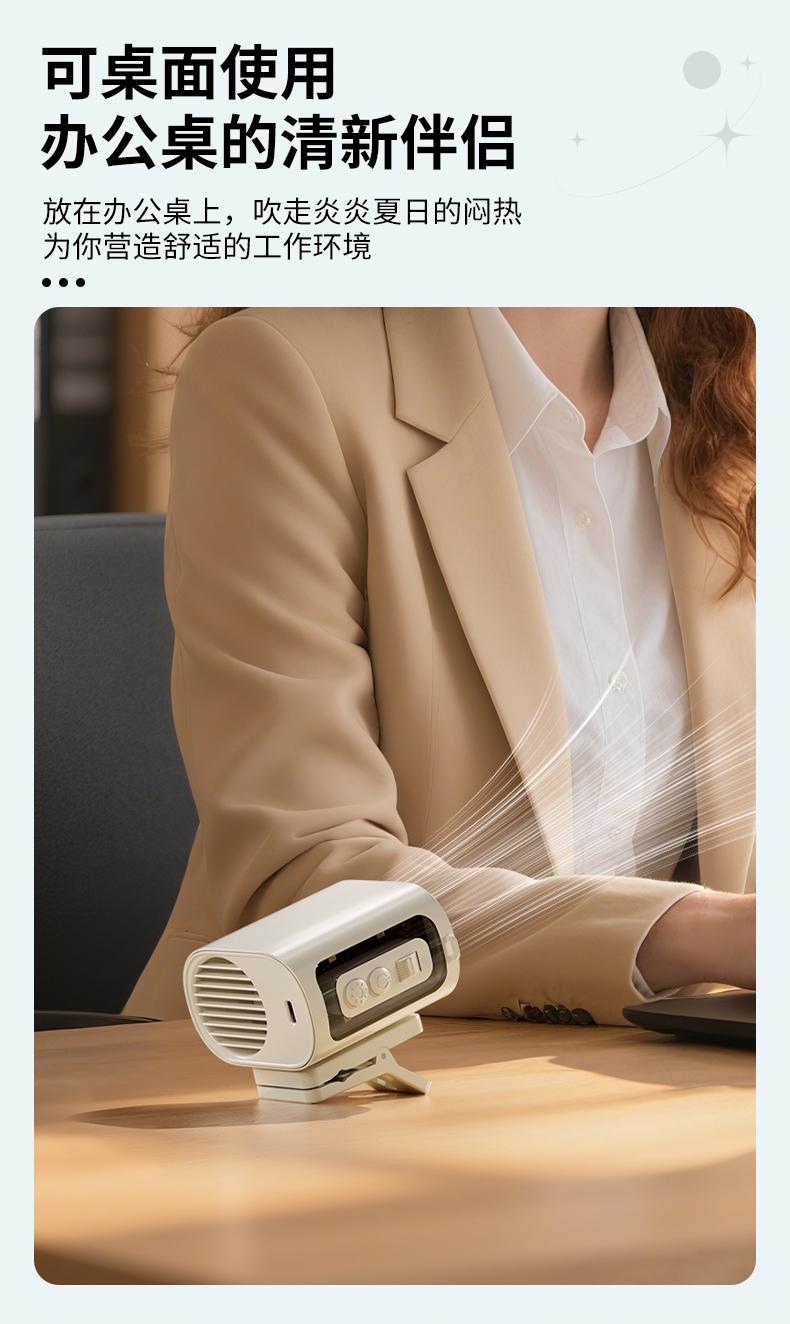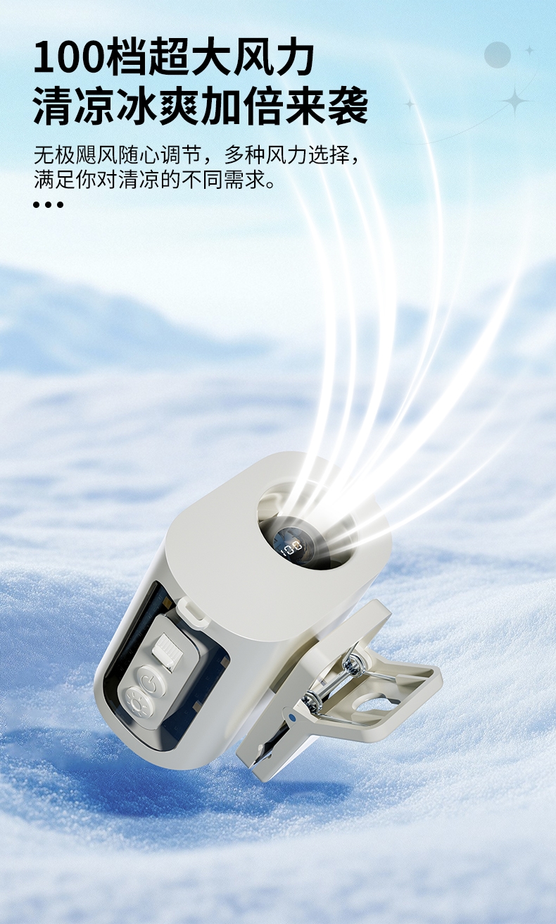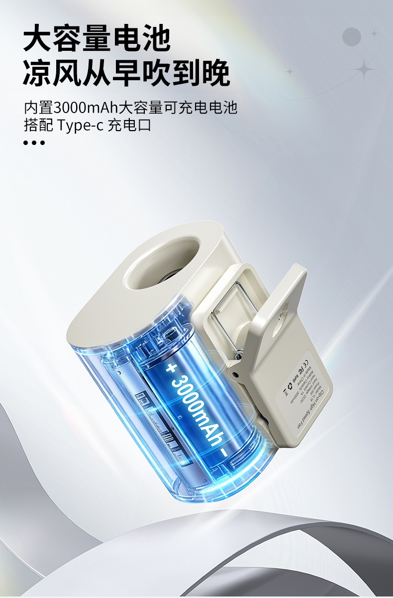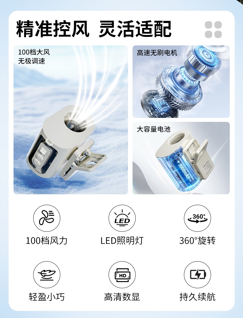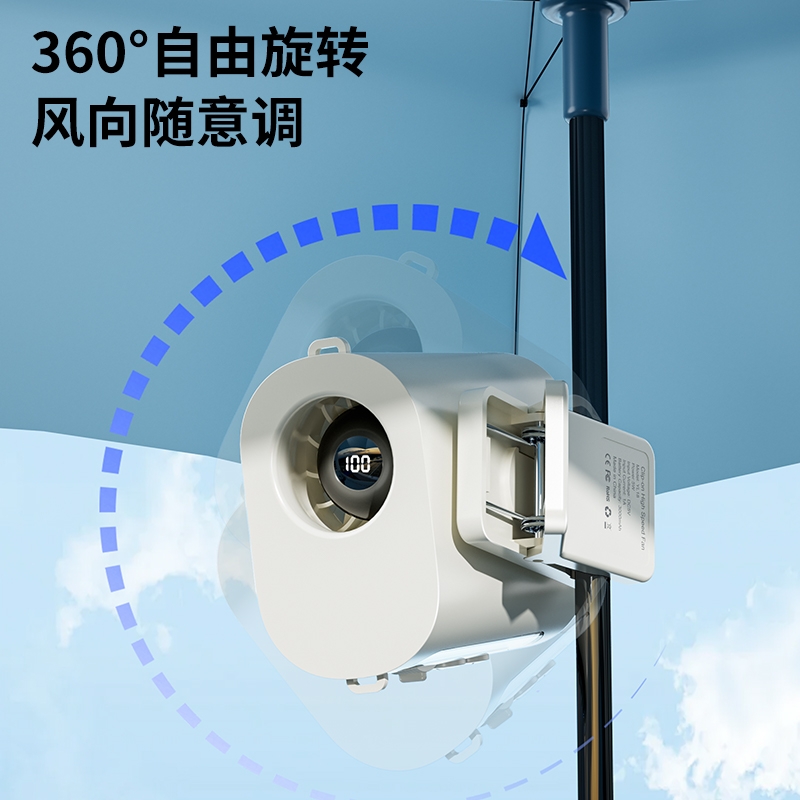 多场景便携适配,夹伞设计/挂脖/挂腰;高速出风,释放双手,轻量化设计;运行噪音小,电池持久续航