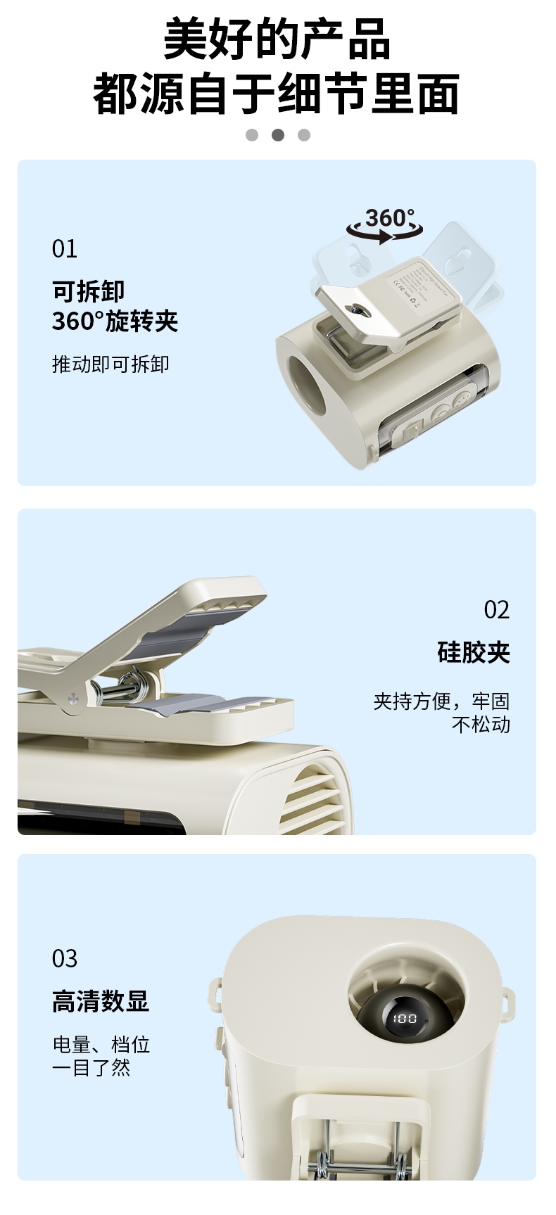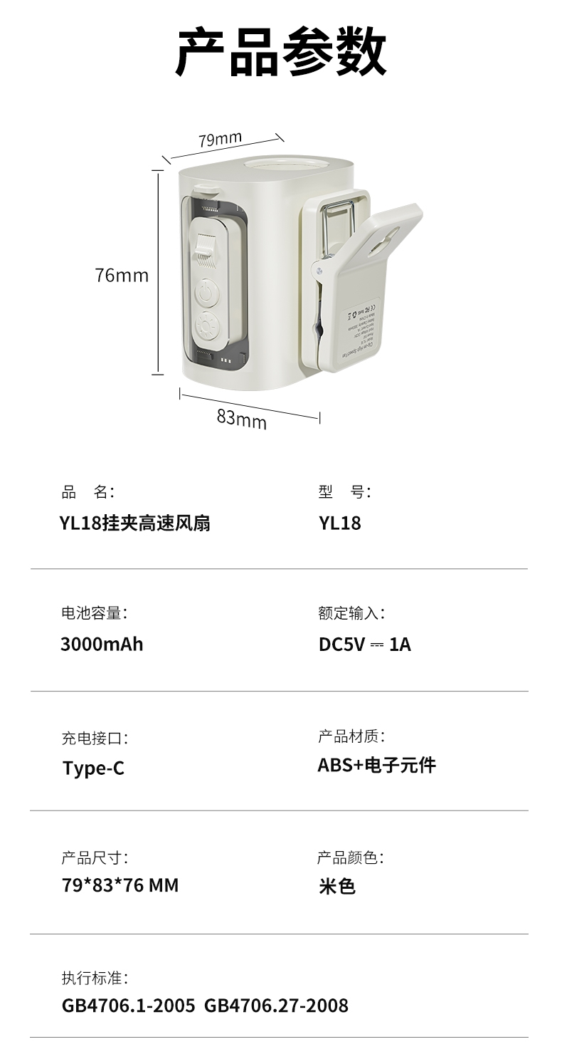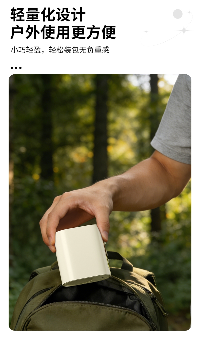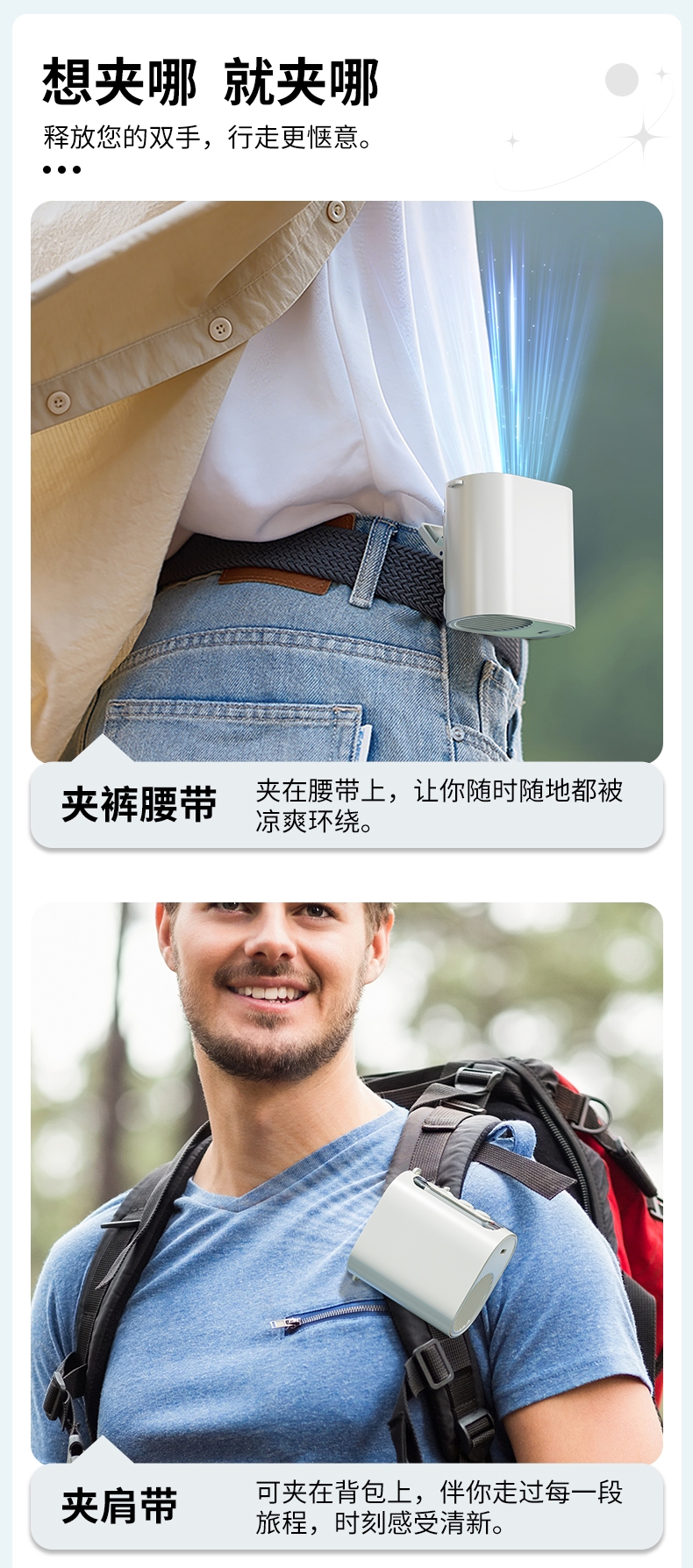 多场景便携适配,夹伞设计/挂脖/挂腰;高速出风,释放双手,轻量化设计;运行噪音小,电池持久续航
