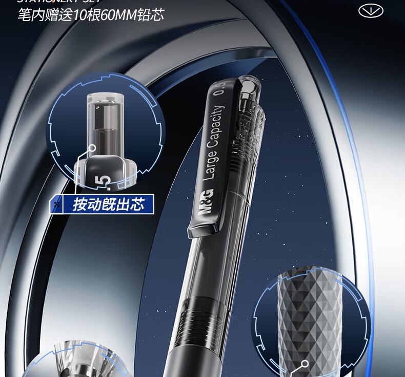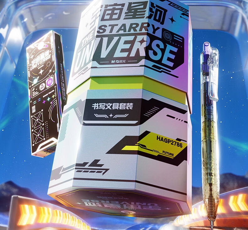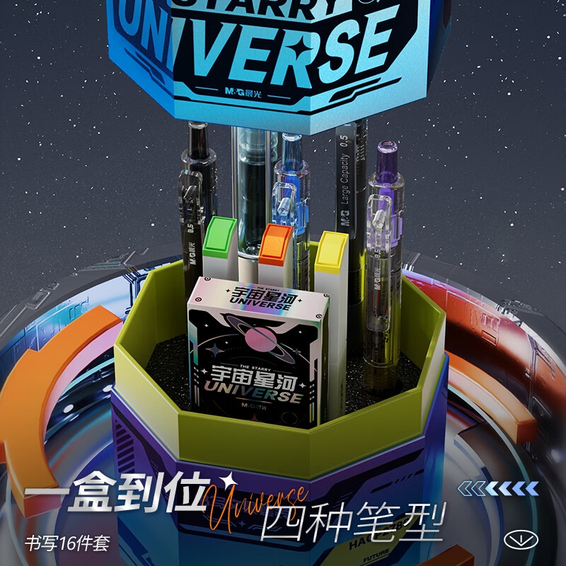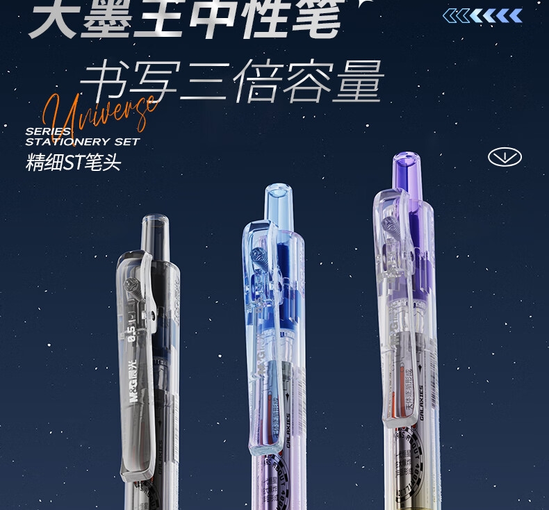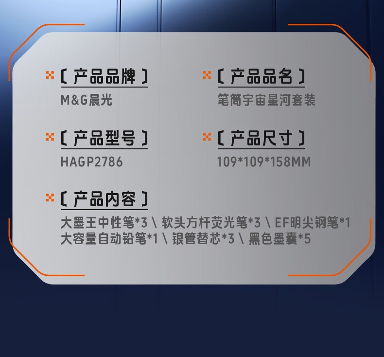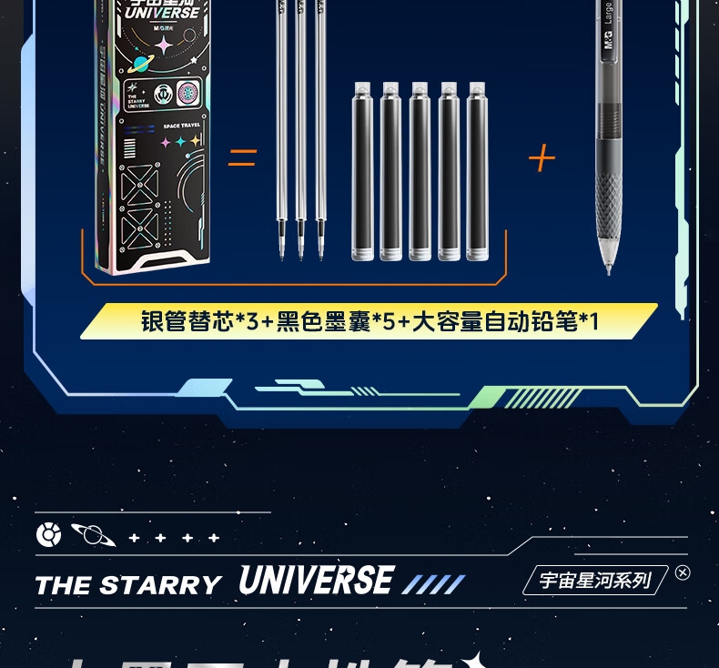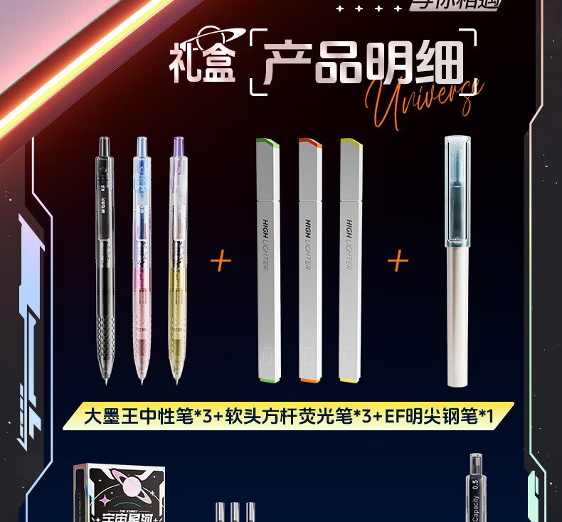 配置清单:晨光大魔王中性笔*3支 软头荧光笔*3支 EF明尖钢笔*1支 自动铅*1支 银观替芯*3支 黑色墨囊*5支