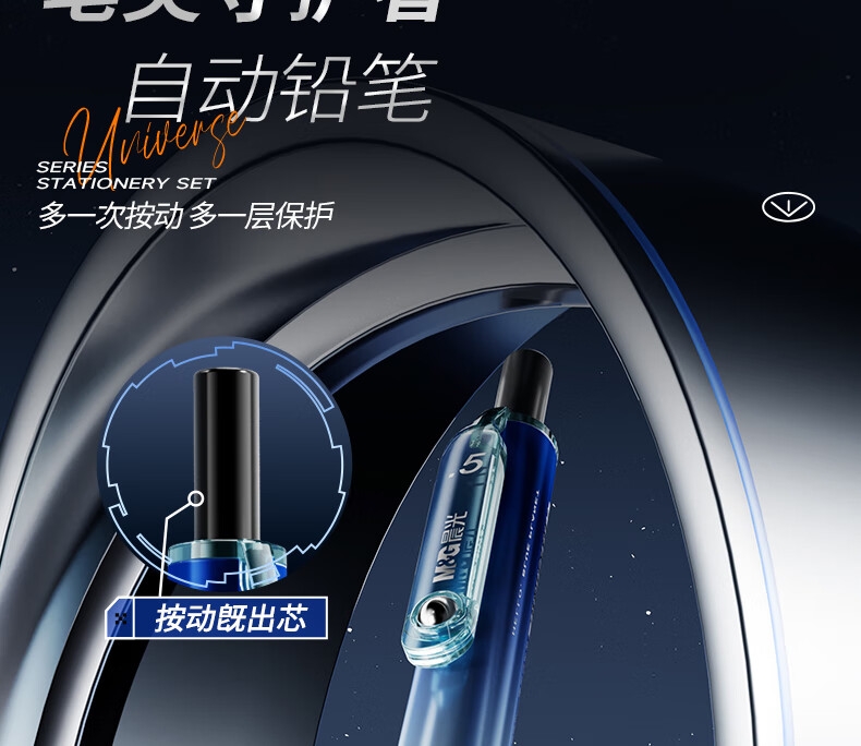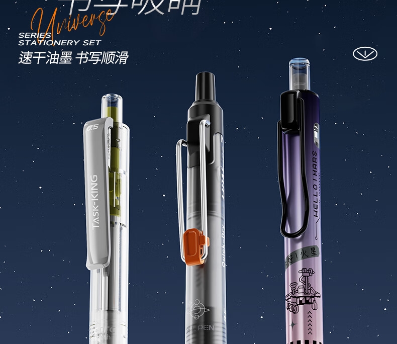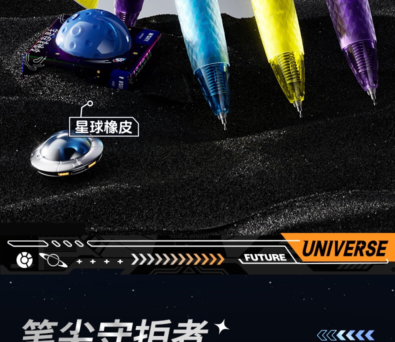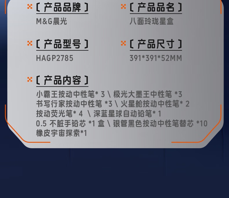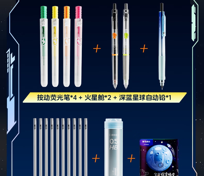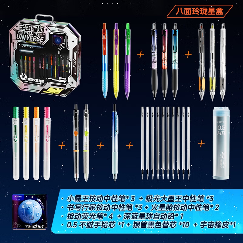 配置清单:晨光小霸王按动中性笔*3支 极光大魔王按动中性笔*3 书写行家按动中性笔*3 晨光火星舱按动中性笔*2 按动荧光笔*4 深蓝星球自动铅*1 0.5不脏手自动铅*1 银管按动替芯*10 宇宙星河橡皮*1