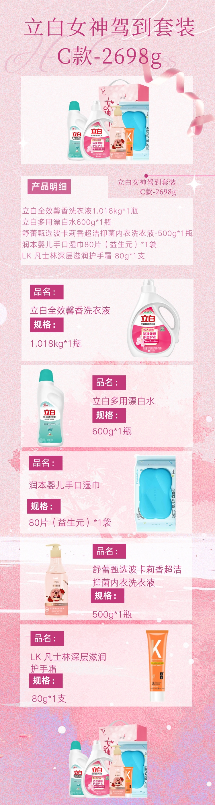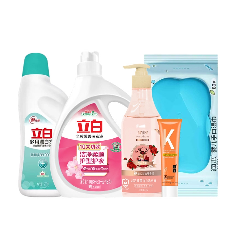 配置:立白全效馨香洗衣液1.018kg*1瓶 立白多用漂白水600g*1瓶 舒蕾甄选波卡莉香超洁抑菌内衣洗衣液-500g*1瓶 润本婴儿手口湿巾80片(益生元)*1袋 LK 凡士林深层滋润护手霜 80g*1支
