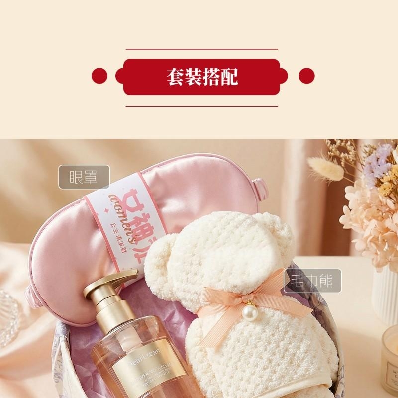 组合:女神节公主眼罩*1、独特艾琳香氛沐浴露250ML*1、菠萝格纹理创意小熊毛巾75*34CM*1