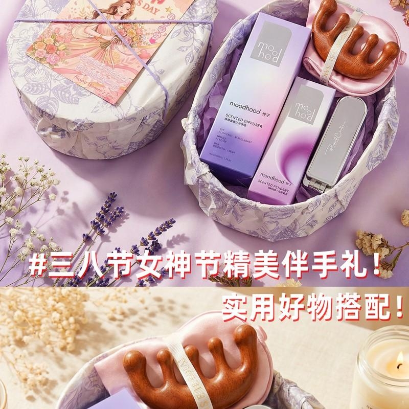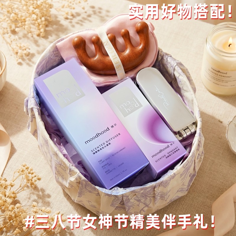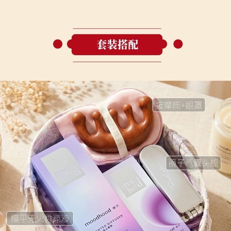 组合:moodhood石膏香挂*1、moodhood无火香氛液50ML*1、镜子气囊头梳*1、女神节公主眼罩+按摩梳组合*1