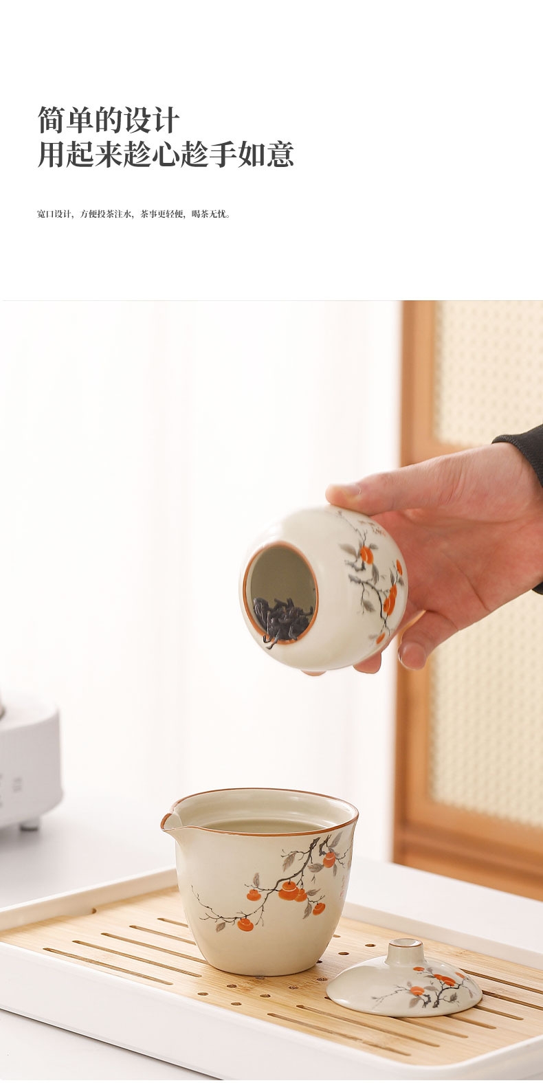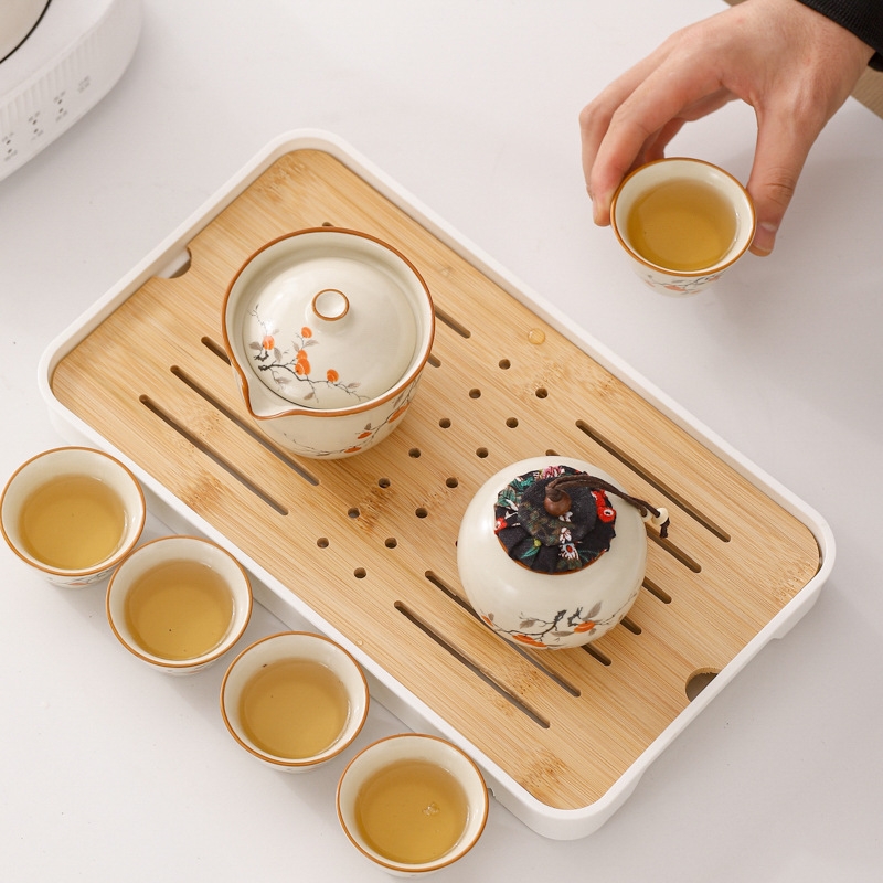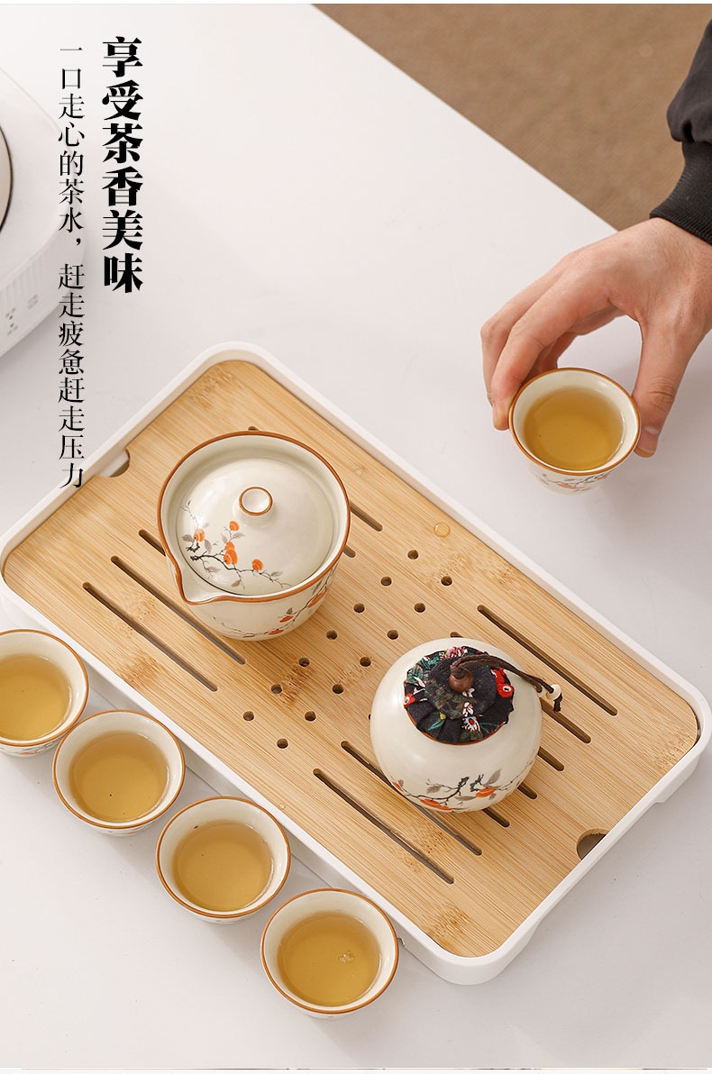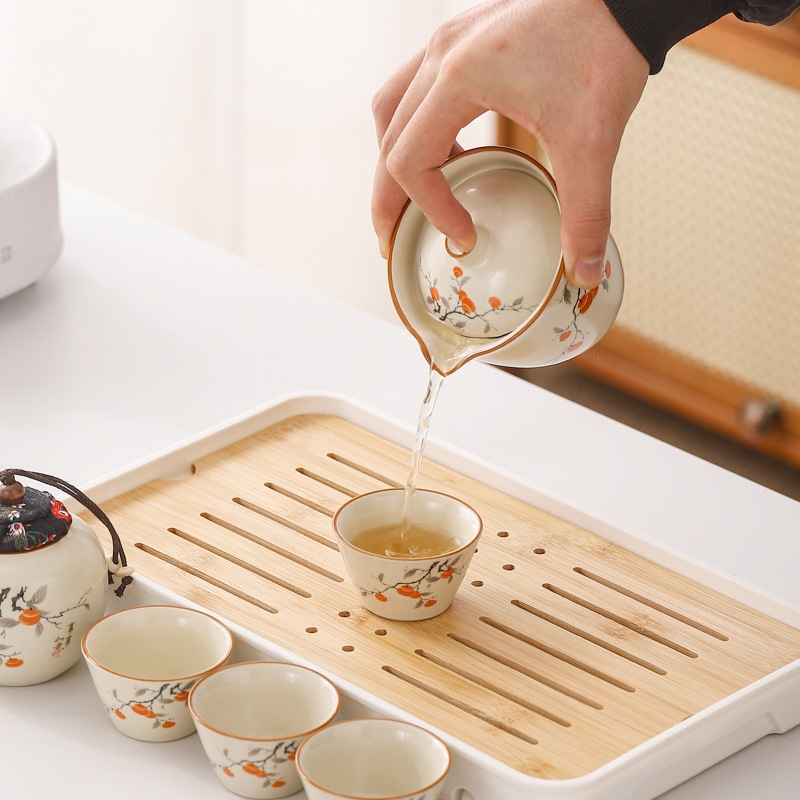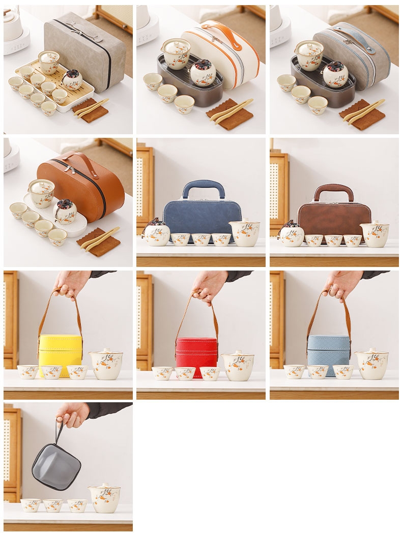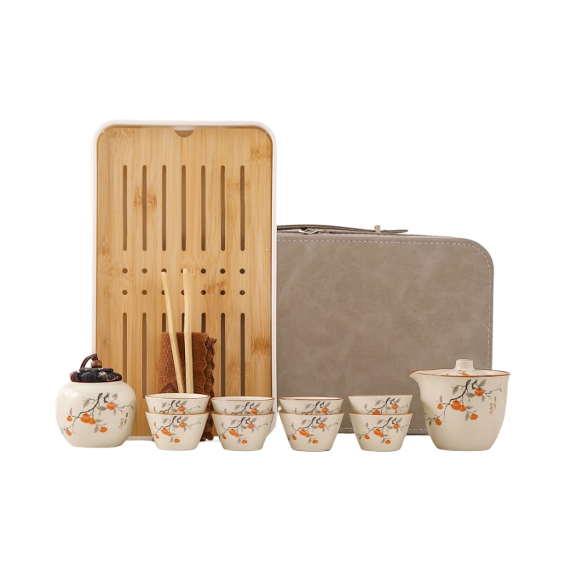 蓝色收纳包设计合理,能够将茶壶、茶杯和茶叶罐收纳;茶具表面绘有柿子图案,寓意事事如意,富有吉祥寓意;茶具表面光滑,质地细腻,优质的陶瓷材质