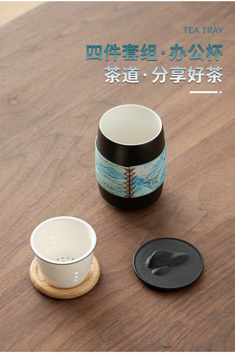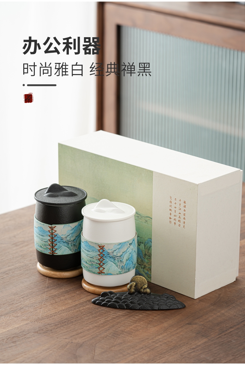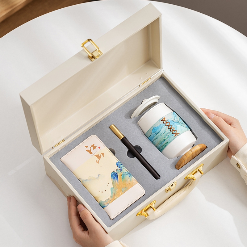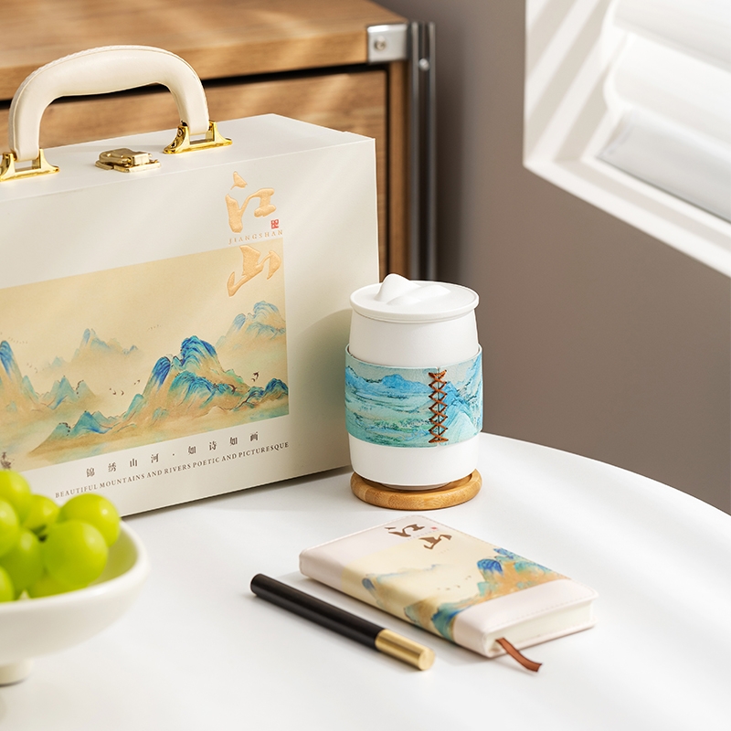 礼盒材质完美,采用千里江山融入礼盒;滤茶采用茶水分离过滤几乎没有茶渣;套装丰富有笔记本与黑笔