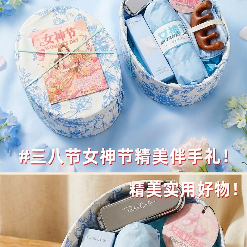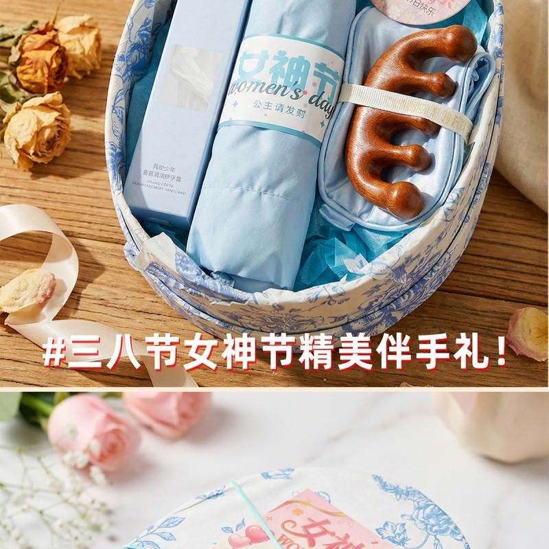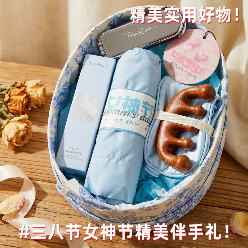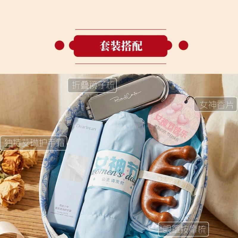 组合:镜子折叠头梳*1、女神节香片香挂*1、女神节胶囊防晒伞*1、独特艾琳香氛护手霜35g*1、女神节公主眼罩+经络按摩头梳组合*1