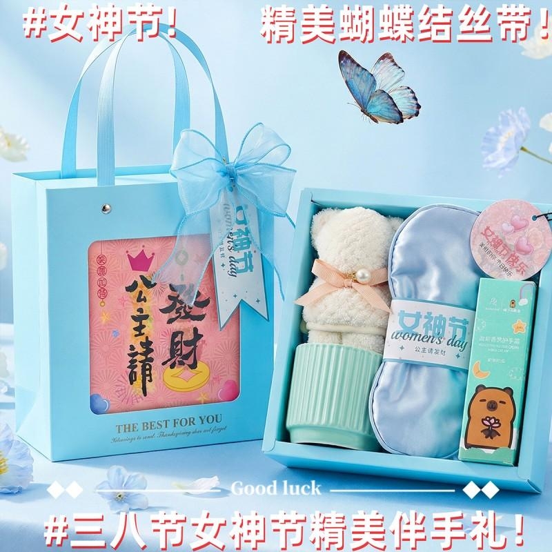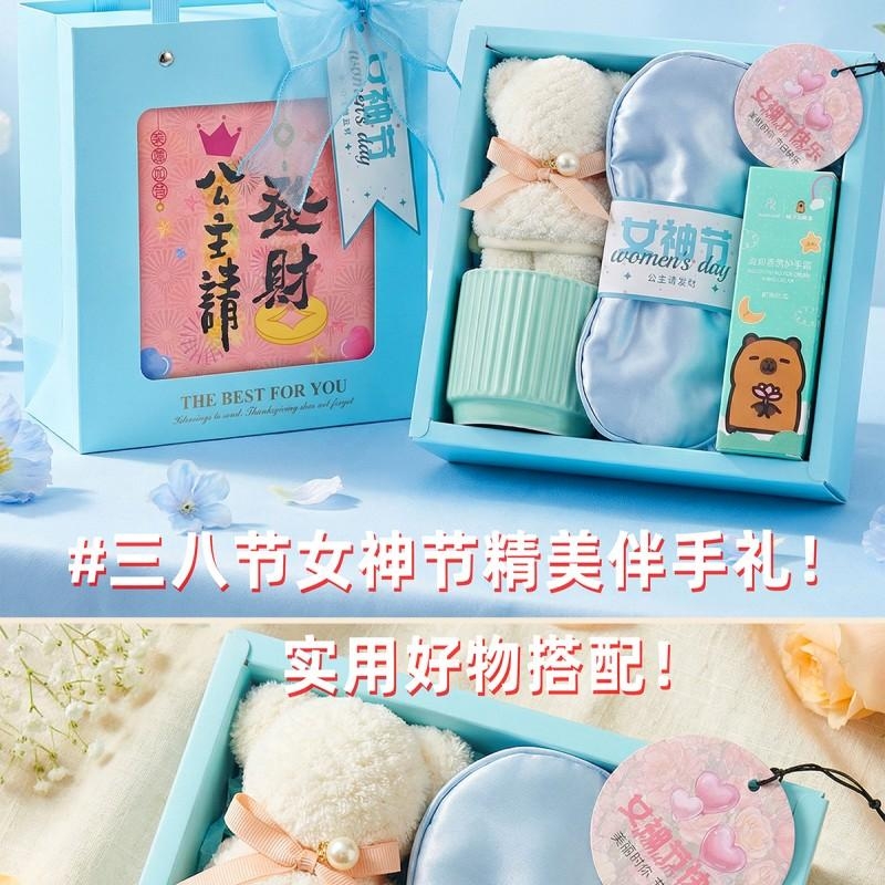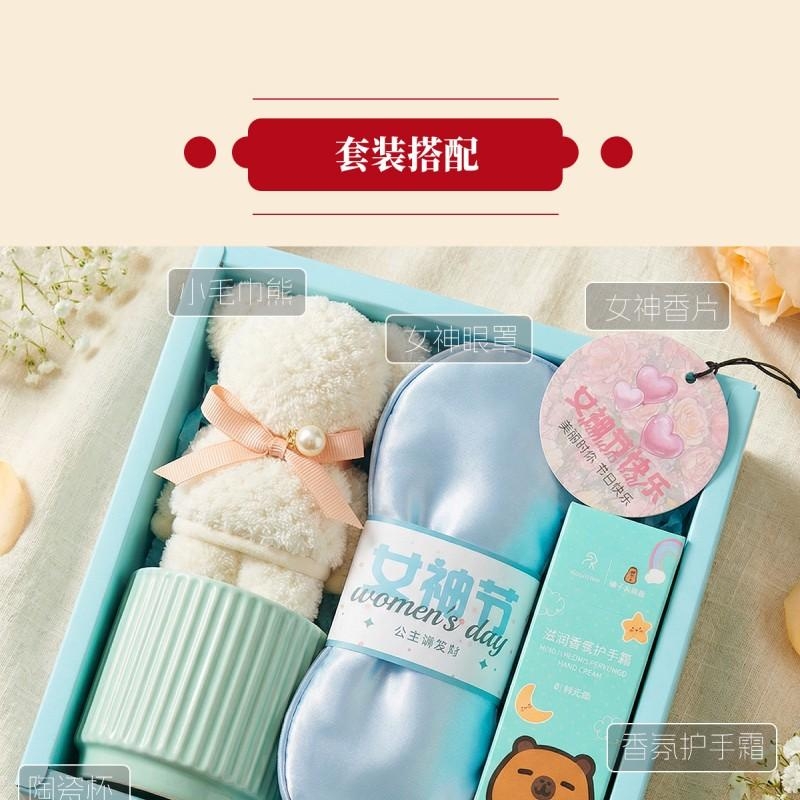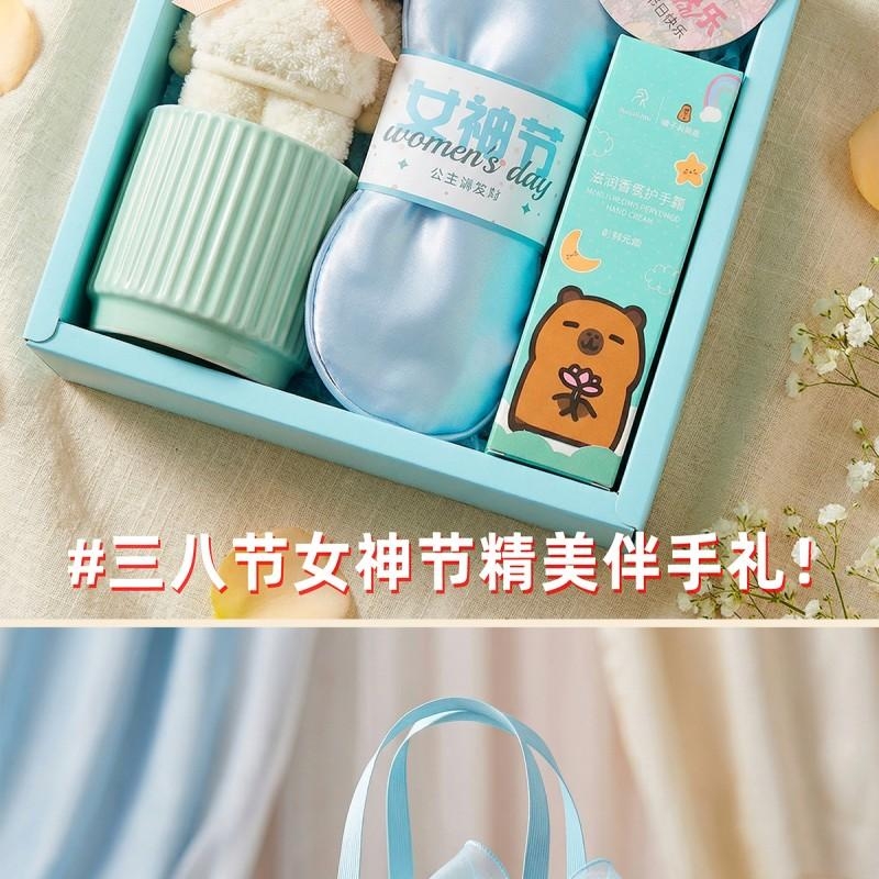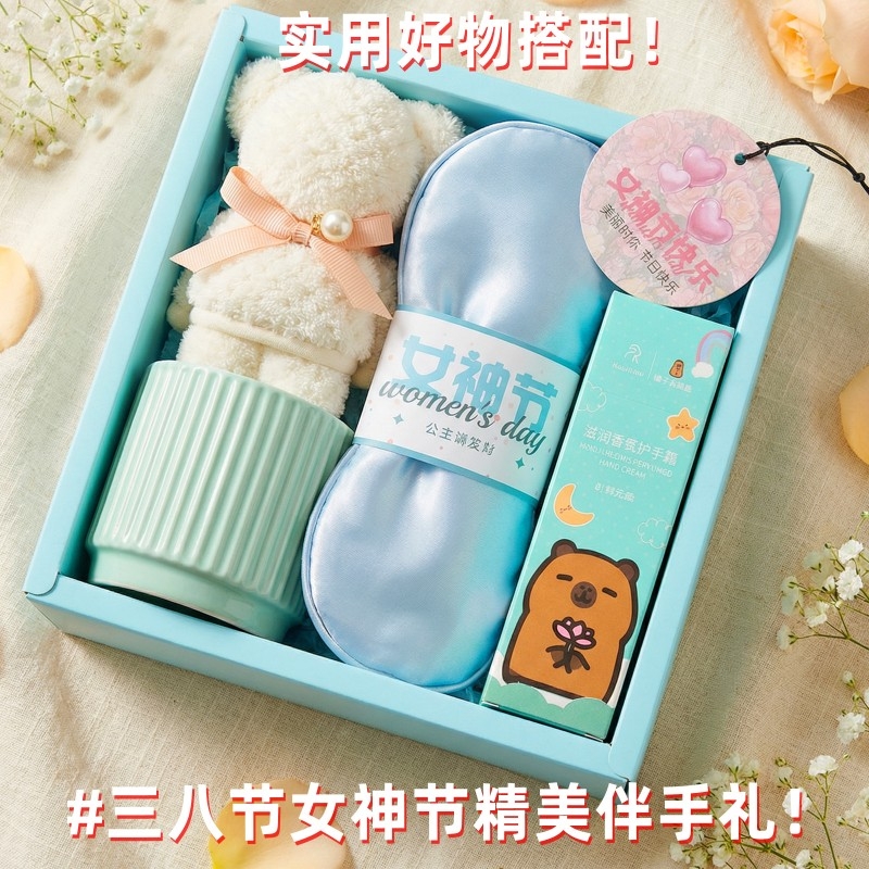 组合:公主陶瓷杯*1、女神节公主眼罩*1、女神节香片香挂*1、韩方莉水润护手霜60g*1、菠萝格纹理创意小熊毛巾30*30CM