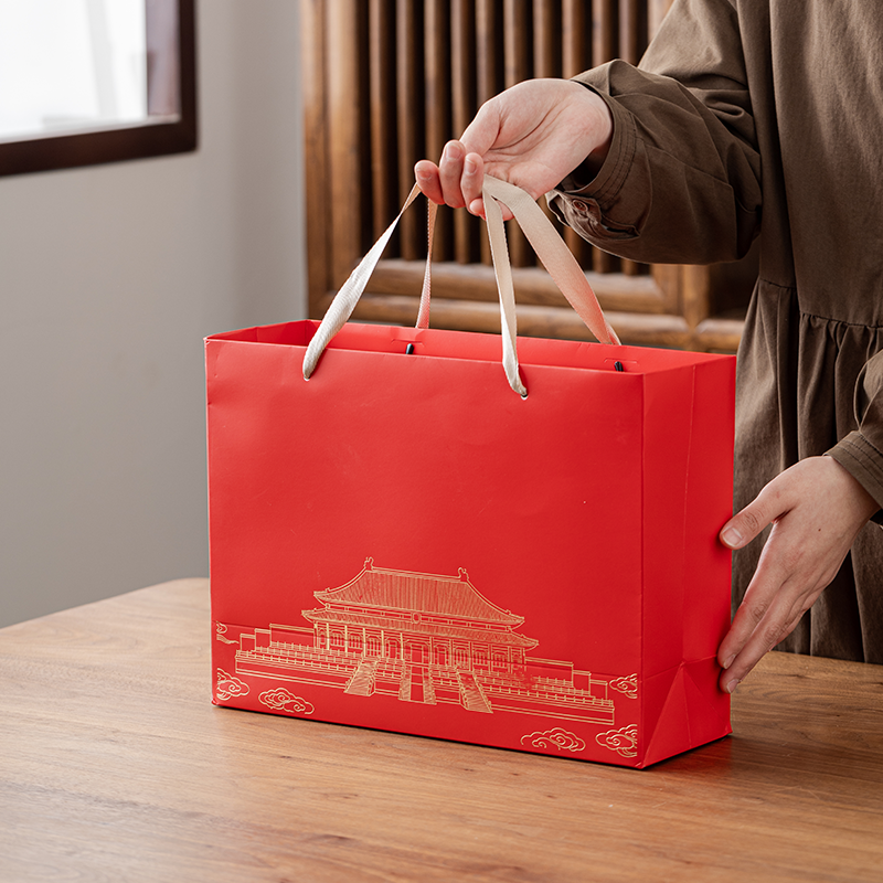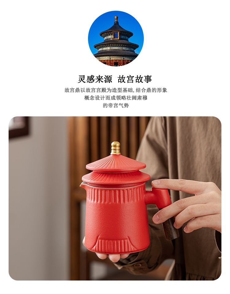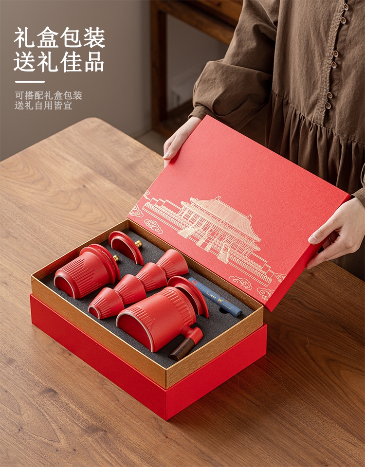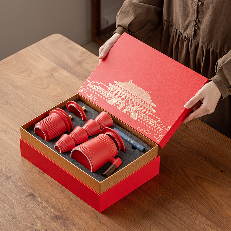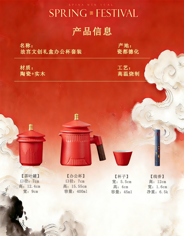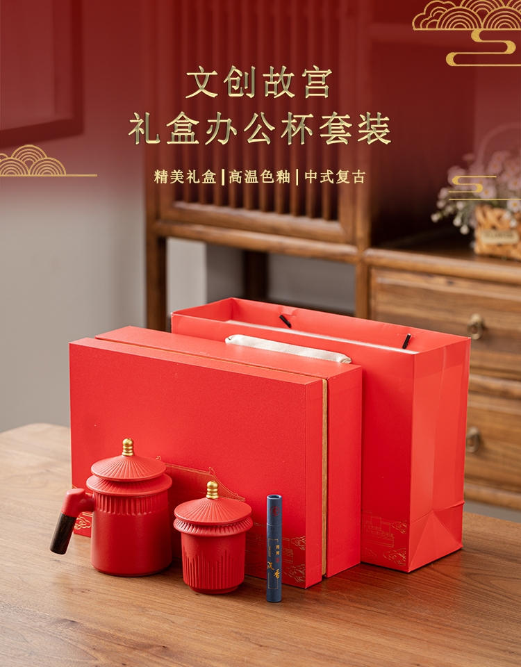 故宫元素为设计灵感,礼盒上印有故宫建筑图案;套装包含办公杯、茶杯、茶叶罐和线香,功能齐全;配备专属的红色礼盒和礼袋,设计精致大气