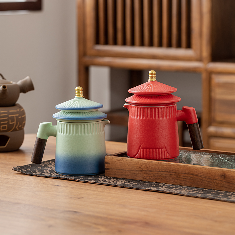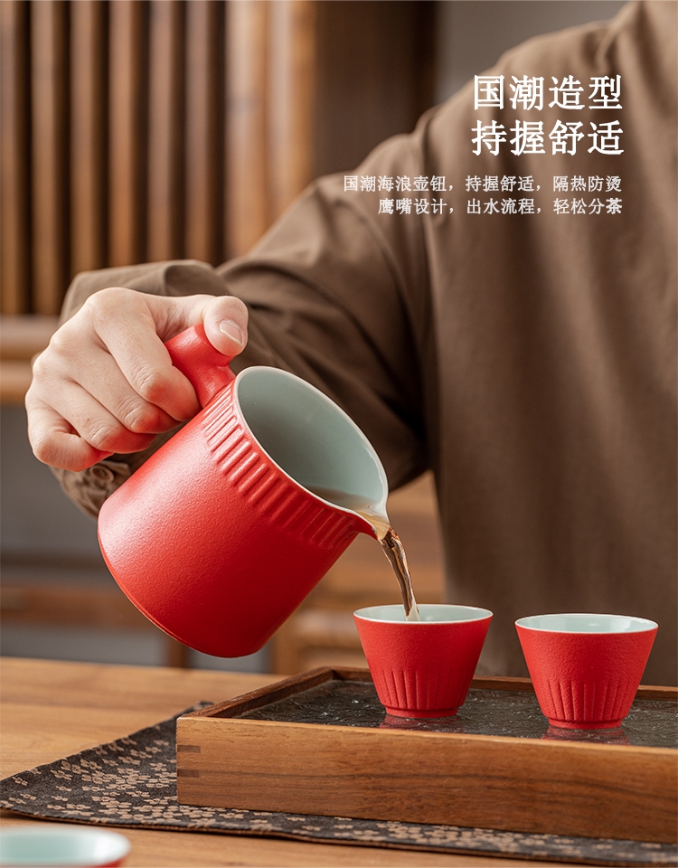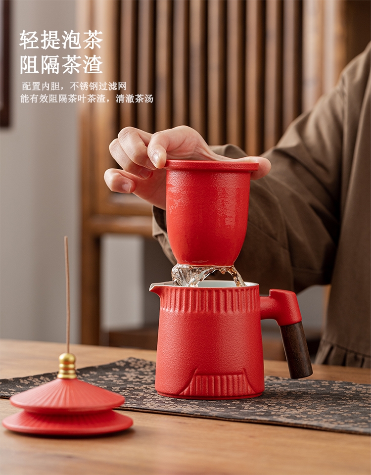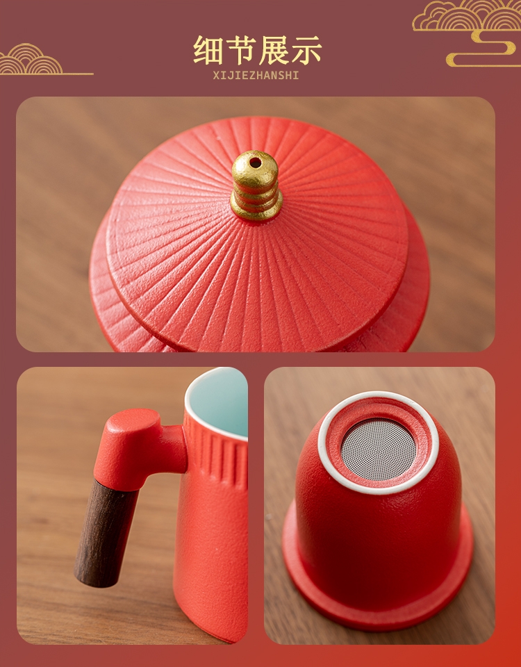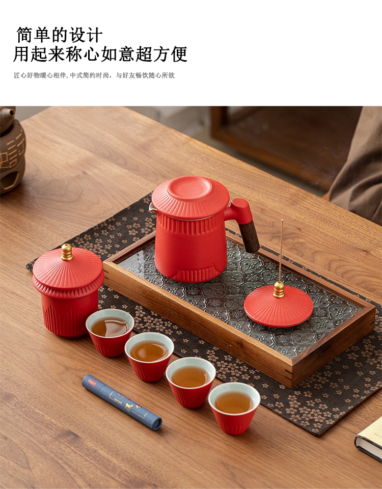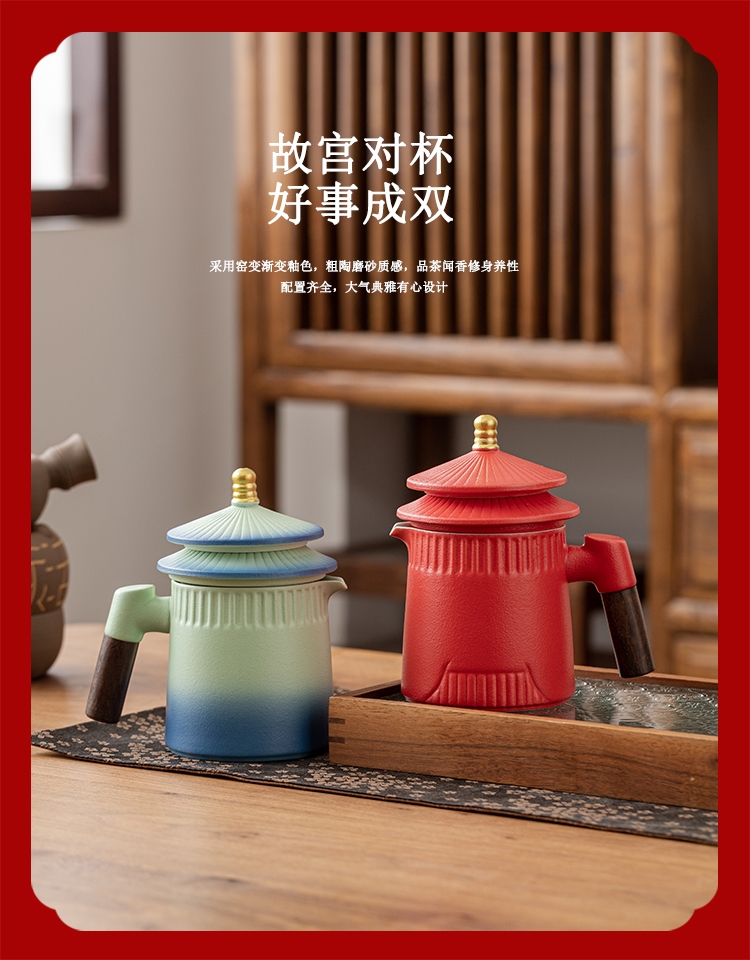 故宫元素为设计灵感,礼盒上印有故宫建筑图案;套装包含办公杯、茶杯、茶叶罐和线香,功能齐全;配备专属的红色礼盒和礼袋,设计精致大气
