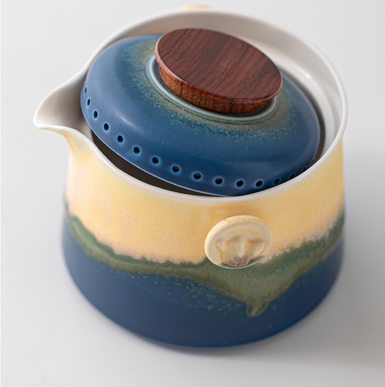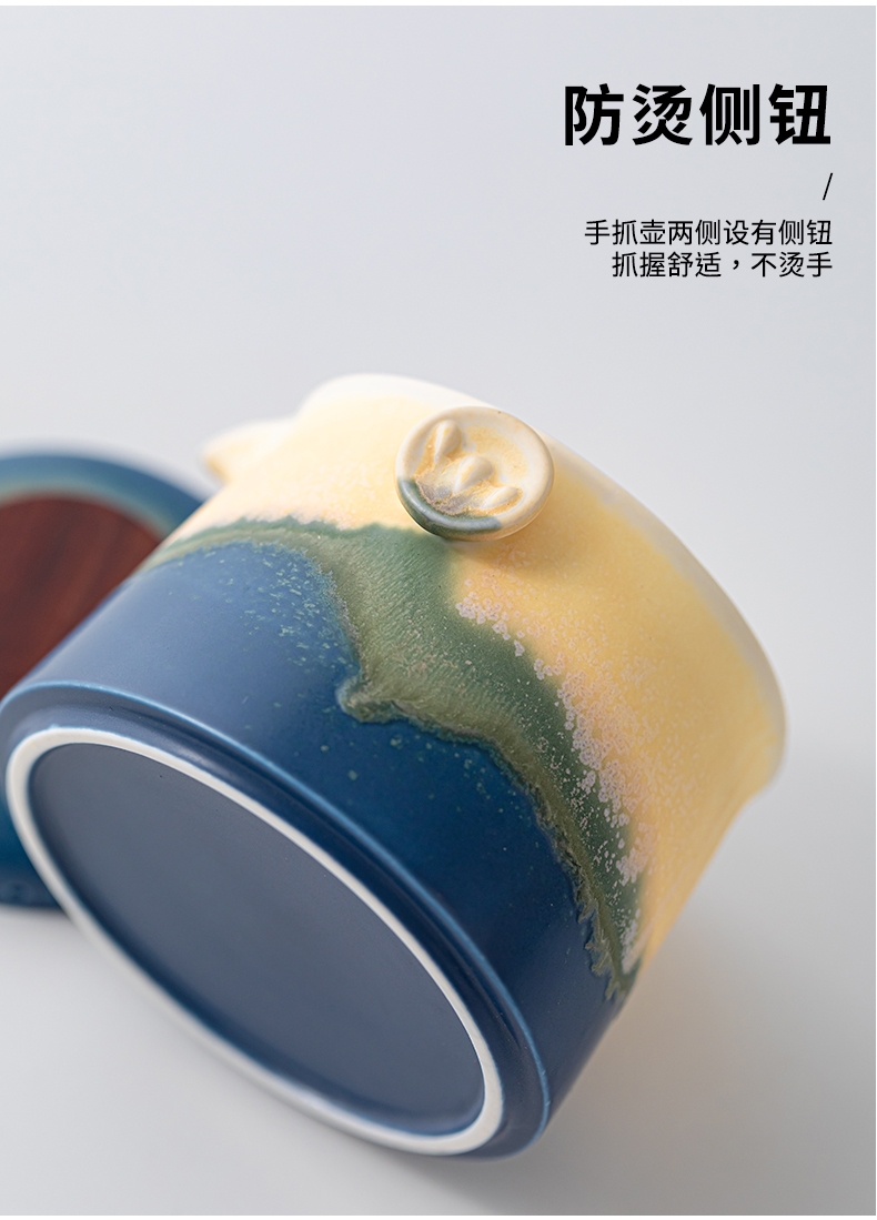 采用青绿山水渐变釉色,如千里江山图般层次分明; 壶身浮雕山水纹,搭配复古木盖兼具艺术感与东方韵味;高温陶瓷烧制,釉面细腻不吸味,食品级安全标准