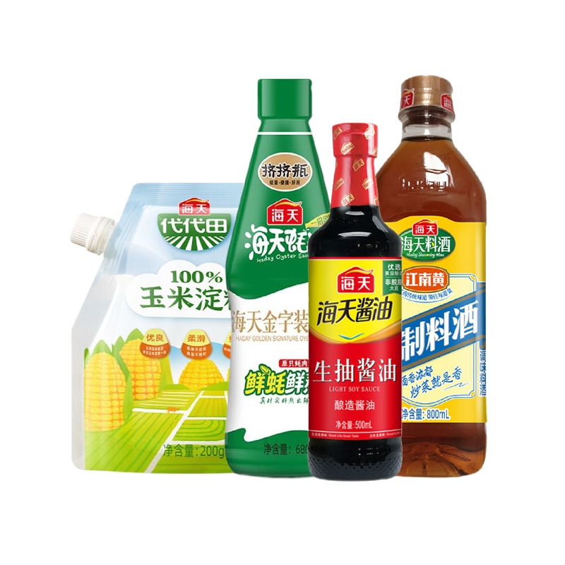 配置:海天生抽酱油500mL(PET瓶)*1瓶 海天精制料酒800mL(PET瓶)*1瓶 海天金字装蚝油680g(PET瓶)*1瓶 海天玉米淀粉200g*1袋