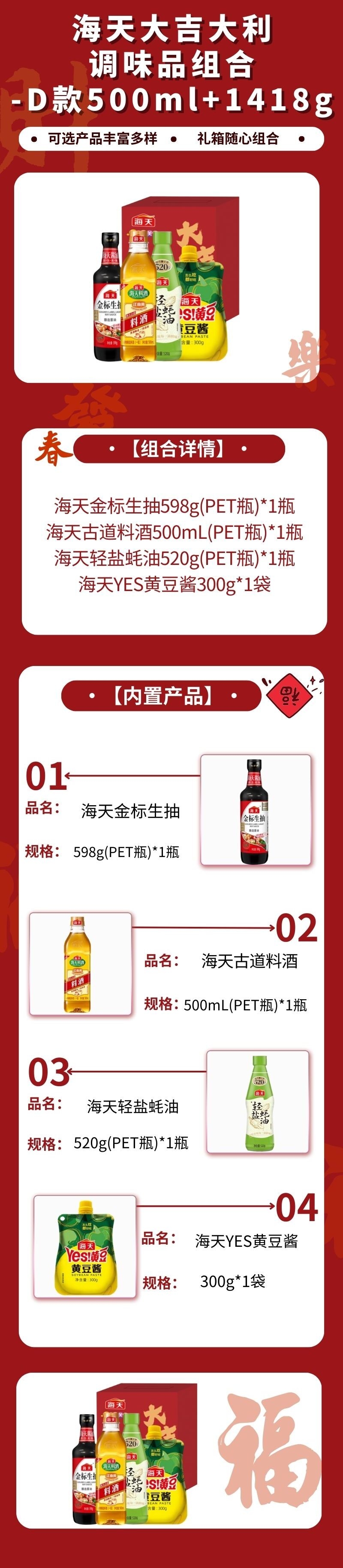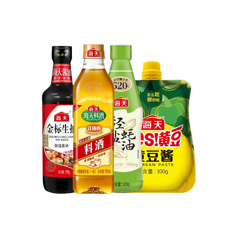 配置:海天金标生抽598g(PET瓶)*1瓶 海天古道料酒500mL(PET瓶)*1瓶 海天轻盐蚝油520g(PET瓶)*1瓶 海天YES黄豆酱300g*1袋