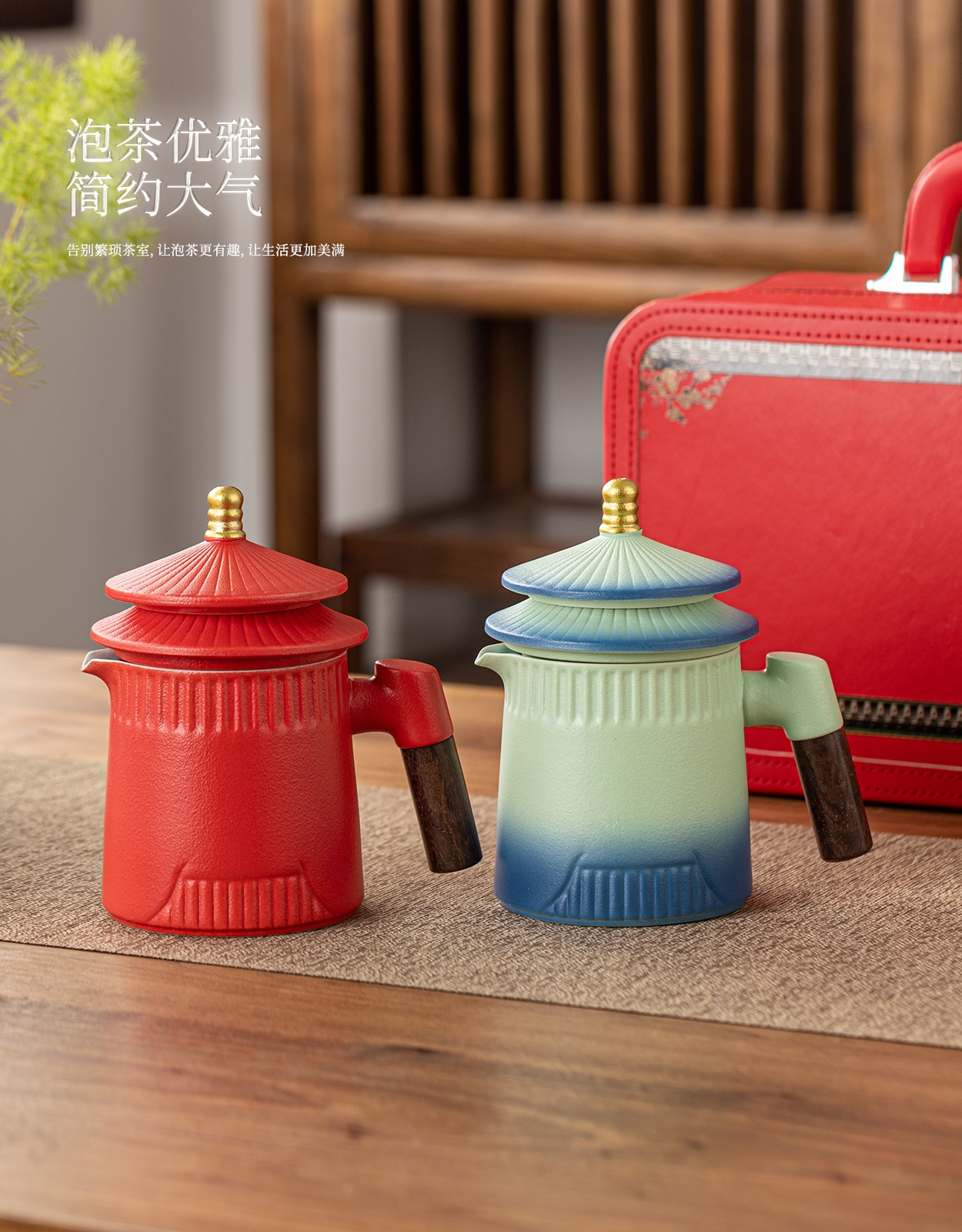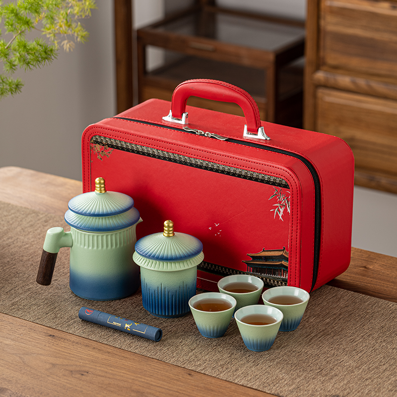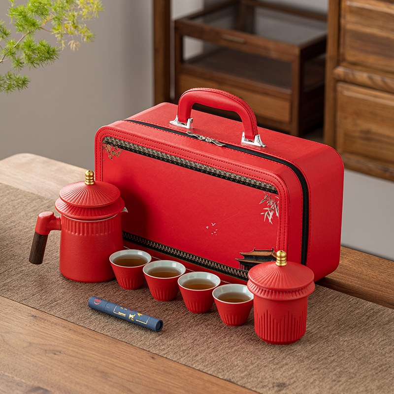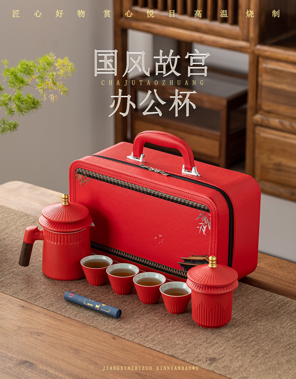 故宫红配色,自带国潮氛围感,颜值吸睛;皮质手提礼盒,质感高级,送礼体面过人;一壶两杯四盏,配置齐全,满足多人品茗