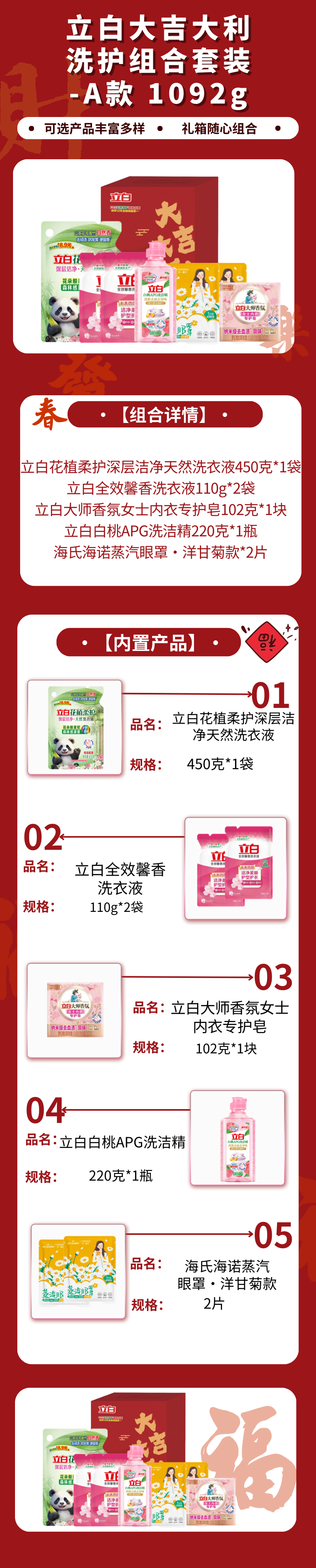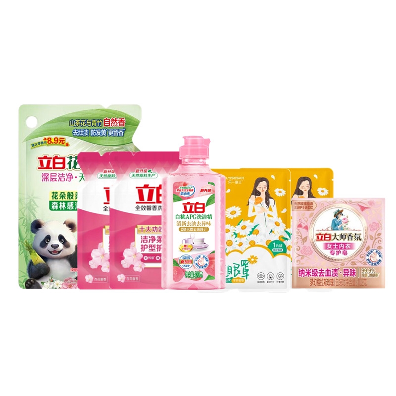 配置:立白花植柔护深层洁净天然洗衣液450克*1袋 立白全效馨香洗衣液110g*2袋 立白大师香氛女士内衣专护皂102克*1块 立白白桃APG洗洁精220克*1瓶 海氏海诺蒸汽眼罩·洋甘菊款*2片