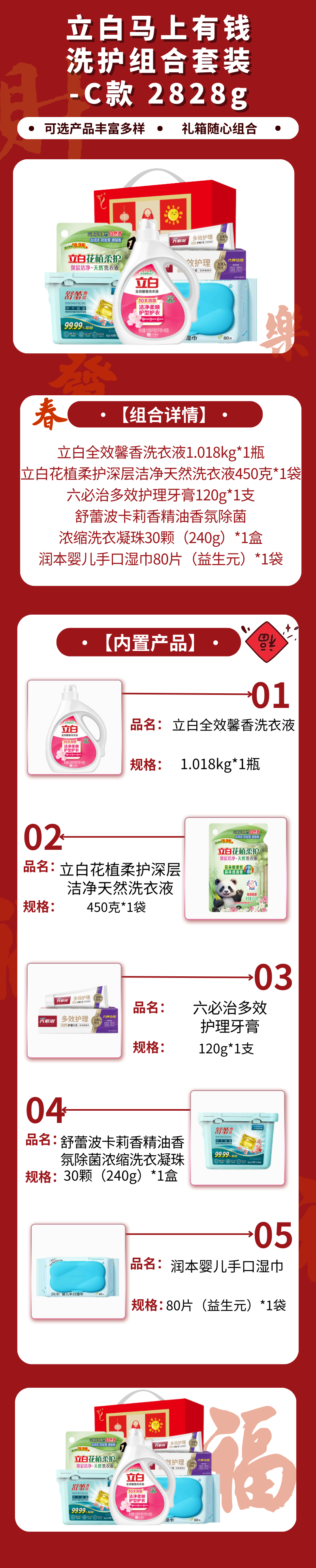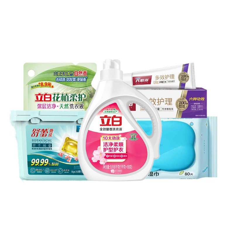 配置:立白全效馨香洗衣液1.018kg*1瓶 立白花植柔护深层洁净天然洗衣液450克*1袋 六必治多效护理牙膏120g*1支 舒蕾波卡莉香精油香氛除菌浓缩洗衣凝珠30颗(240g)*1盒 润本婴儿手口湿巾80片(益生元)*1袋