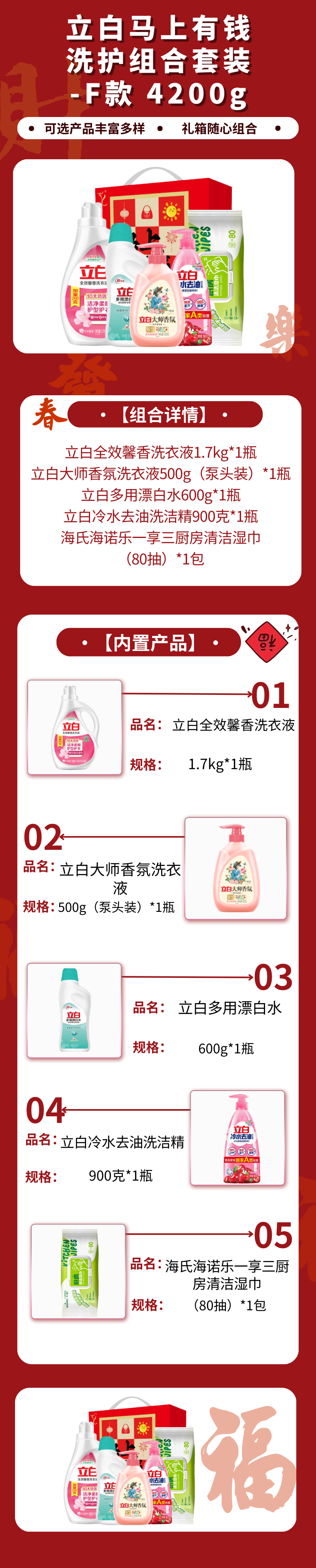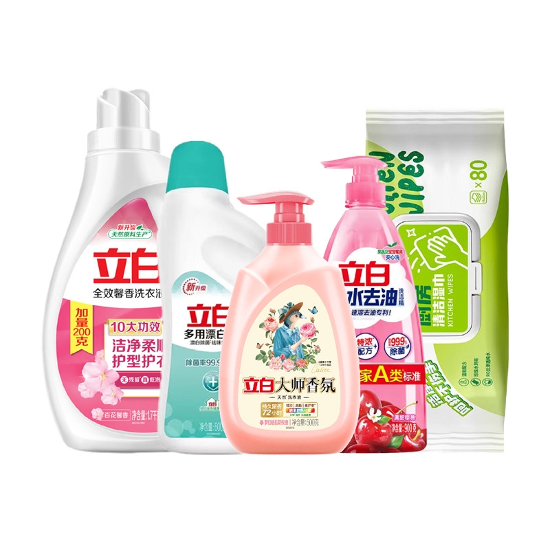 配置:立白全效馨香洗衣液1.7kg*1瓶 立白大师香氛洗衣液500g(泵头装)*1瓶 立白多用漂白水600g*1瓶 立白冷水去油洗洁精900克*1瓶 海氏海诺乐一享三厨房清洁湿巾(80抽)*1包