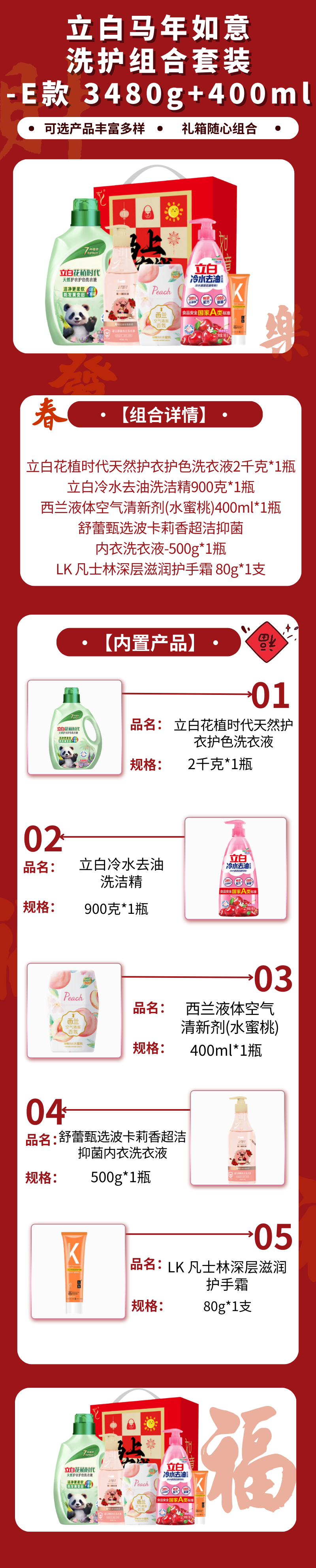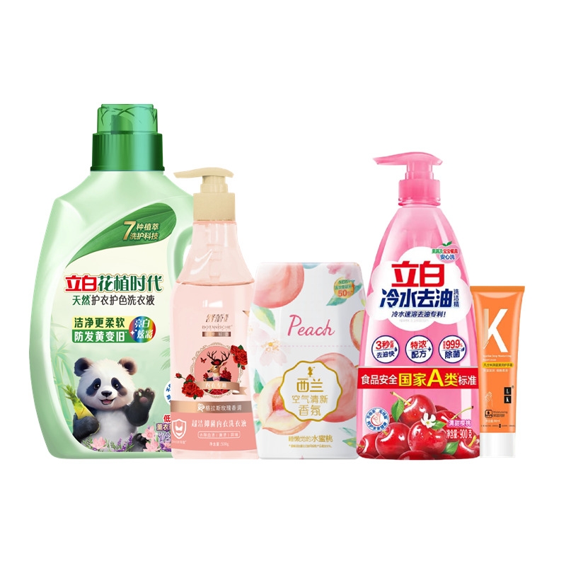 配置:立白花植时代天然护衣护色洗衣液2千克*1瓶 立白冷水去油洗洁精900克*1瓶 西兰液体空气清新剂(水蜜桃)400ml*1瓶 舒蕾甄选波卡莉香超洁抑菌内衣洗衣液-500g*1瓶 LK 凡士林深层滋润护手霜 80g*1支