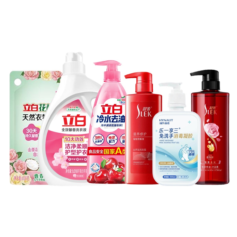 配置:立白全效馨香洗衣液1.018kg*1瓶 立白冷水去油洗洁精900克*1瓶 立白花植柔护天然衣物柔顺剂400克*1袋 舒蕾滋养修护山茶花洗发露 510g*1瓶 舒蕾恒美水光植萃精油沐浴露 510g*1瓶 海氏海诺免洗手消毒凝胶方瓶500ml*1瓶