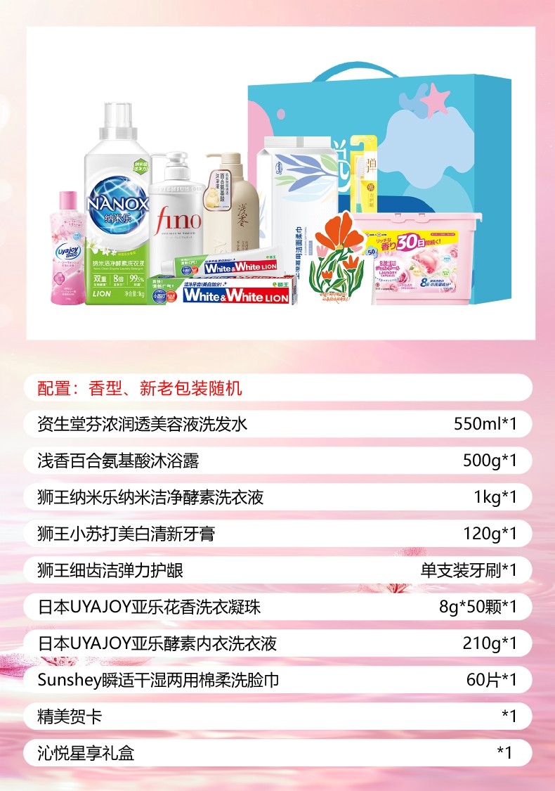 配置清单:资生堂芬浓润透美容液洗发水550ml*1 浅香百合氨基酸沐浴露500g*1 狮王(Lion)纳米乐纳米洁净酵素洗衣液1kg*1 狮王(Lion)小苏打美白清新牙膏120g*1 狮王(Lion)细齿洁弹力护龈单支装牙刷*1 日本UYAJOY亚乐花香洗衣凝珠8g*50颗*1 日本UYAJOY亚乐酵素内衣洗衣液210g*1 Sunshey瞬适干湿两用棉柔洗脸巾60片*1 精美贺卡*1(量大可定制) 沁悦星享礼盒*1