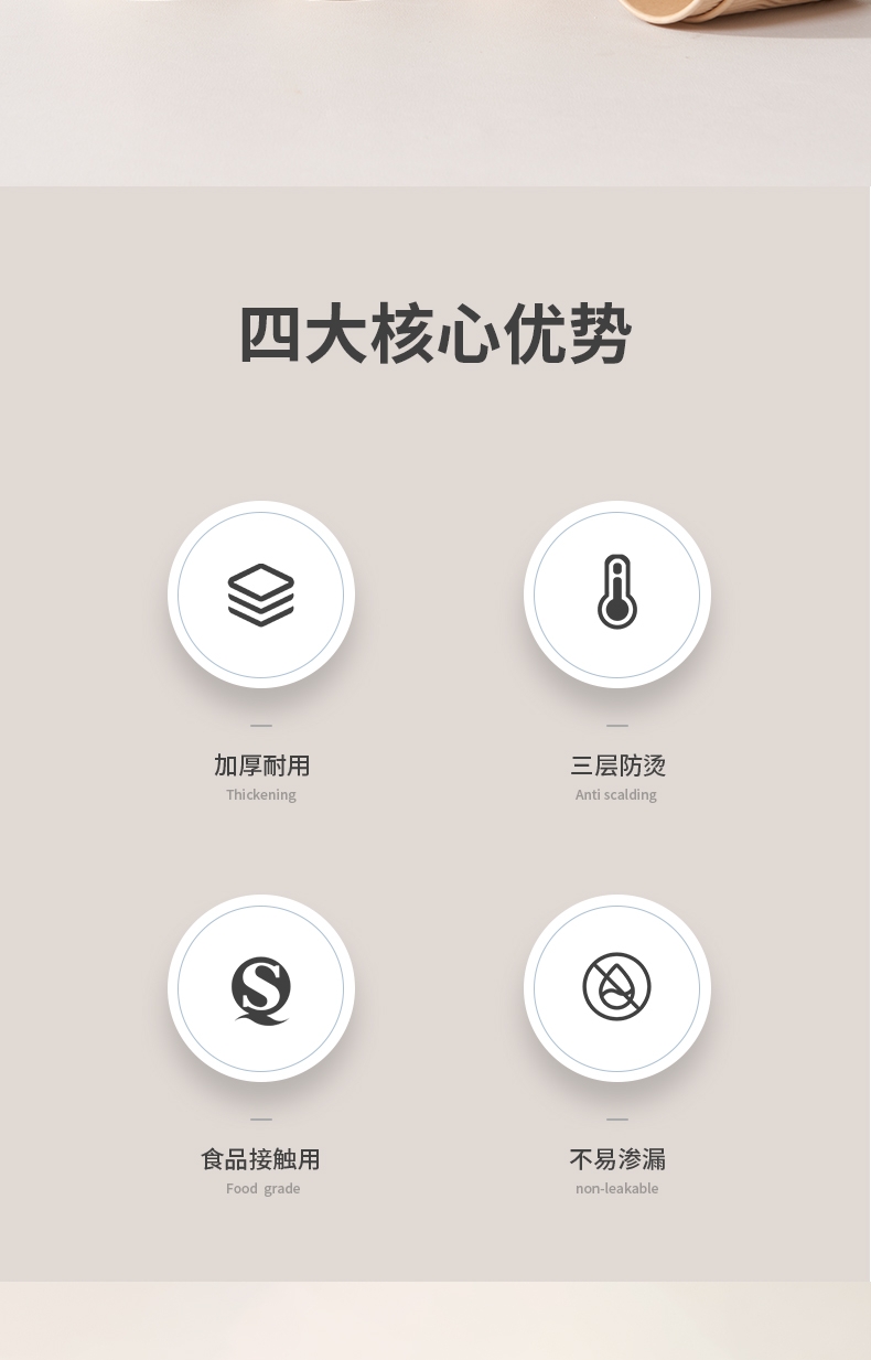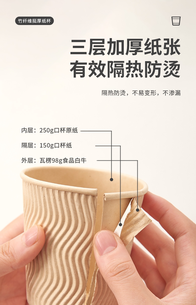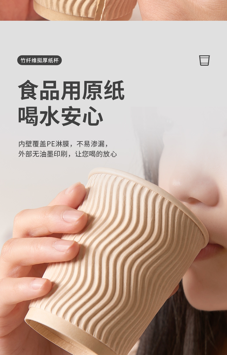 原生竹浆纸 泡茶无异味;厚实挺立 热水冲泡不变形;杯身加厚硬挺 不怕高温 不易变形