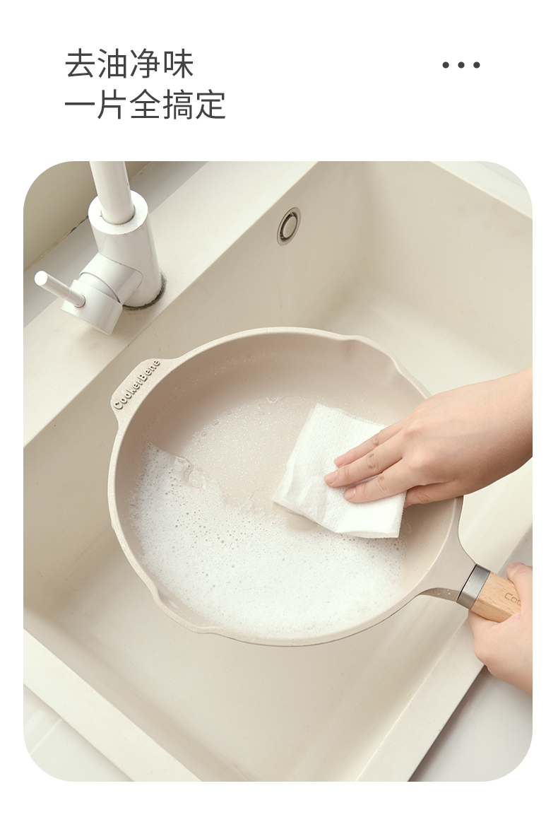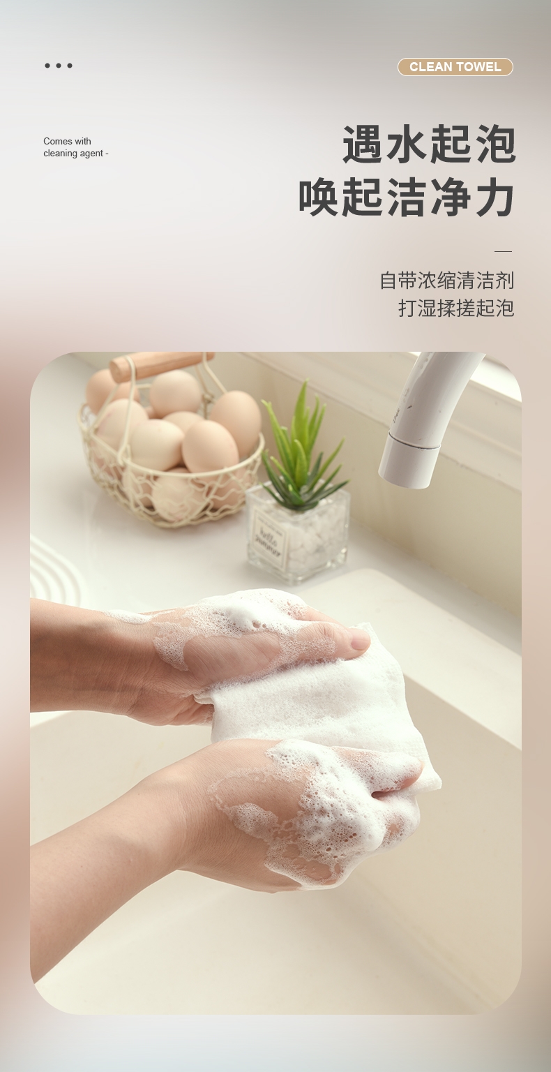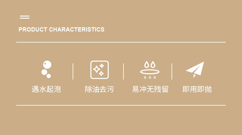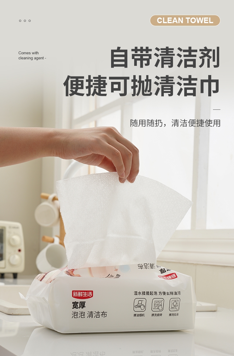 自带清洁剂 便捷可抛清洁巾;遇水起泡 唤起洁净力;一抹即净 轻松去油污