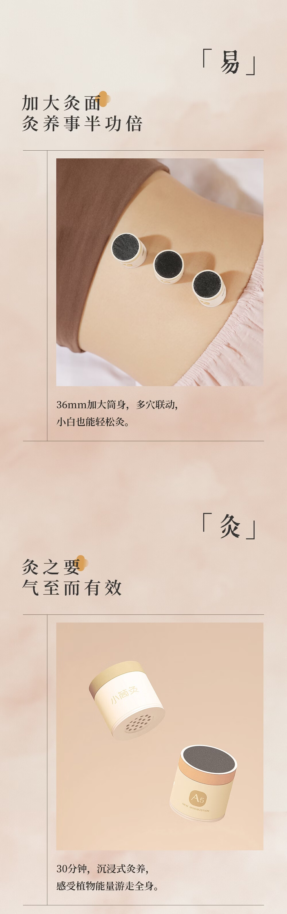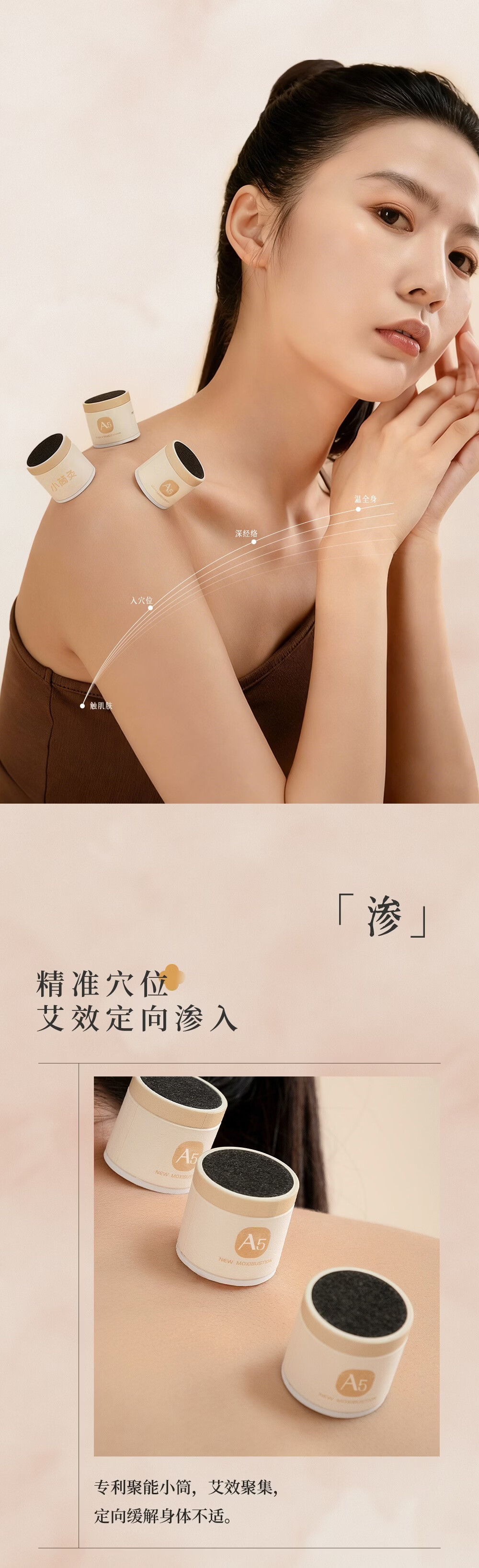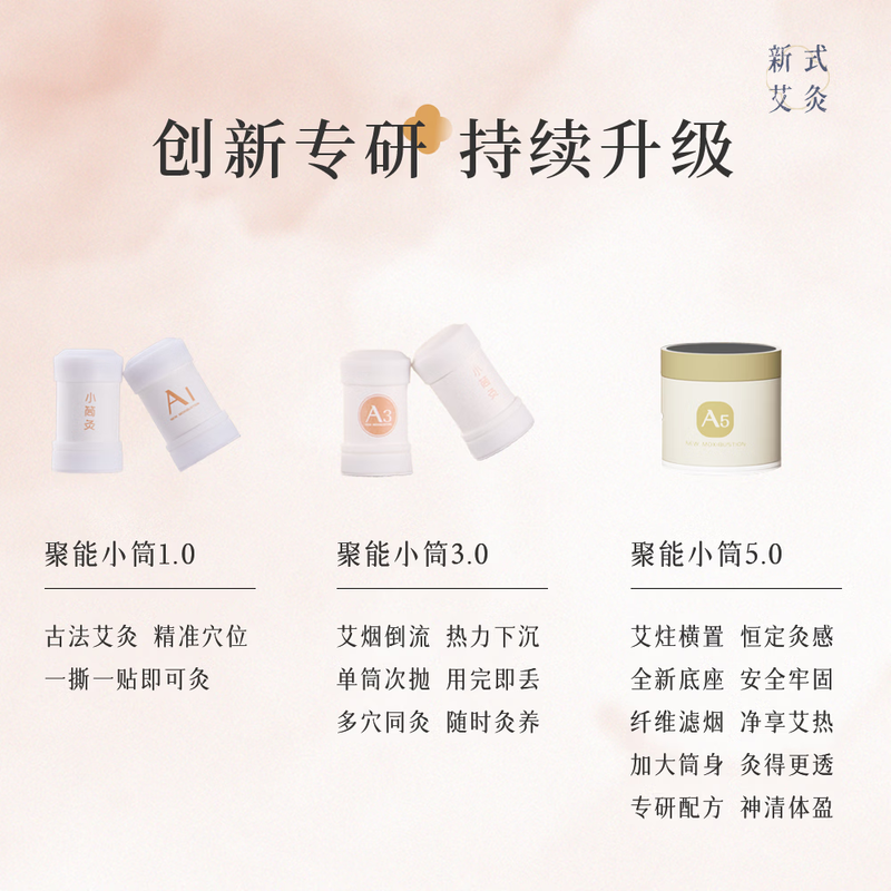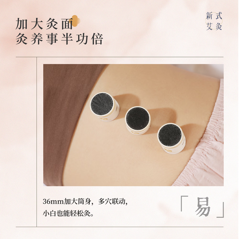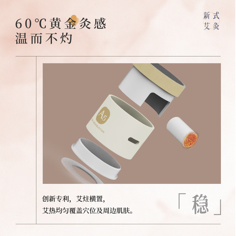 天然陈蕲艾,搭配艾叶,桂枝,茯苓,白术,花椒,干姜;搭配聚能筒设计,直径加大易定位,采用横置艾柱;可达约40分钟深度灸疗,产品搭配穴位图精准调理